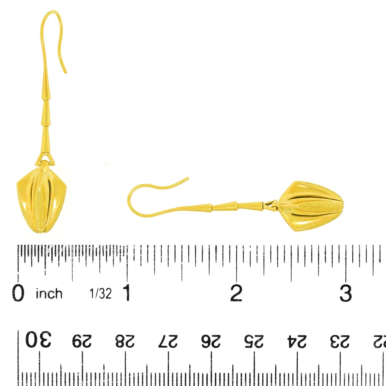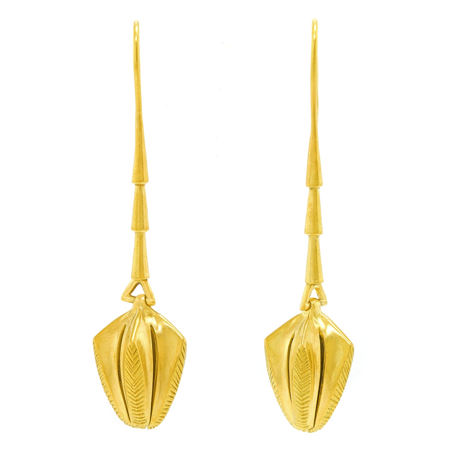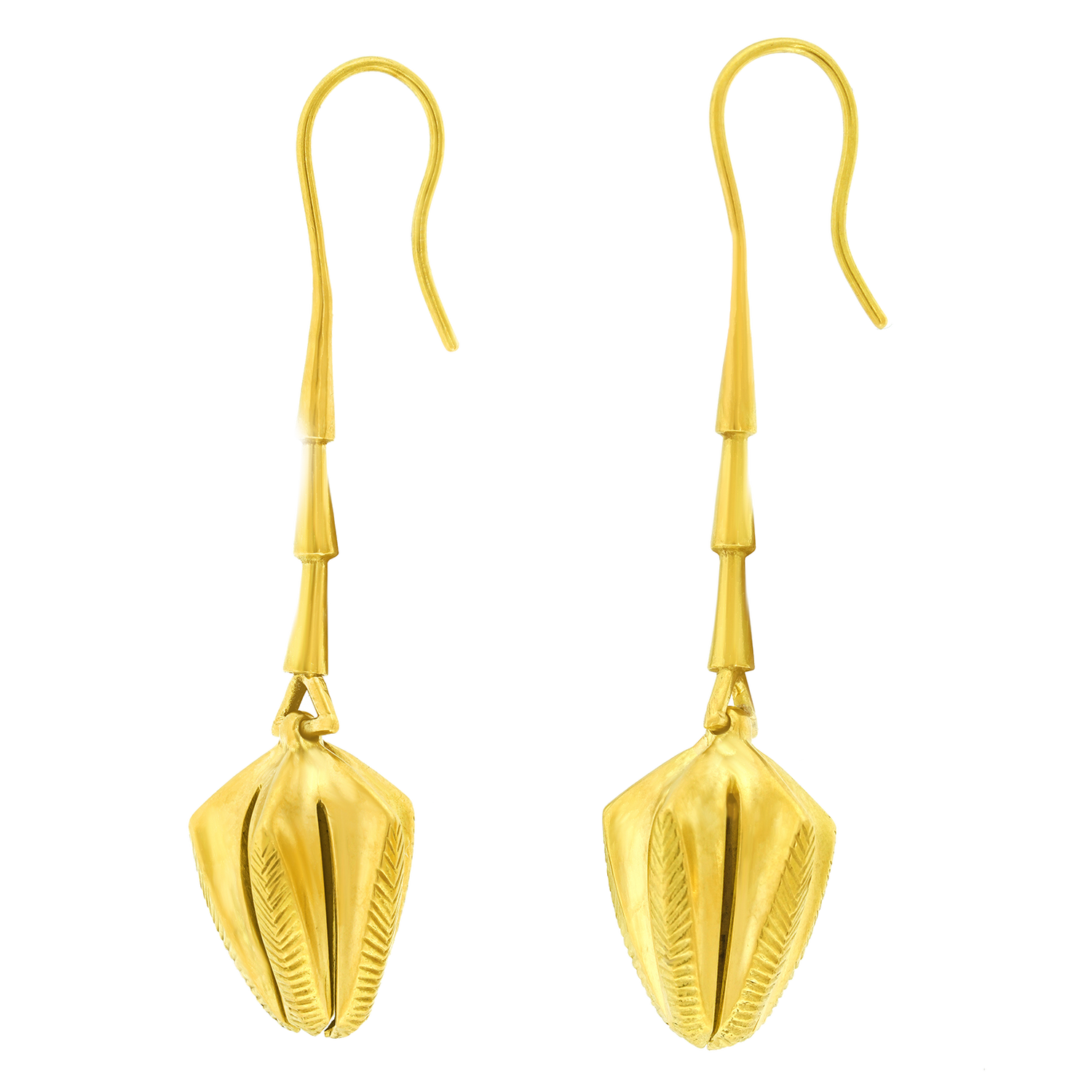 Circa 2000s, 18k, by Naomi Blumenthal, Berkshires, Massachusetts. Organic casual style is the look of these rich eighteen-karat gold earrings. Playful, gentle movement inspired by the natural world, they look and feel wonderful. Excellent condition. Noted: Called "Pentagon Nut Earrings'.