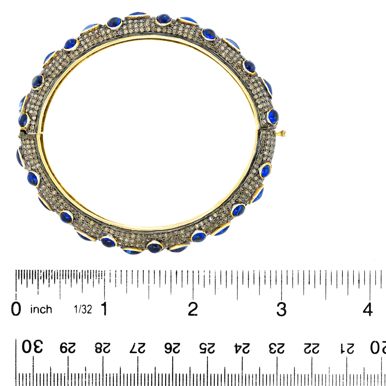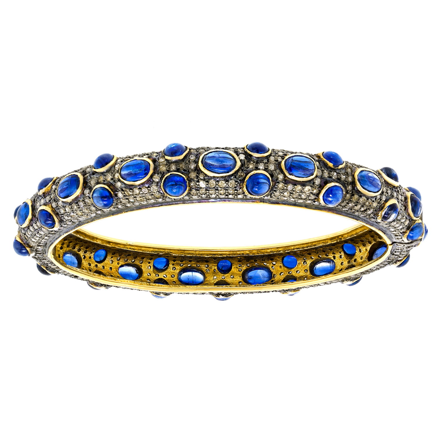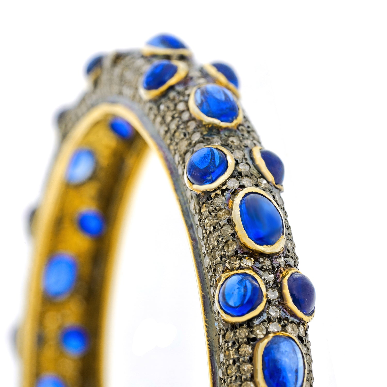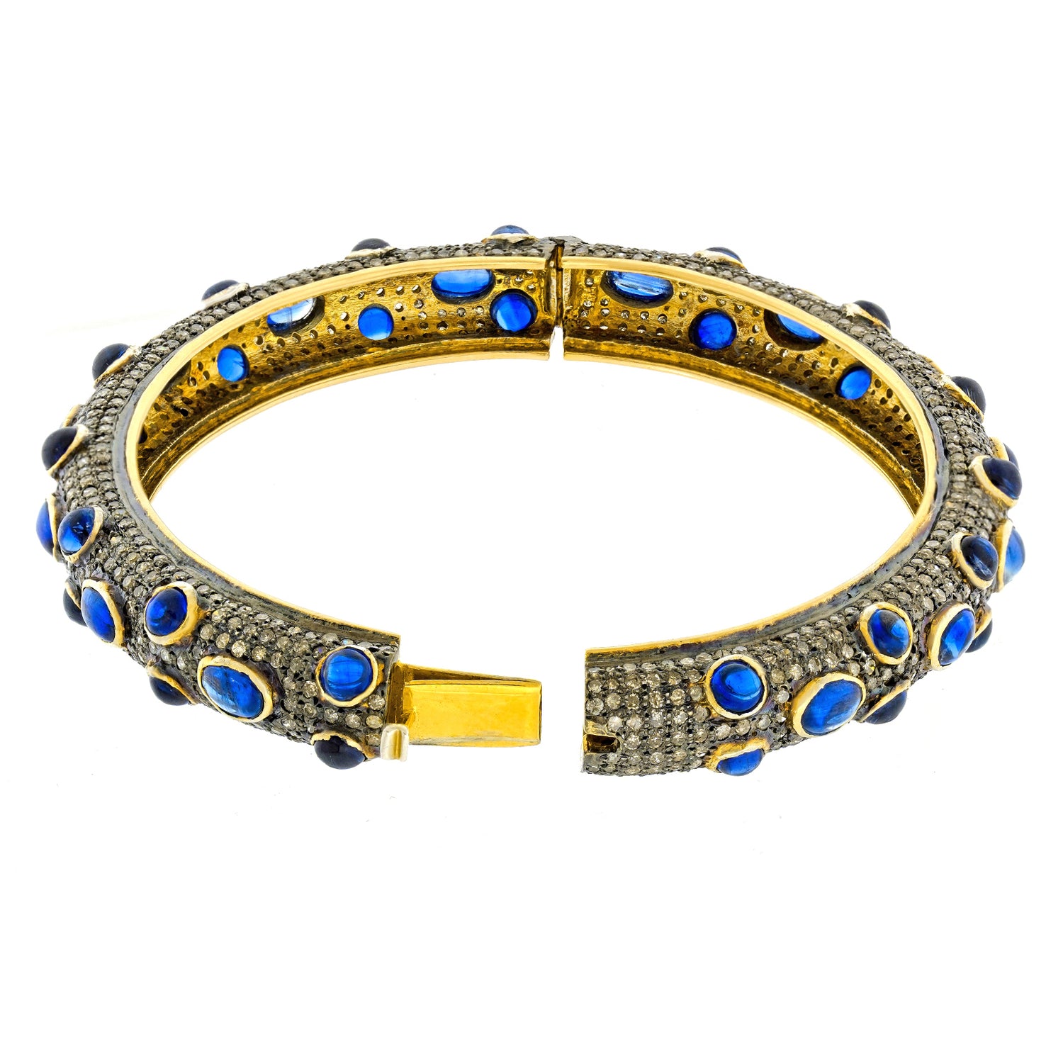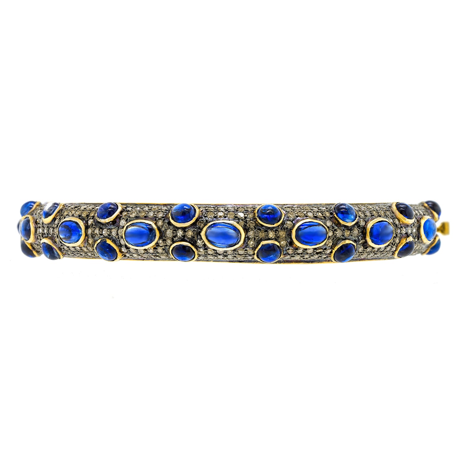 Circa 1980s, 14k with silver mountings, Mumbai, India. This bracelet is hippie chic at its sapphire and diamond best (10.0 carats total weight of sapphire and 8.0 carats total weight of diamonds). The look is Flower Child meets Boho! Mix it with other bangles, gold or silver, or wear it on its own. Excellent condition.