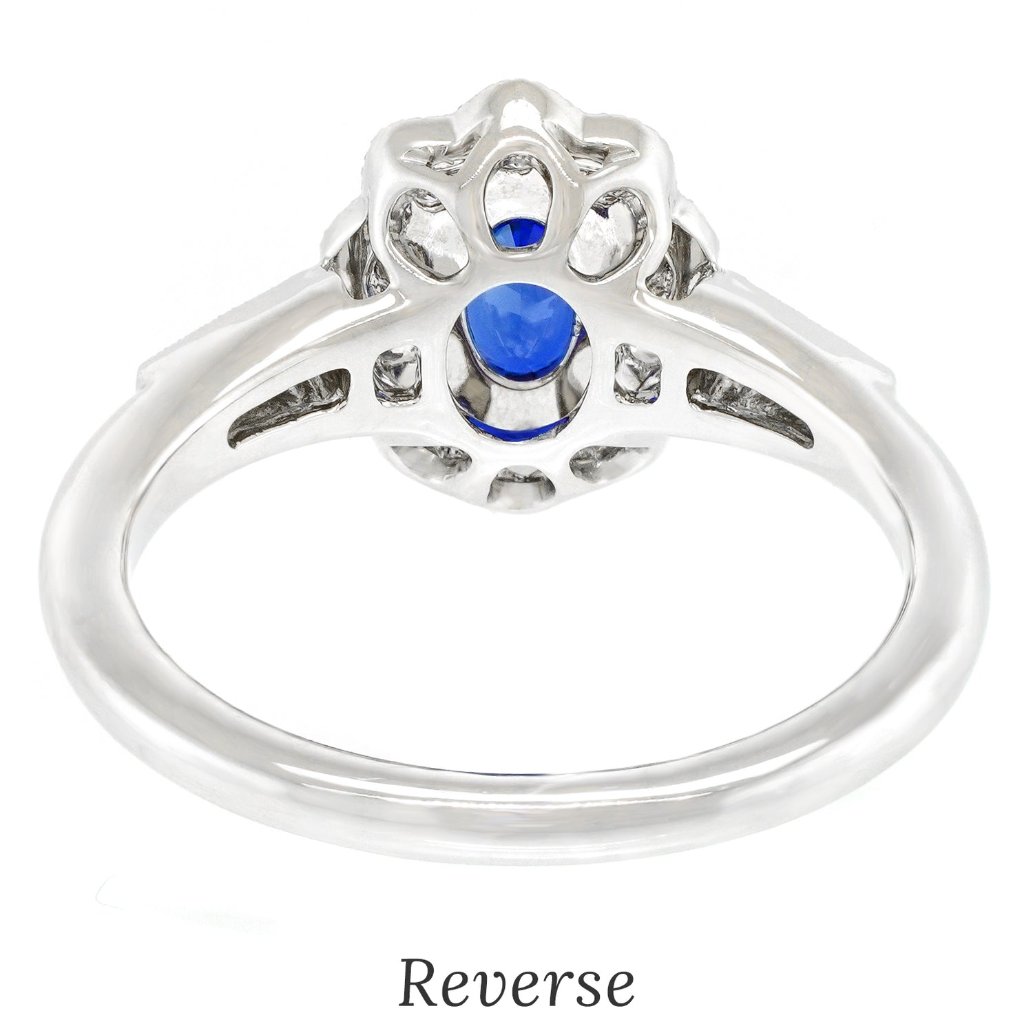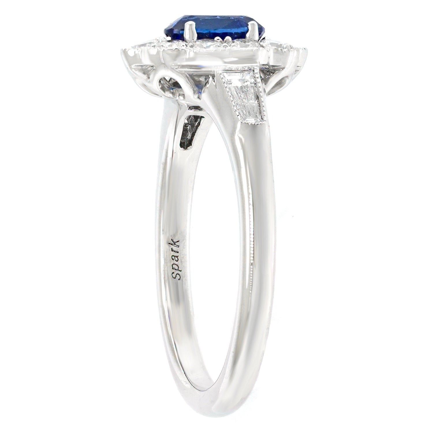 Circa 2000s, 18k, by Spark Creations, American. This ring features a fine cornflower blue .60 carat oval blue sapphire surrounded by .60 carats of fine white diamonds (G color, VS clarity). The timeless look is underscored by superb fabrication. Excellent condition.