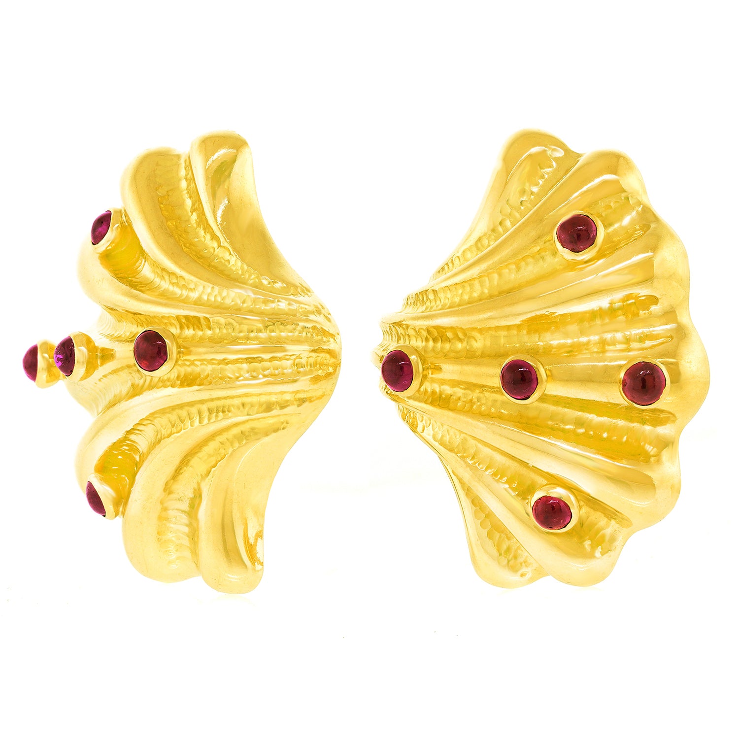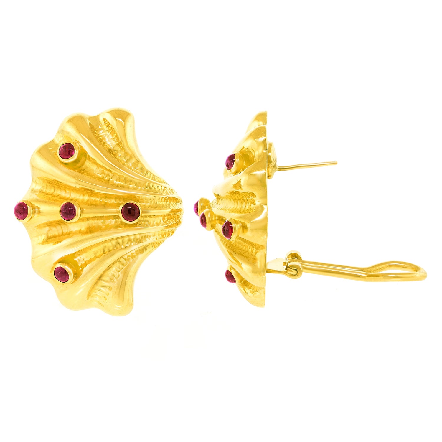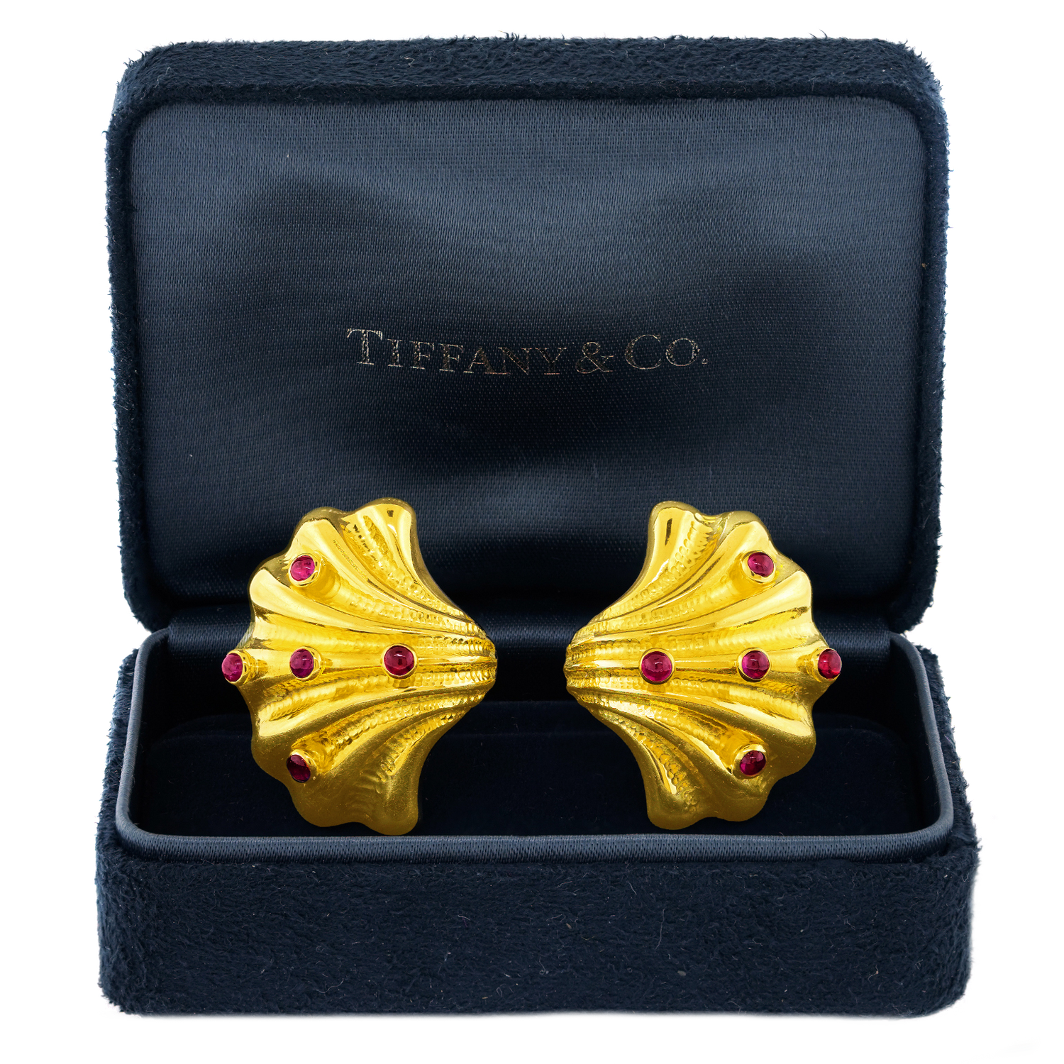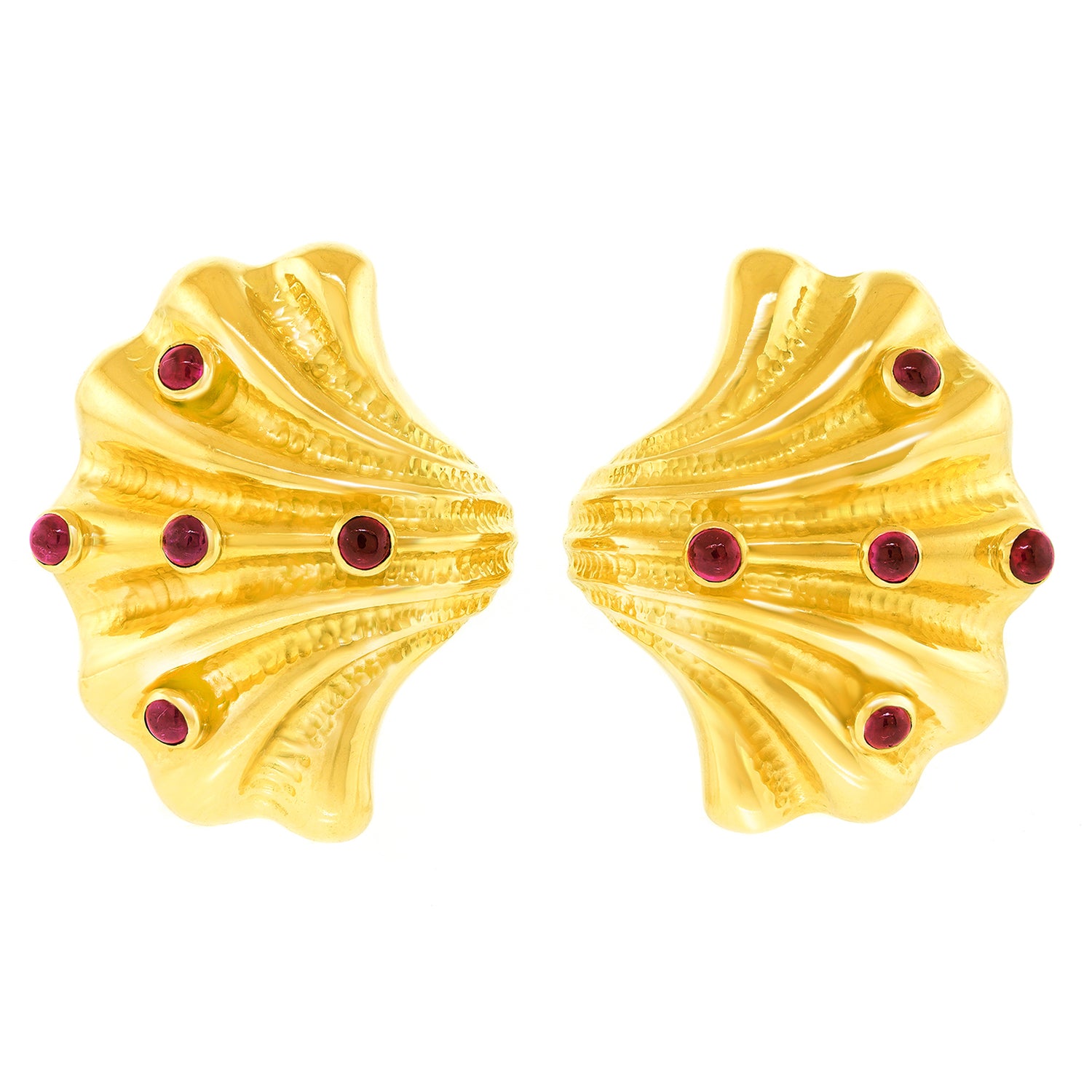 Circa 1990s, 18k, by Tiffany & Co., American. Finely made and well-designed, these delightful earrings from Tiffany & Co. are effortlessly stylish. Sea life motifs are one of their most popular themes dating back to the 1870s. The shell-form earrings bring those ideas into the late 20th century with a slightly abstracted yet familiar shell covered with ruby barnacles. Finely fabricated to the highest Tiffany standards, they are balanced and comfortable on the ear. Superb condition.