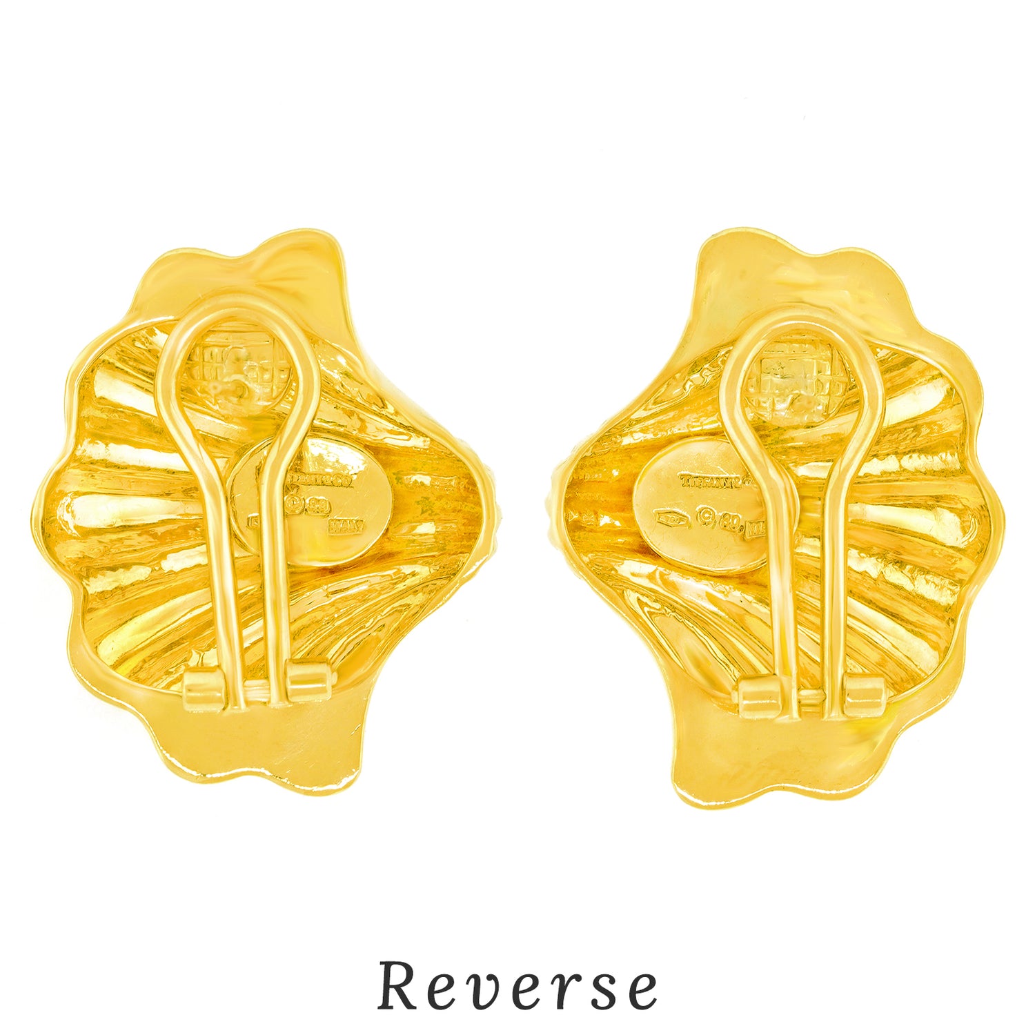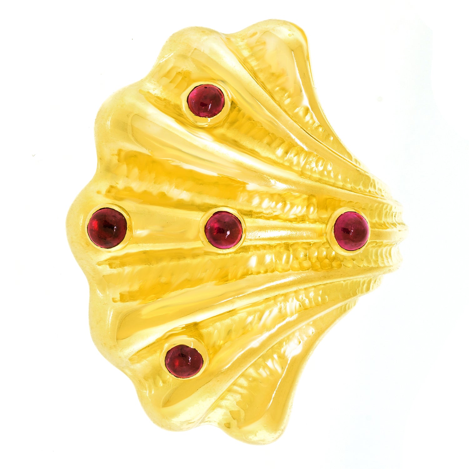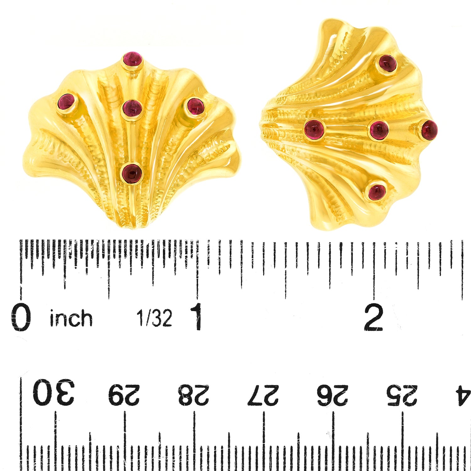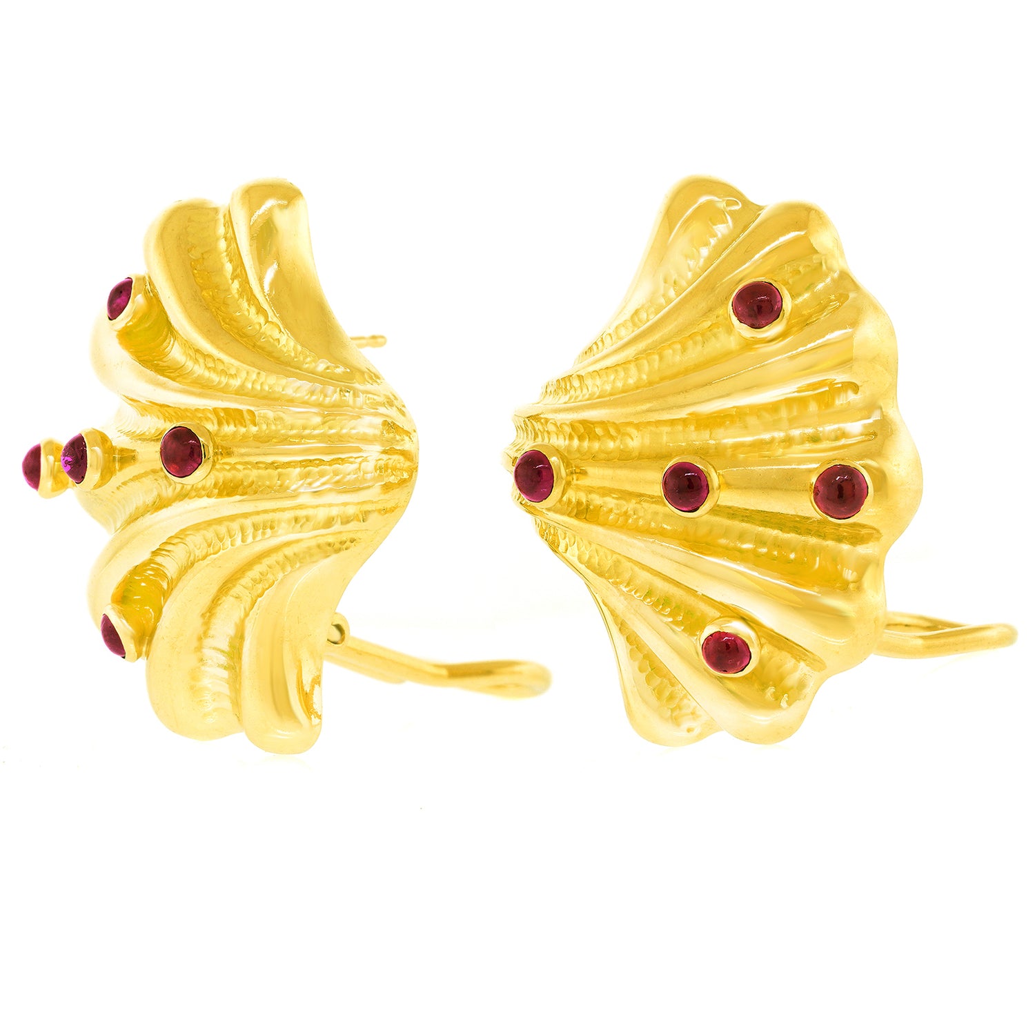 Circa 1990s, 18k, by Tiffany & Co., American. Finely made and well-designed, these delightful earrings from Tiffany & Co. are effortlessly stylish. Sea life motifs are one of their most popular themes dating back to the 1870s. The shell-form earrings bring those ideas into the late 20th century with a slightly abstracted yet familiar shell covered with ruby barnacles. Finely fabricated to the highest Tiffany standards, they are balanced and comfortable on the ear. Superb condition.