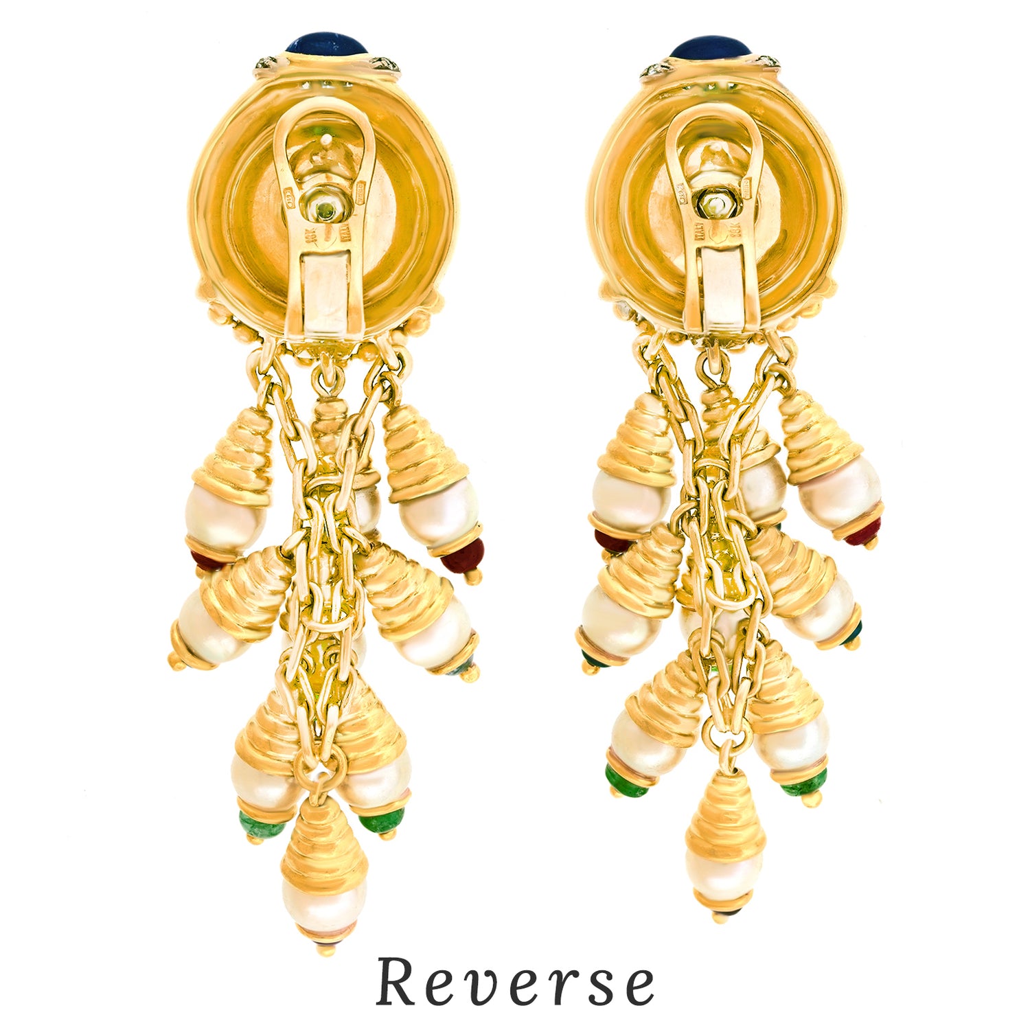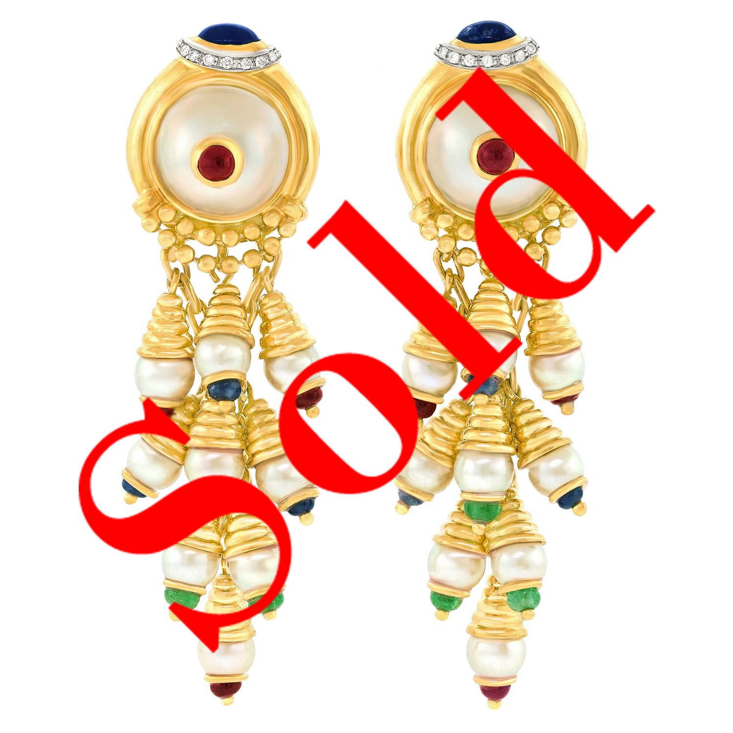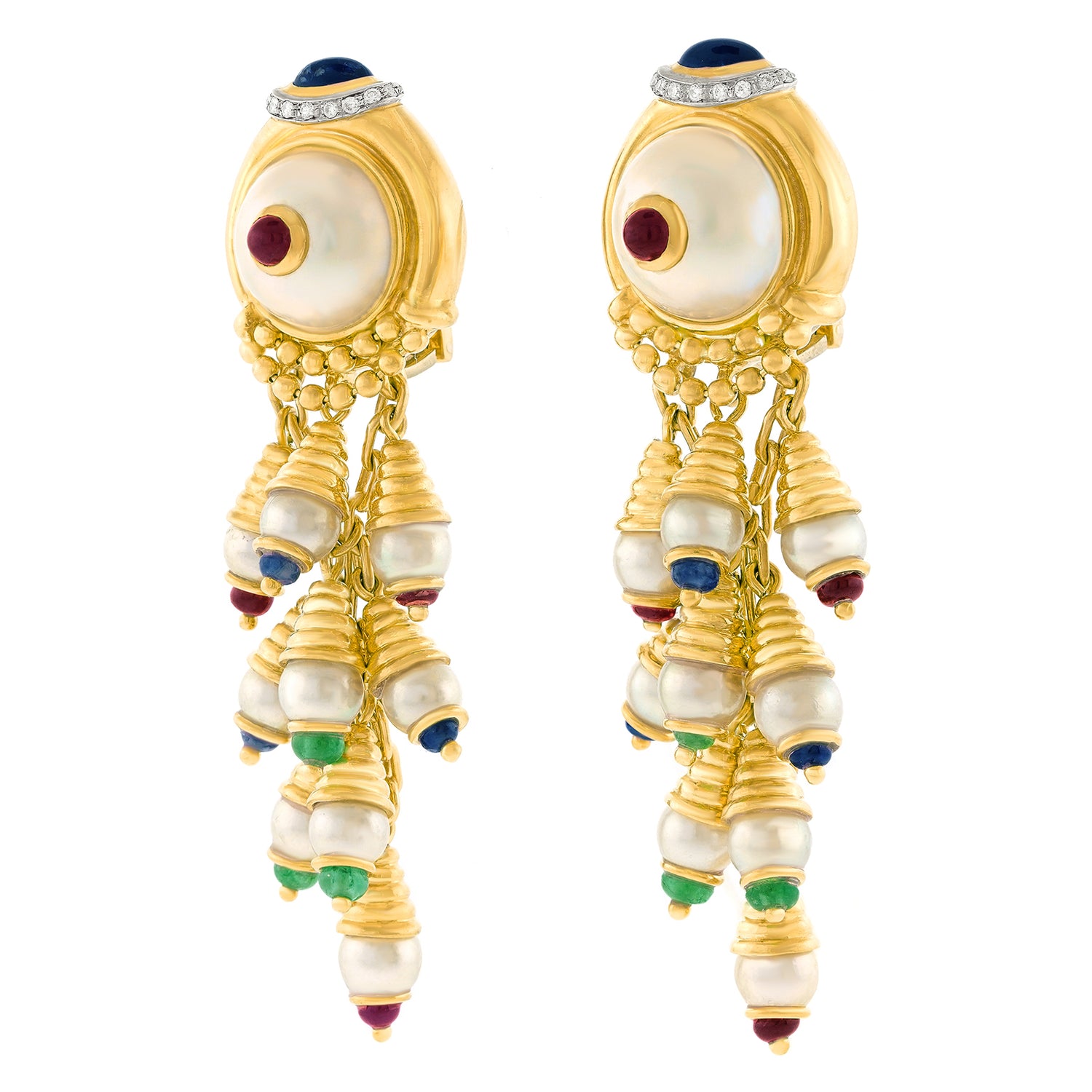 Circa 1960s, 18k, Italy. These earrings are all about flirty movement, color, and fun! Set with sapphires, rubies, emeralds, diamonds, and pearls, these eighteen-karat yellow gold earrings are so sixties! The look is over-the-top Italian… Poolside, Rome, Capri …Palm Beach. Beautifully made, they are in excellent condition.
