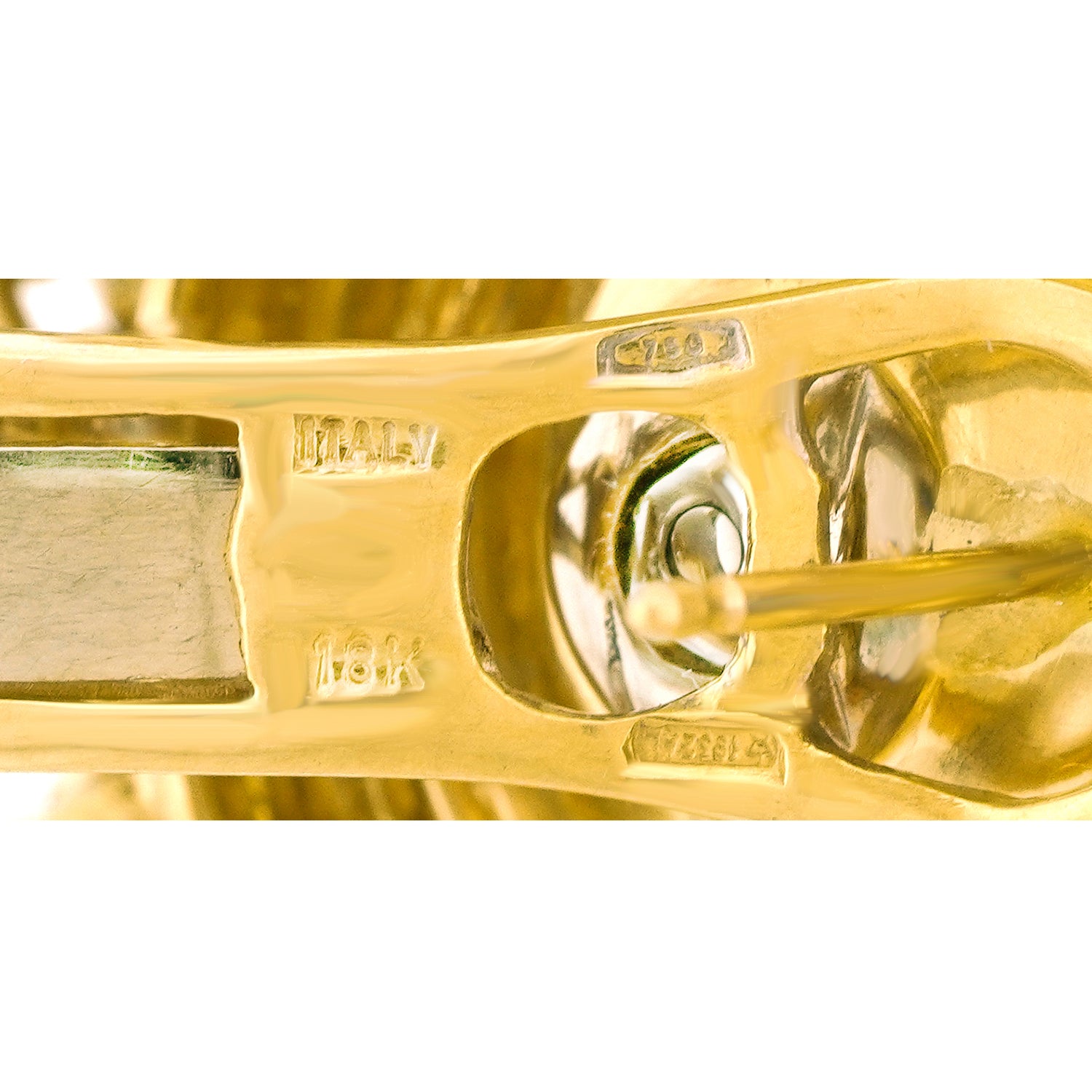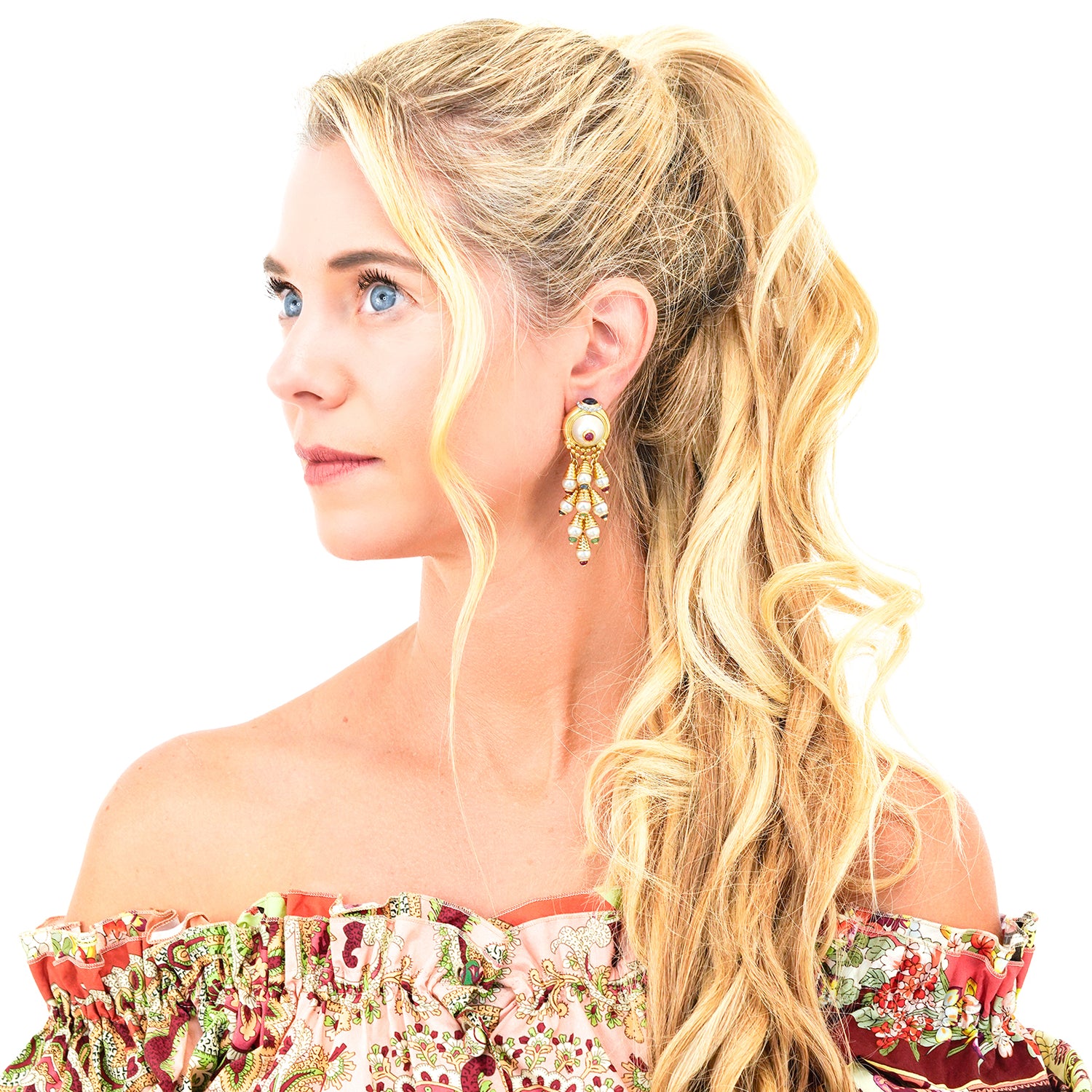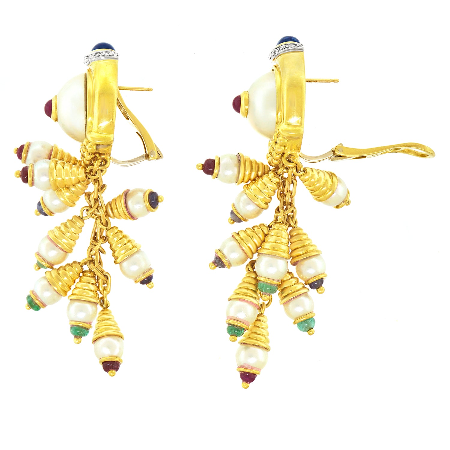Circa 1960s, 18k, Italy. These earrings are all about flirty movement, color, and fun! Set with sapphires, rubies, emeralds, diamonds, and pearls, these eighteen-karat yellow gold earrings are so sixties! The look is over-the-top Italian… Poolside, Rome, Capri …Palm Beach. Beautifully made, they are in excellent condition.