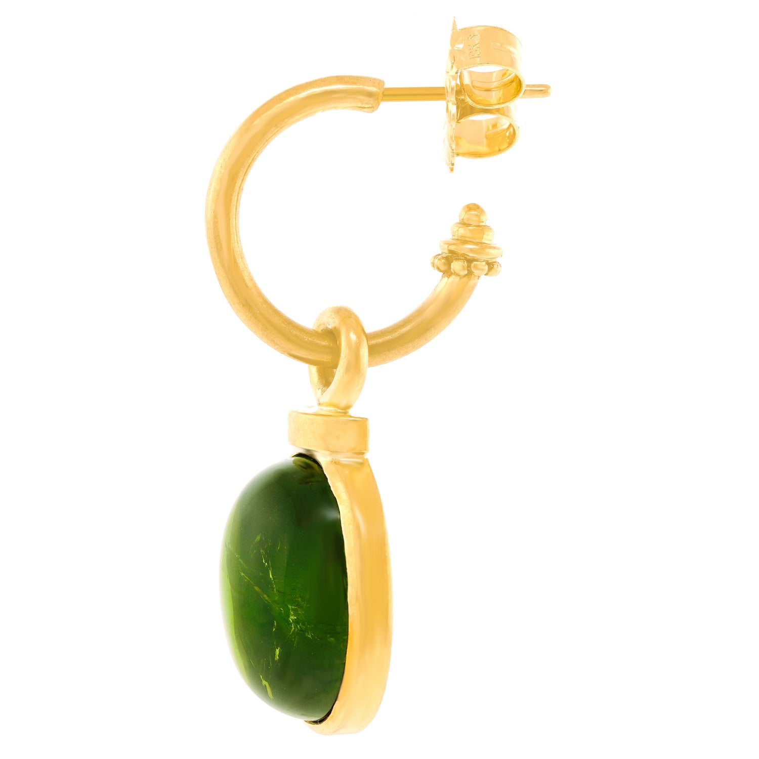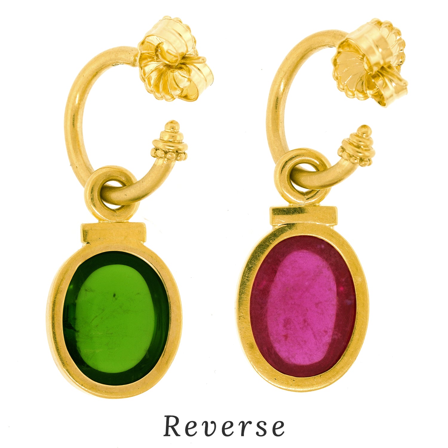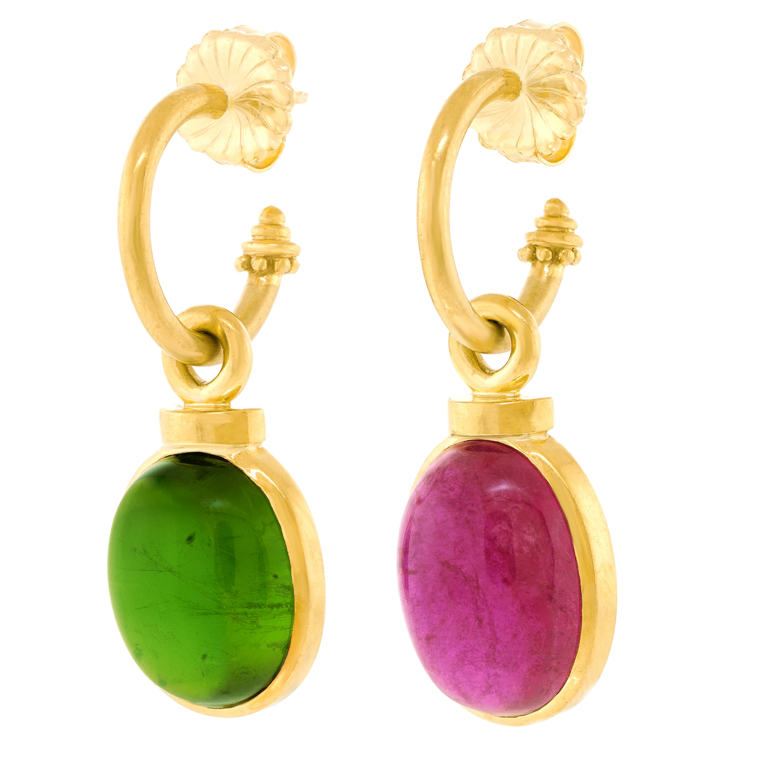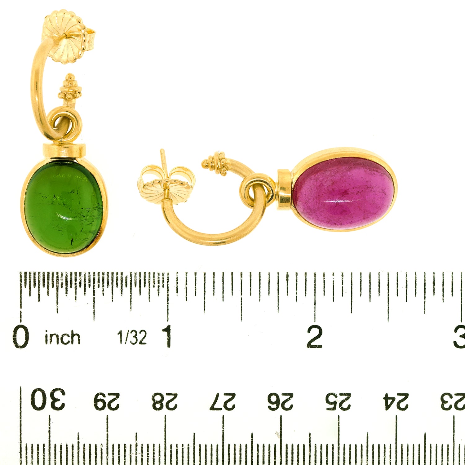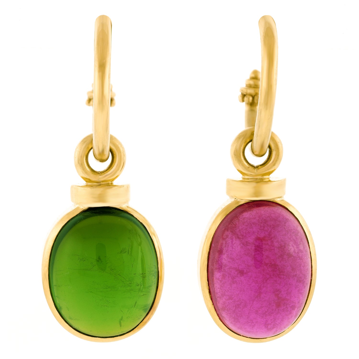Circa 1970s, 18k, American. These earrings feature lush pink and green tourmaline cabochons. Beautifully made in eighteen-karat yellow gold, the look is playfully elegant. Excellent condition.