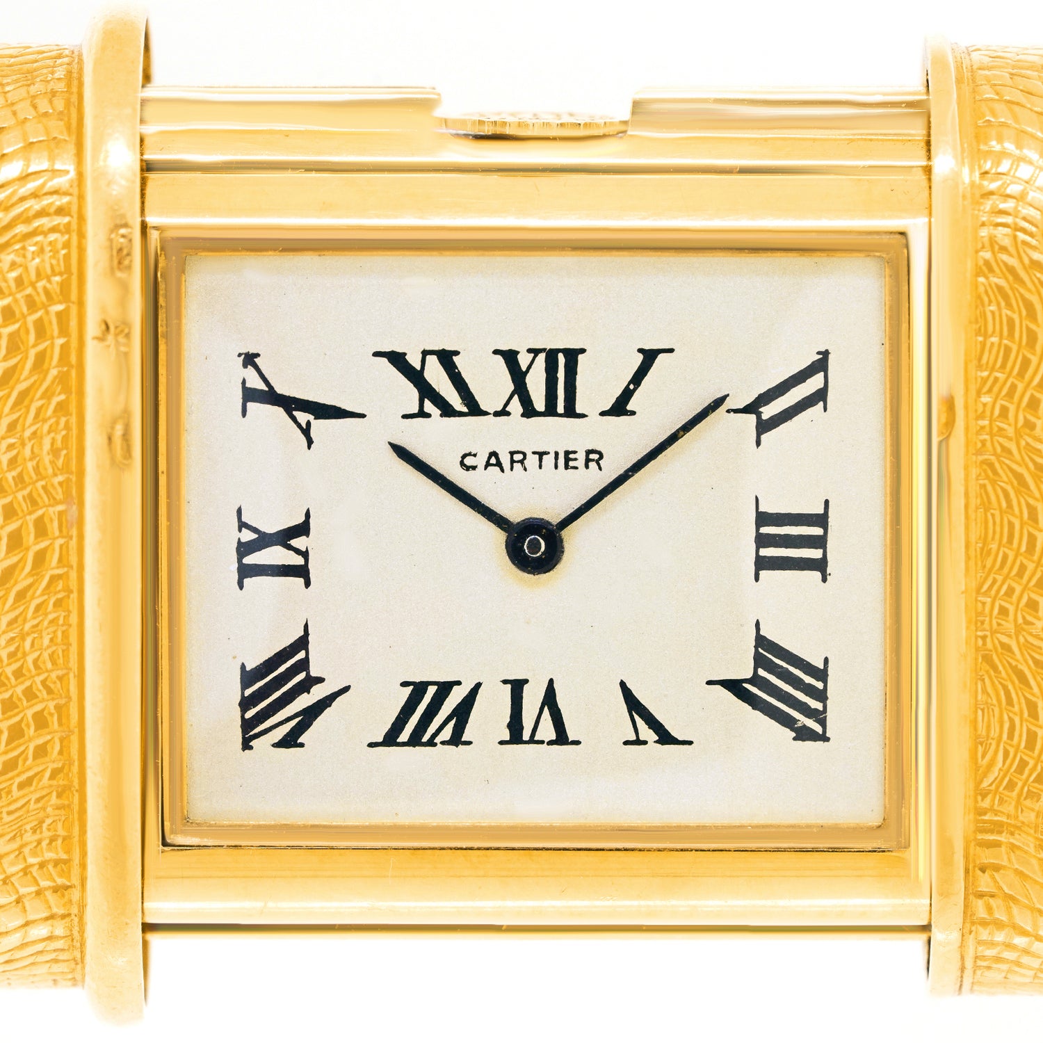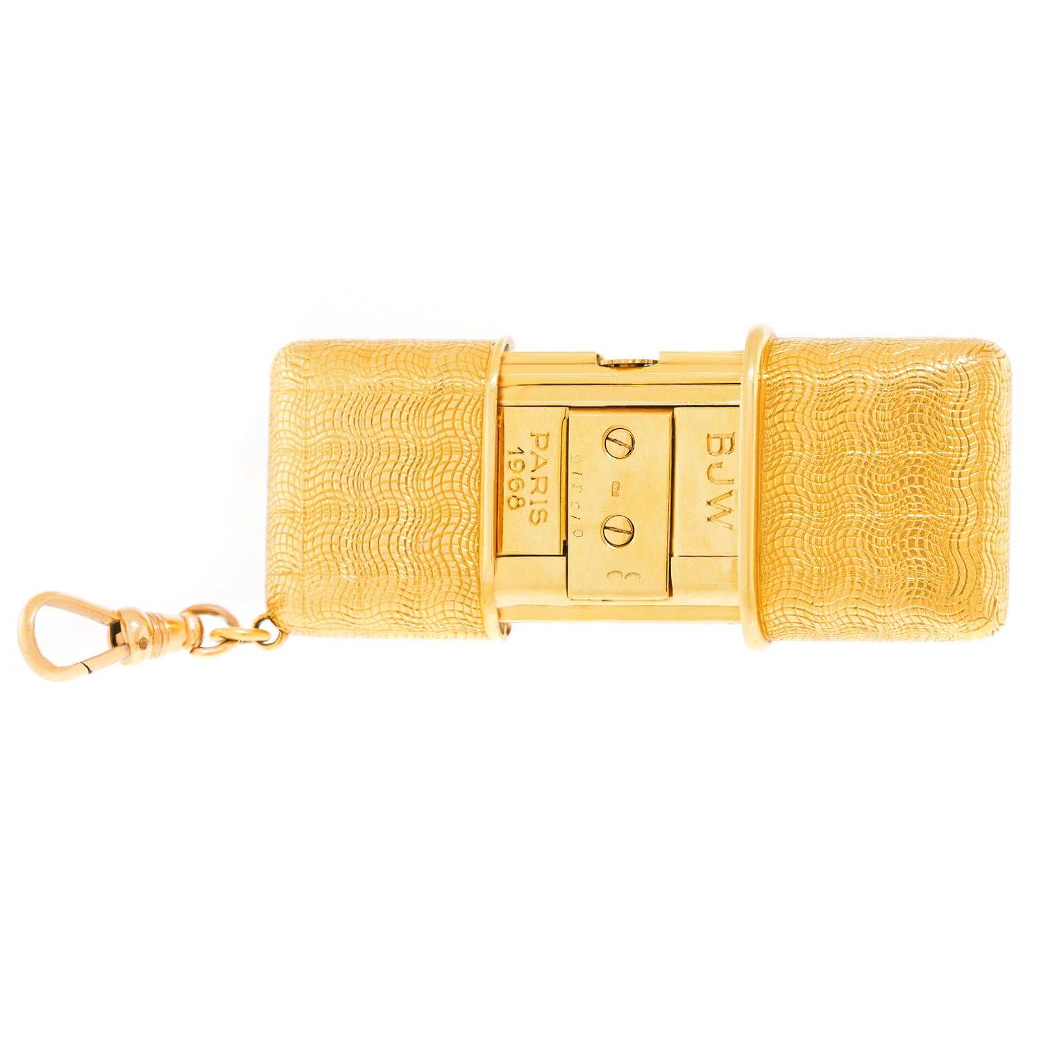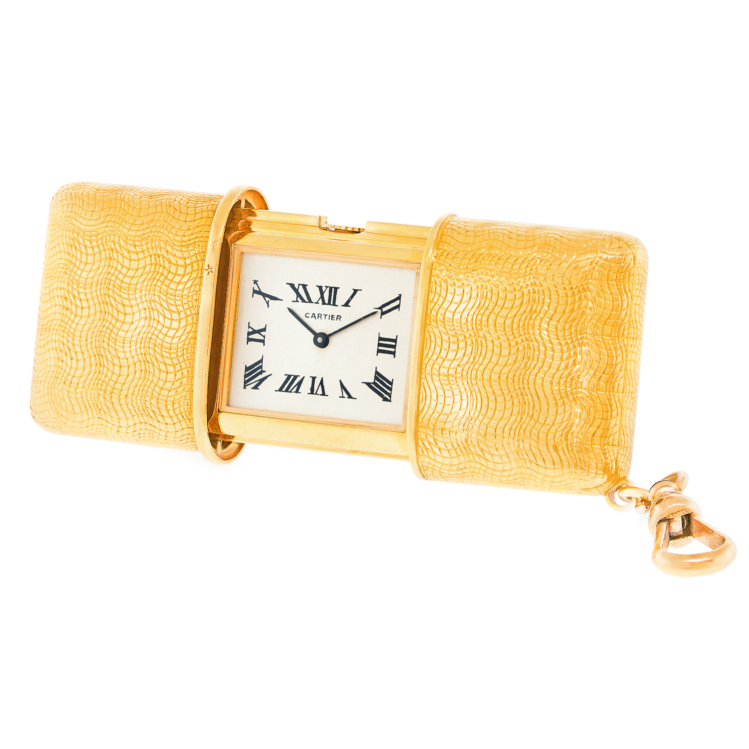 Circa 1950s, 18k, by Cartier, France. A women's purse can hold many secrets, but who expects a solid gold Cartier time piece! An ultimate expression of luxury, this one winds itself when opening and closing the cover. Recently serviced, it is in excellent condition.