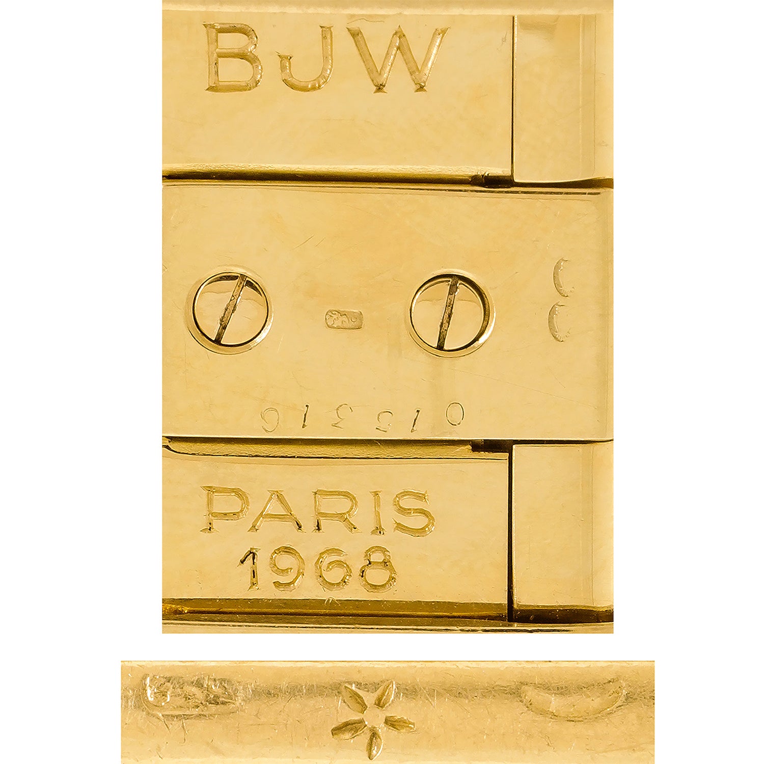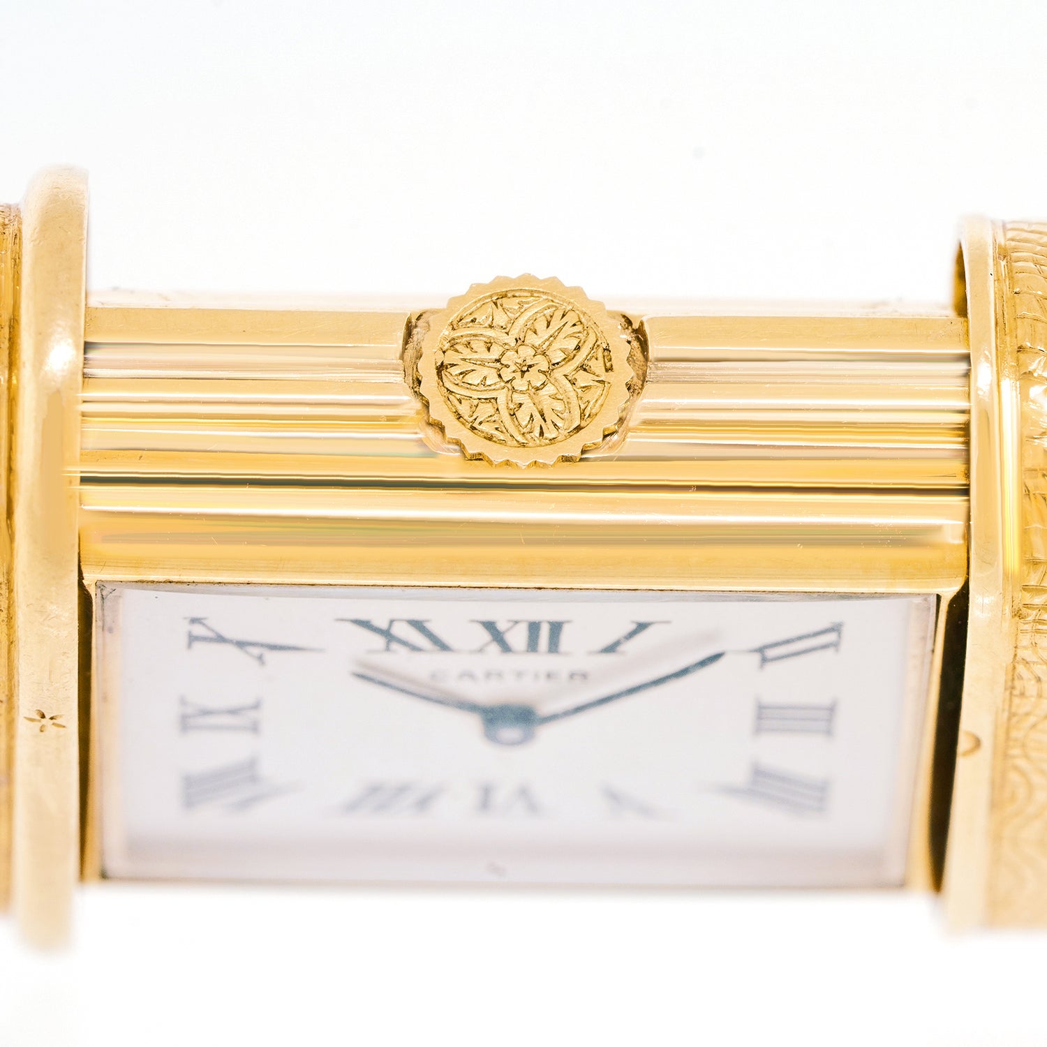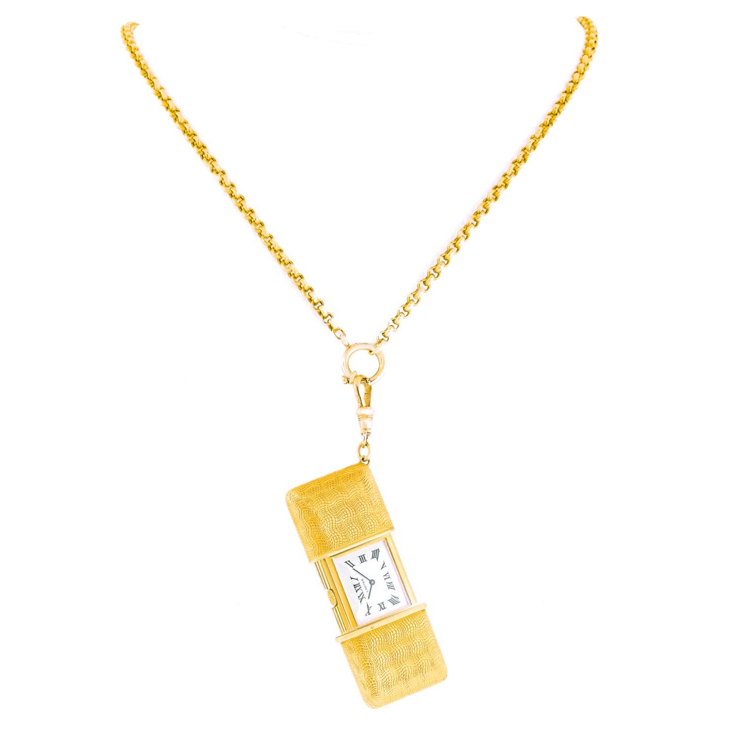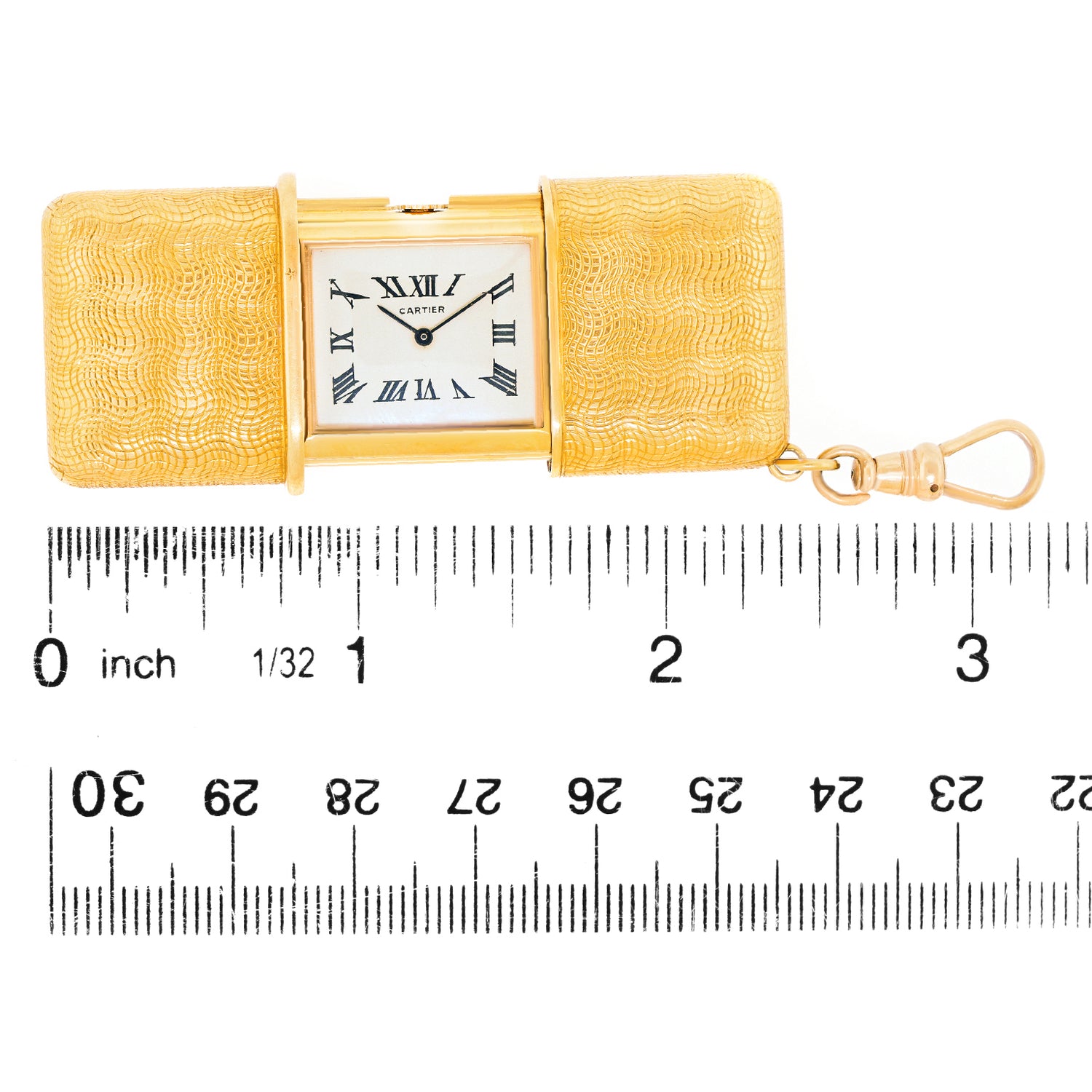 Circa 1950s, 18k, by Cartier, France. A women's purse can hold many secrets, but who expects a solid gold Cartier time piece! An ultimate expression of luxury, this one winds itself when opening and closing the cover. Recently serviced, it is in excellent condition.
