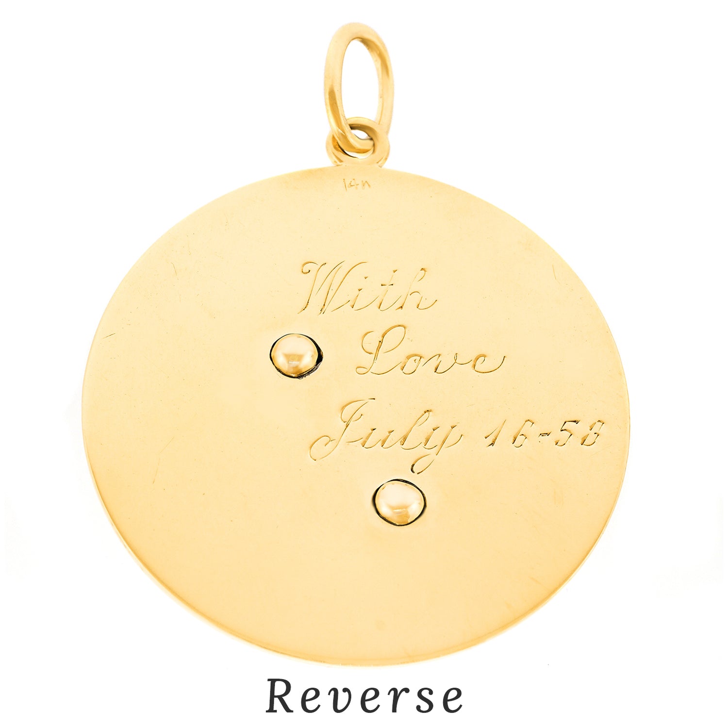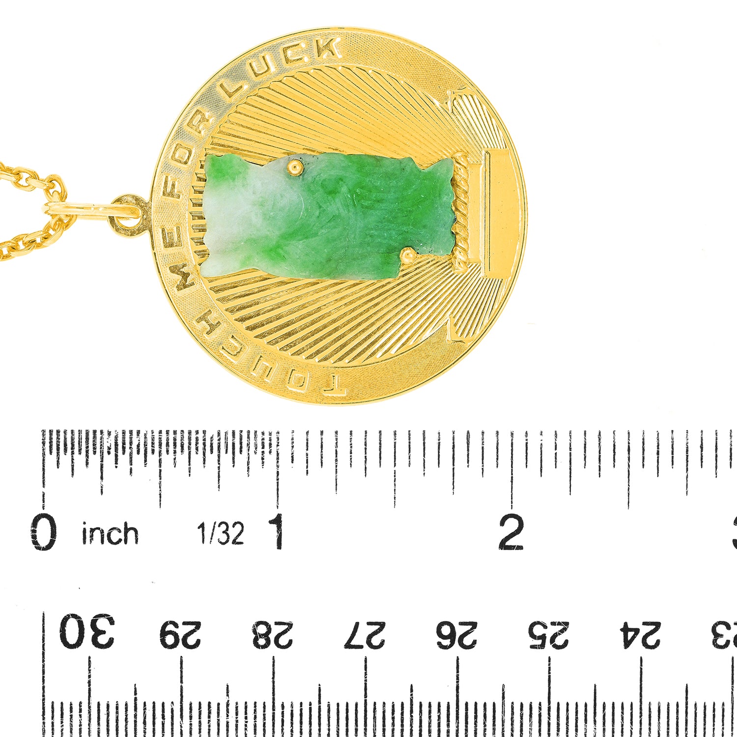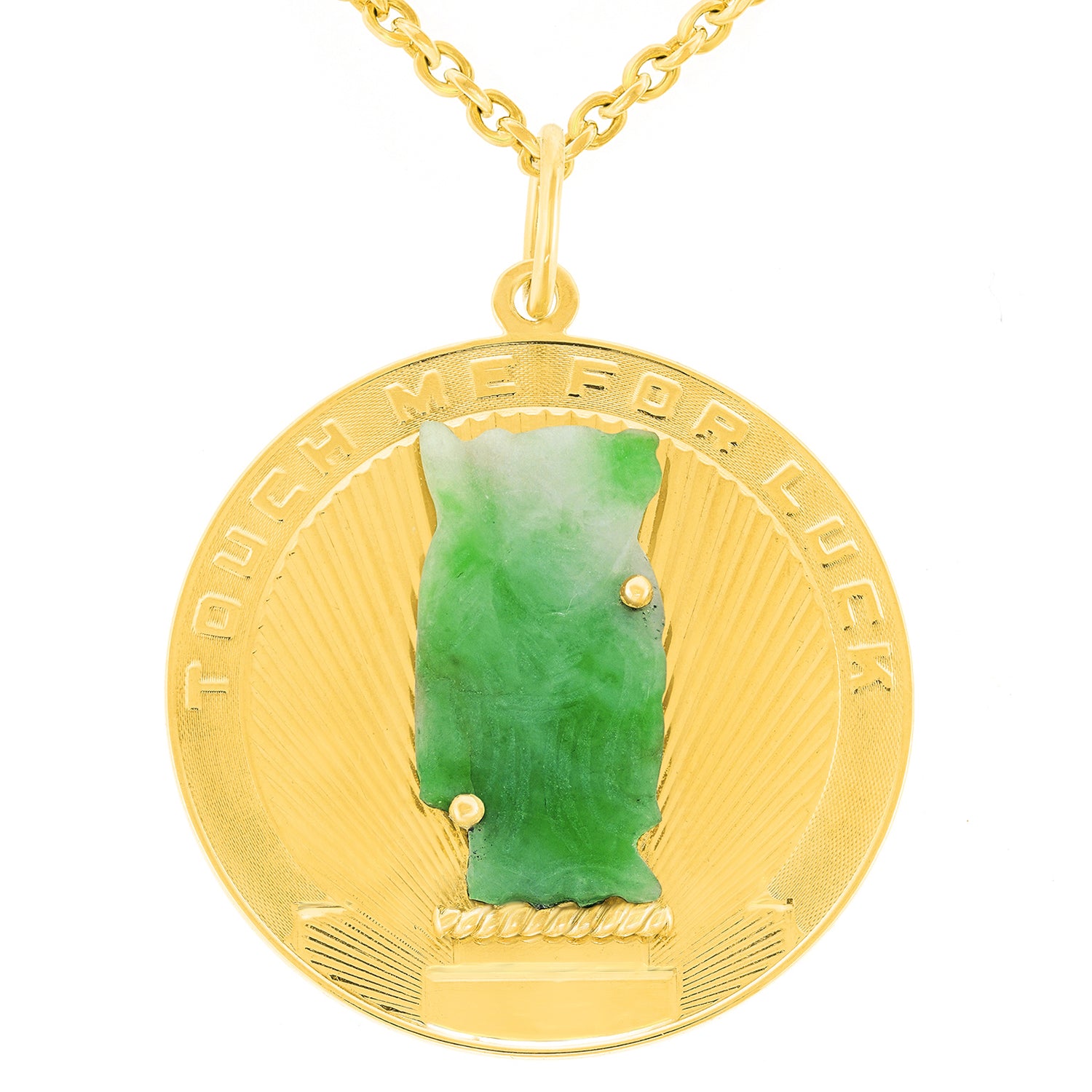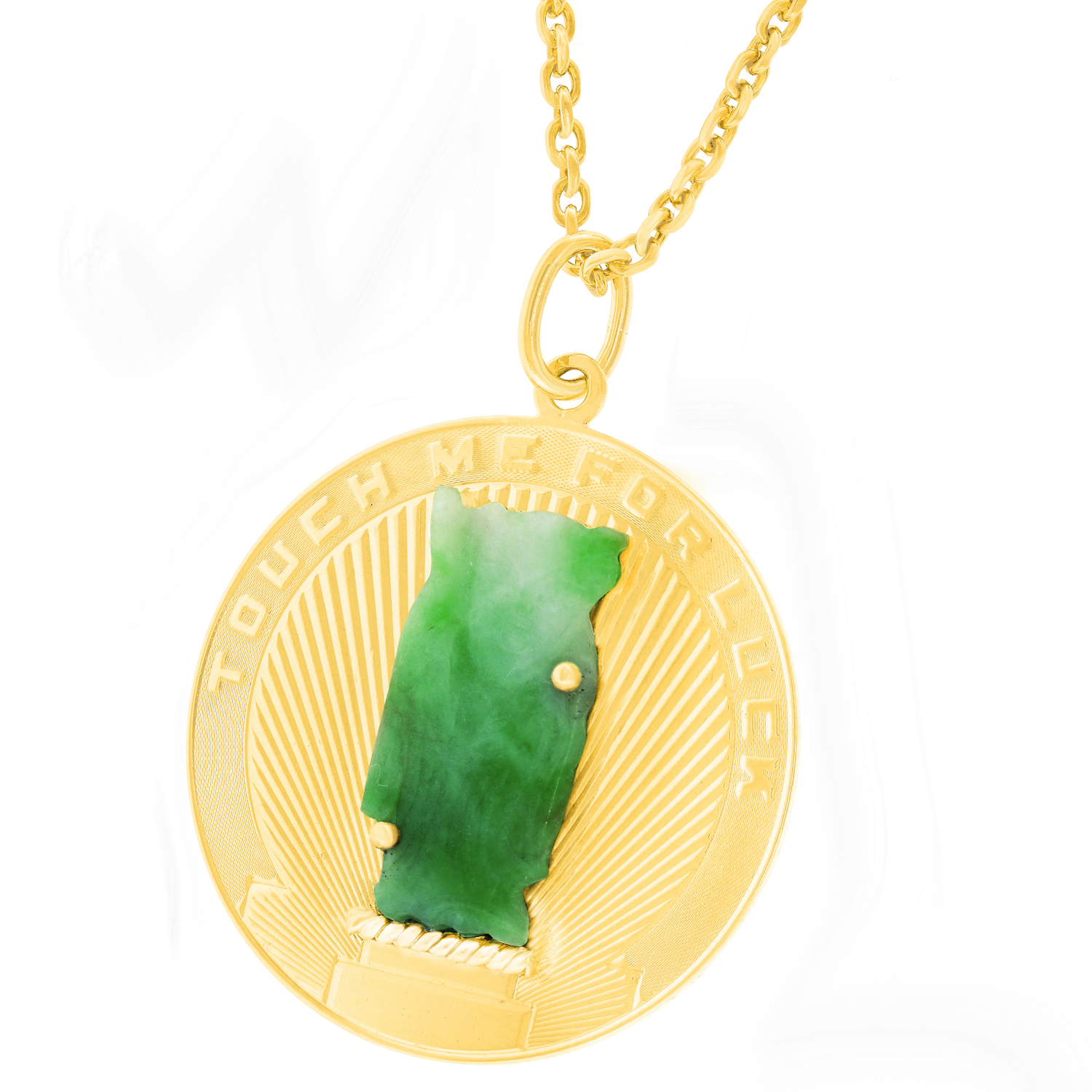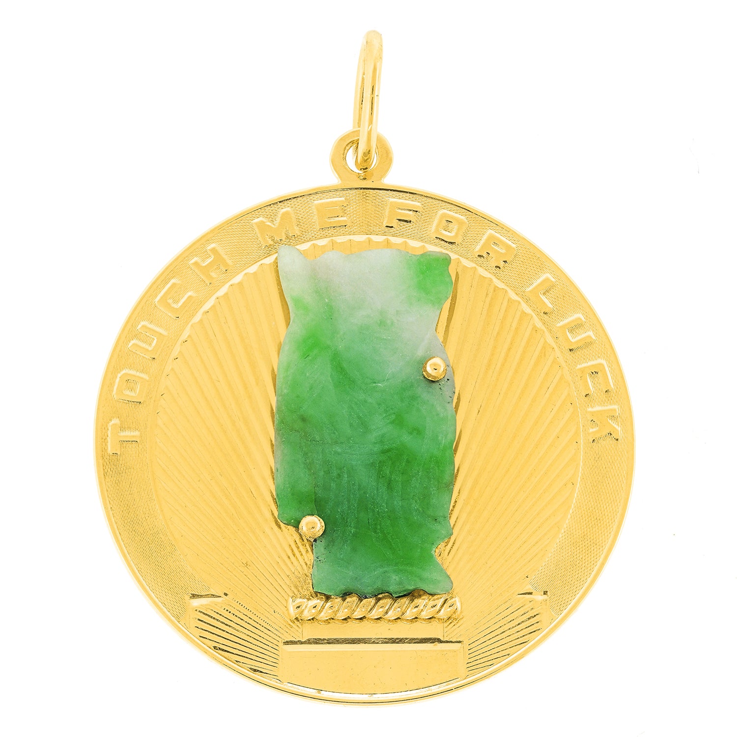 Circa 1958, 14k, American. This charming fifties pendant says “Touch Me For Luck". Beautifully made and set with a jade figure, it is heavy and in excellent condition. Noted; in China, jade is good Joss or "lucky in Life." Joss is also the figure of the Deity, -- with this pendant, you have both! Excellent condition.
