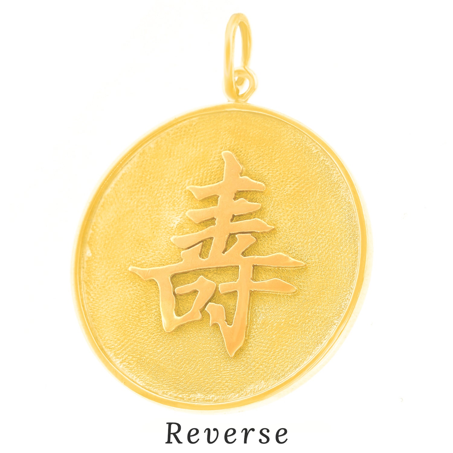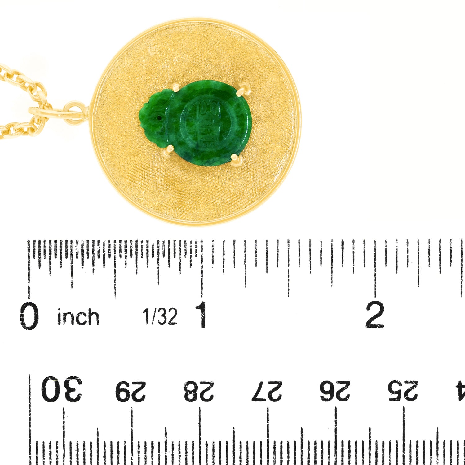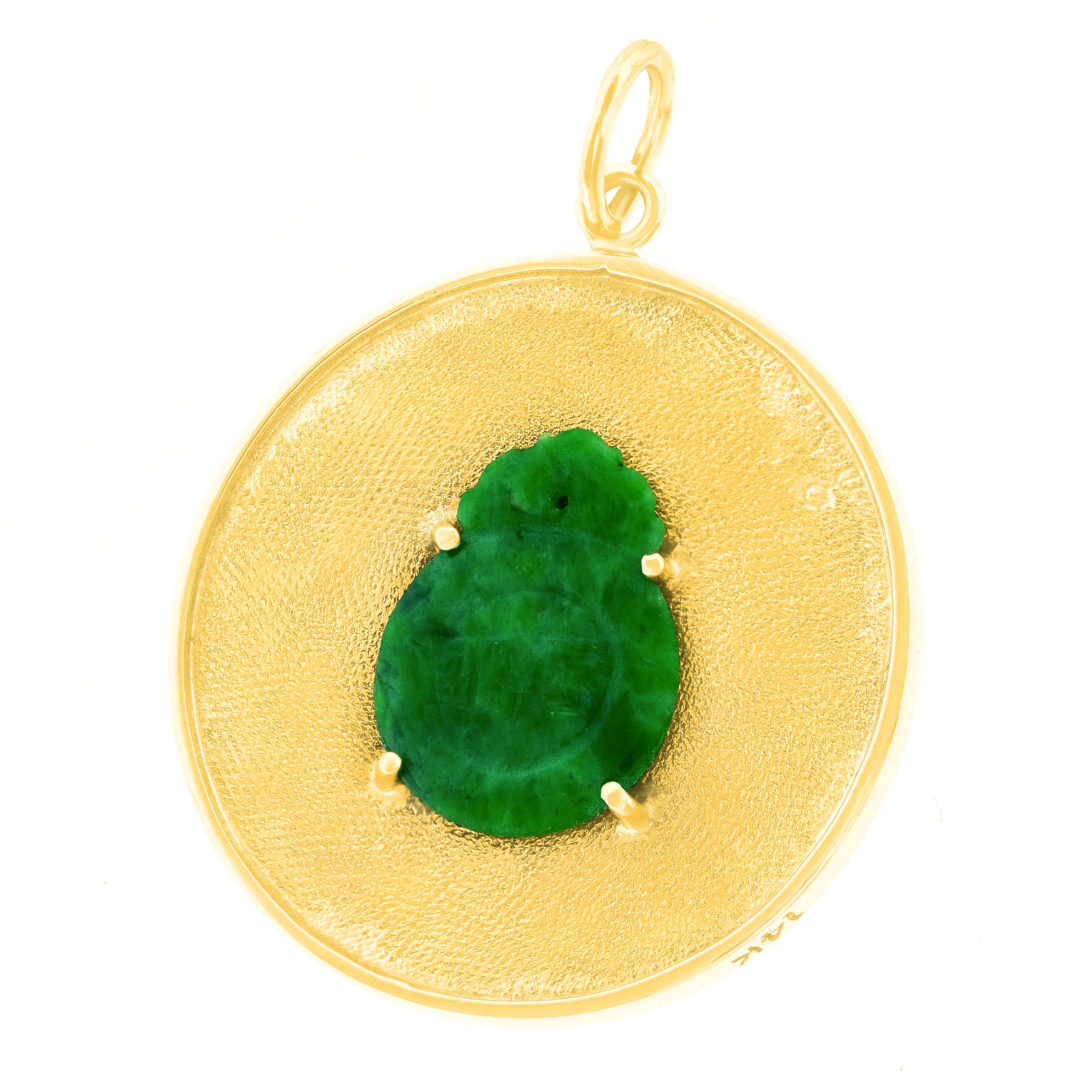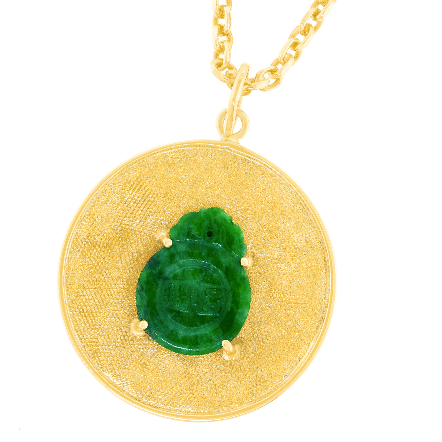 Circa 1950s, 14k, American. This fabulous fifties pendant features a carved jade set on one side and the Chinese character for life. Jade is good Joss … a good life and good luck. Finely fabricated in fourteen-karat yellow gold, this pendant is perfect on its own or layered in a multiples look. Excellent condition.