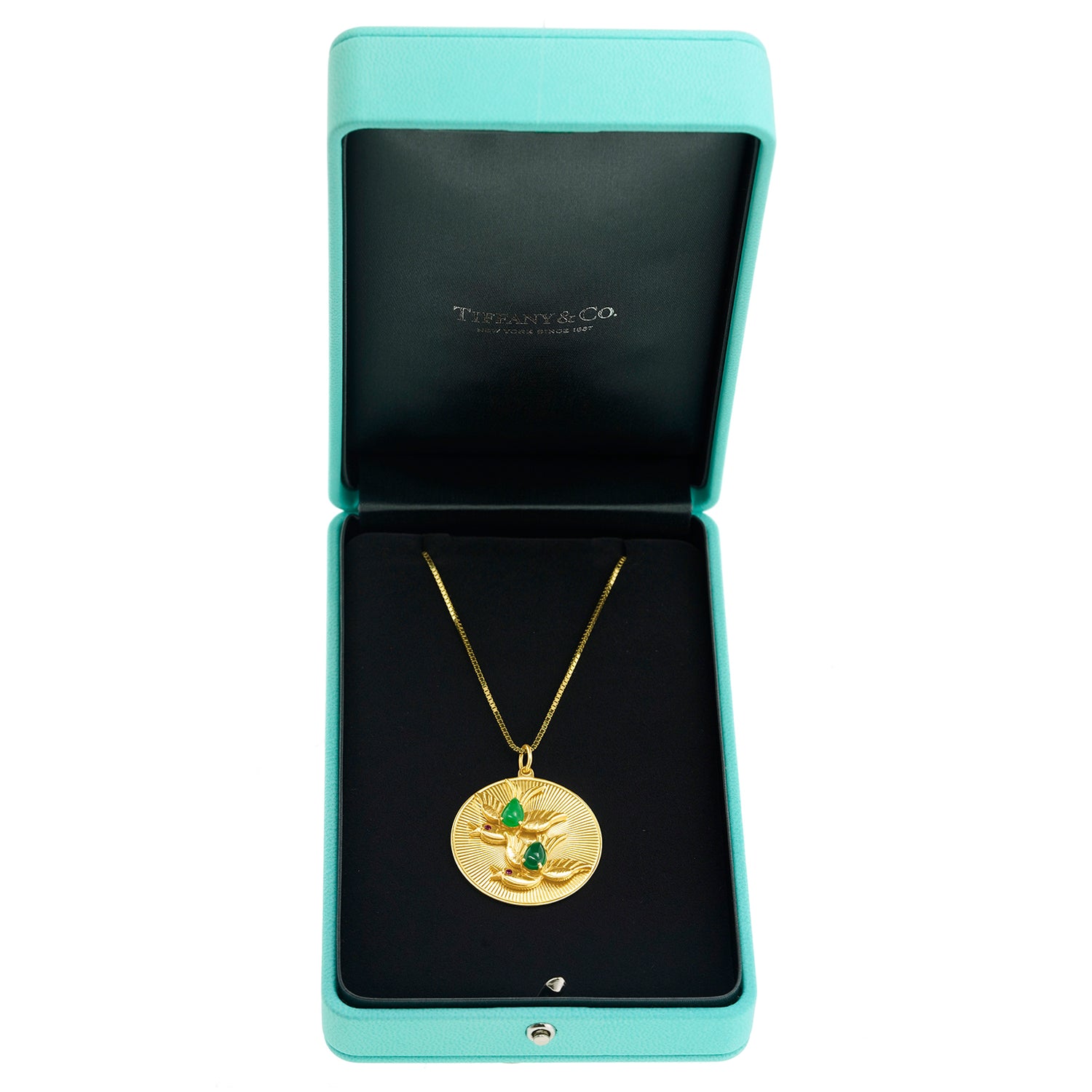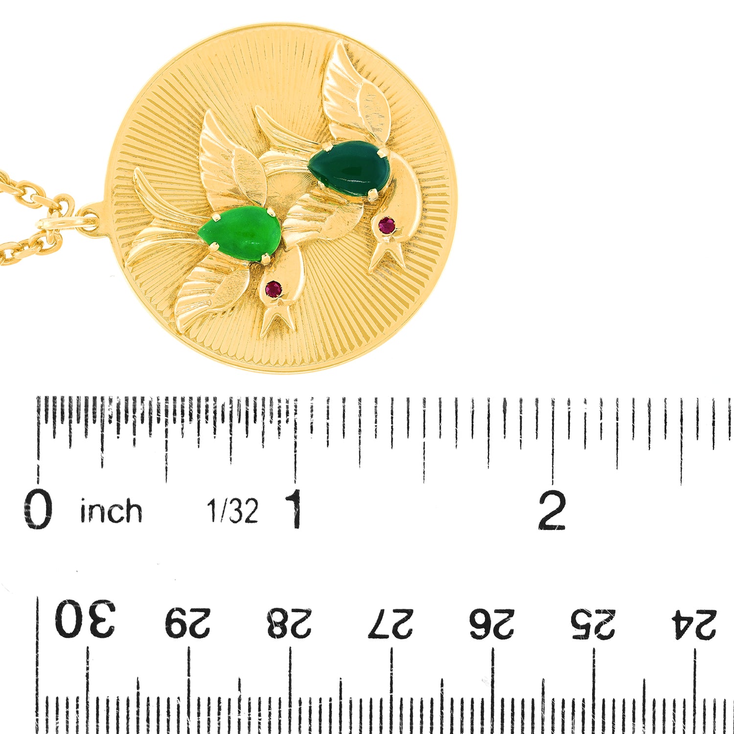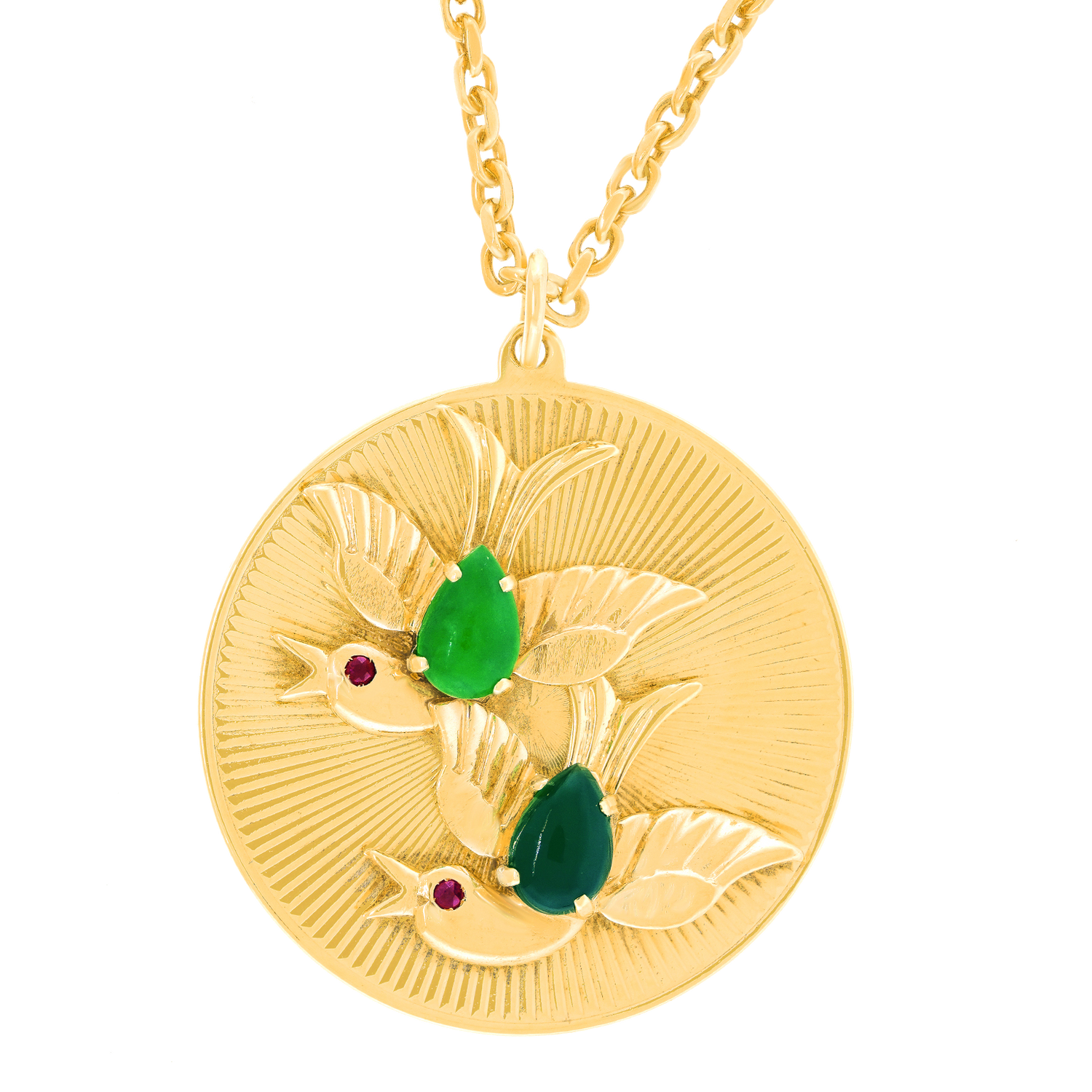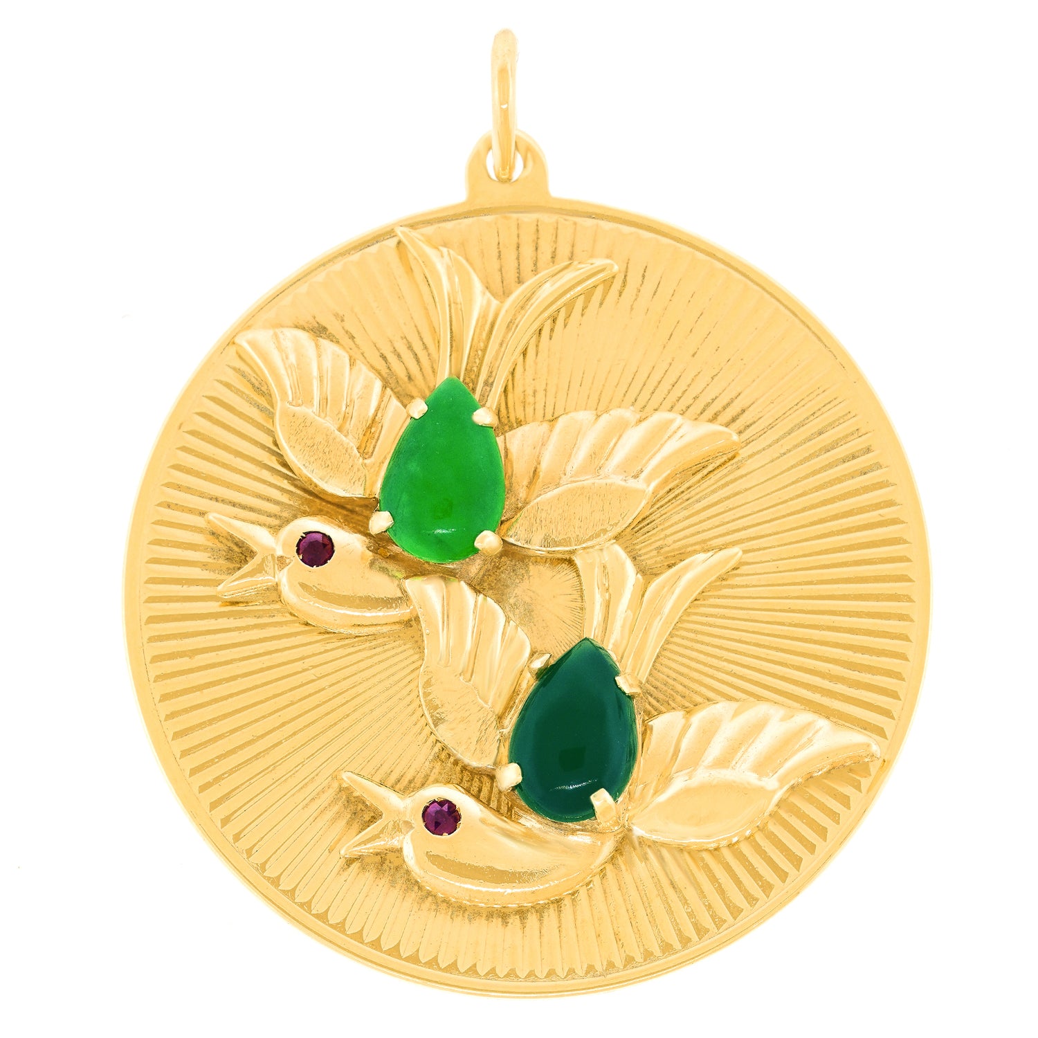 Circa 1950s, 14k, by Tiffany & Co., New York. Tiffany & Co. at its charming and romantic vintage best! Love birds in flight tell a story of lifelong partnership. Set with green jade and rich red rubies, this pendant is perfect on its own or great as part of a multiples look. Timelessly Tiffany, it is as delightful today as it was sooo…chic seventy years ago! Excellent condition.