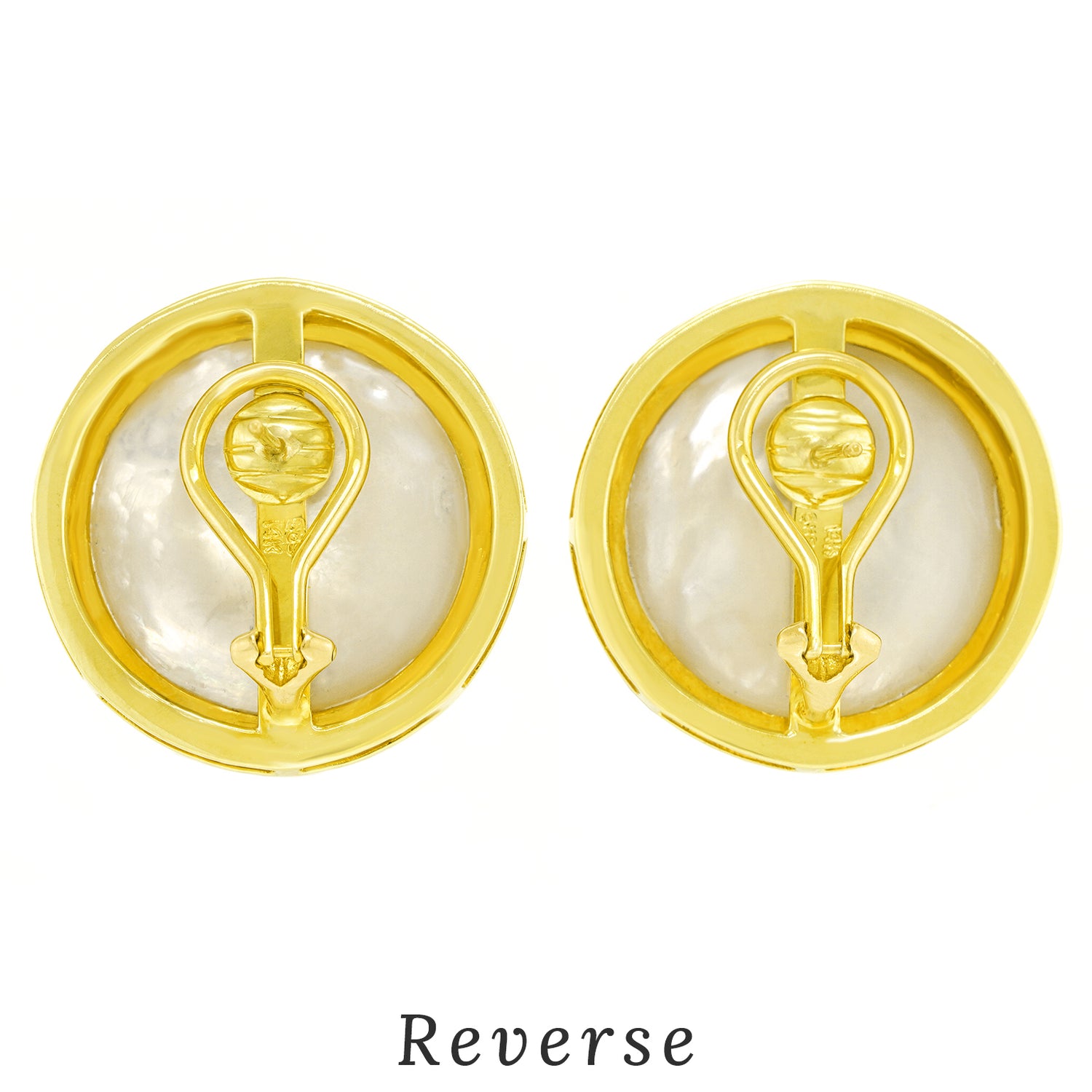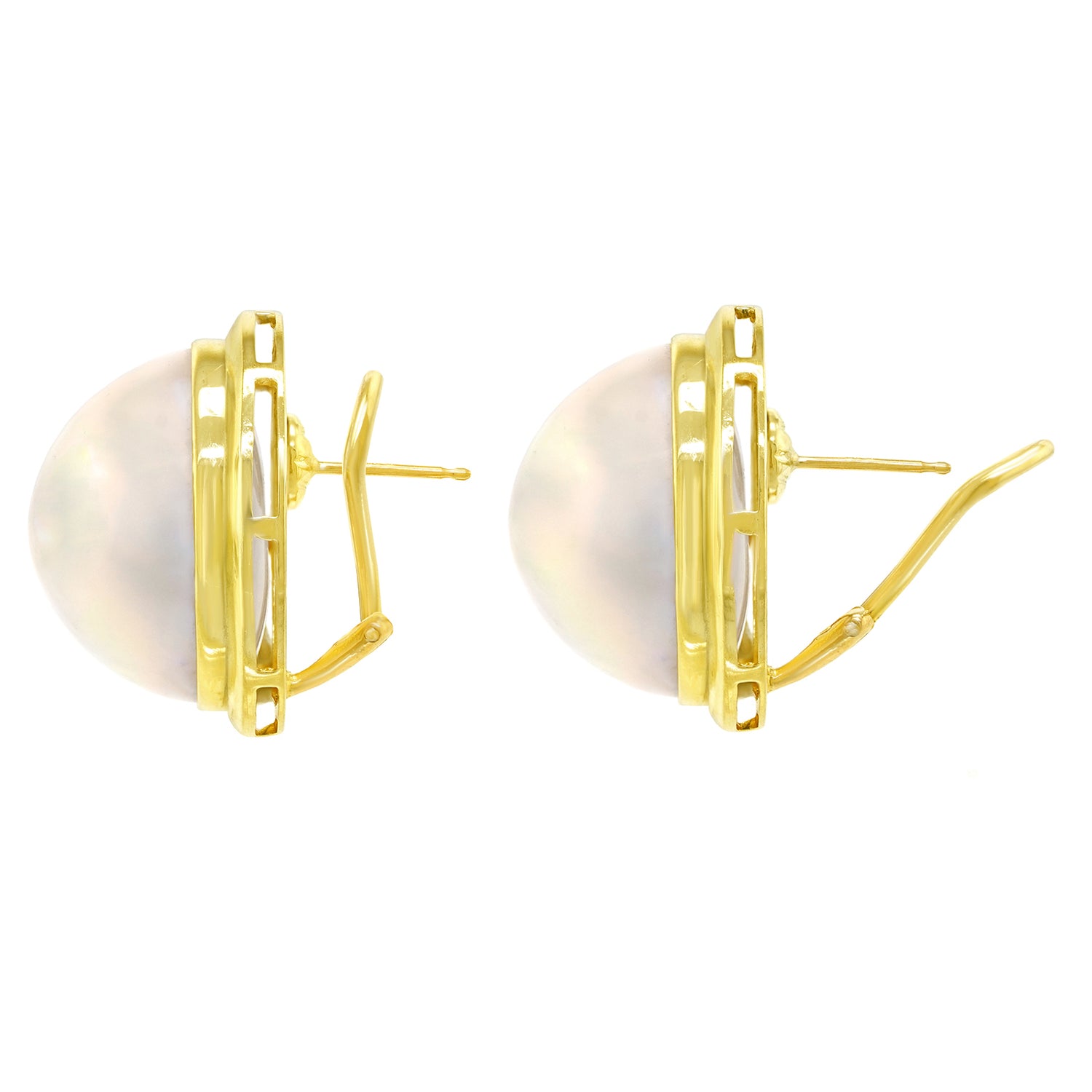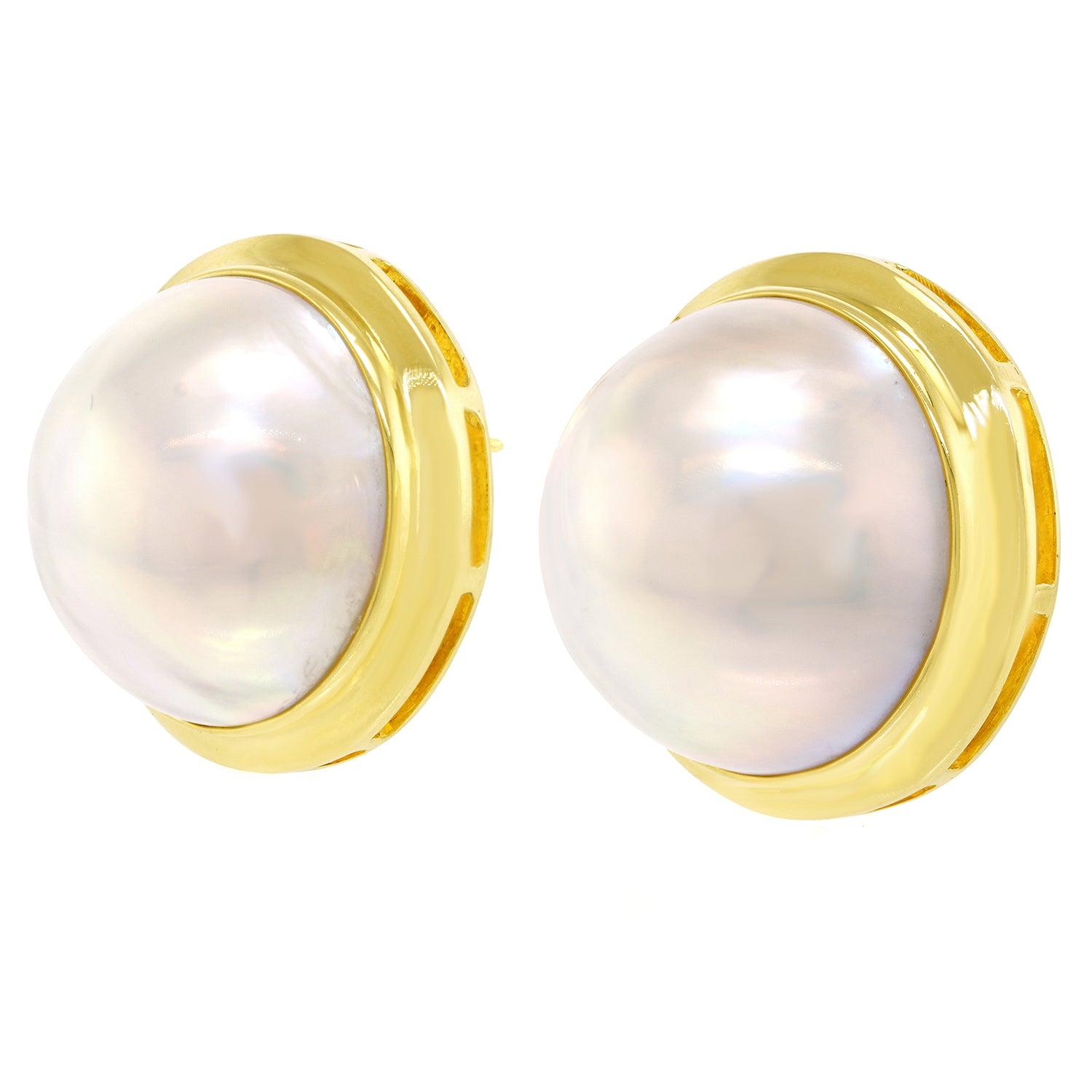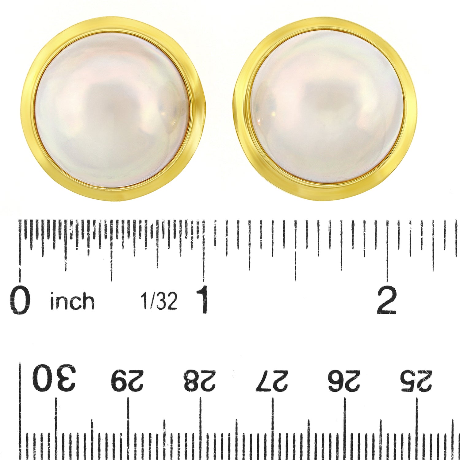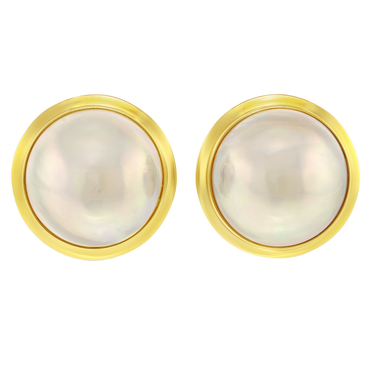Circa 1980s, 14k, American. Big shoulders, leather jackets, big hair…. These earrings embody, fabulous eighties fashion! The look is fresh and bold. A magnificent natural cultured half pearl is the main drama surrounded by a polished frame of gold. Excellent condition.