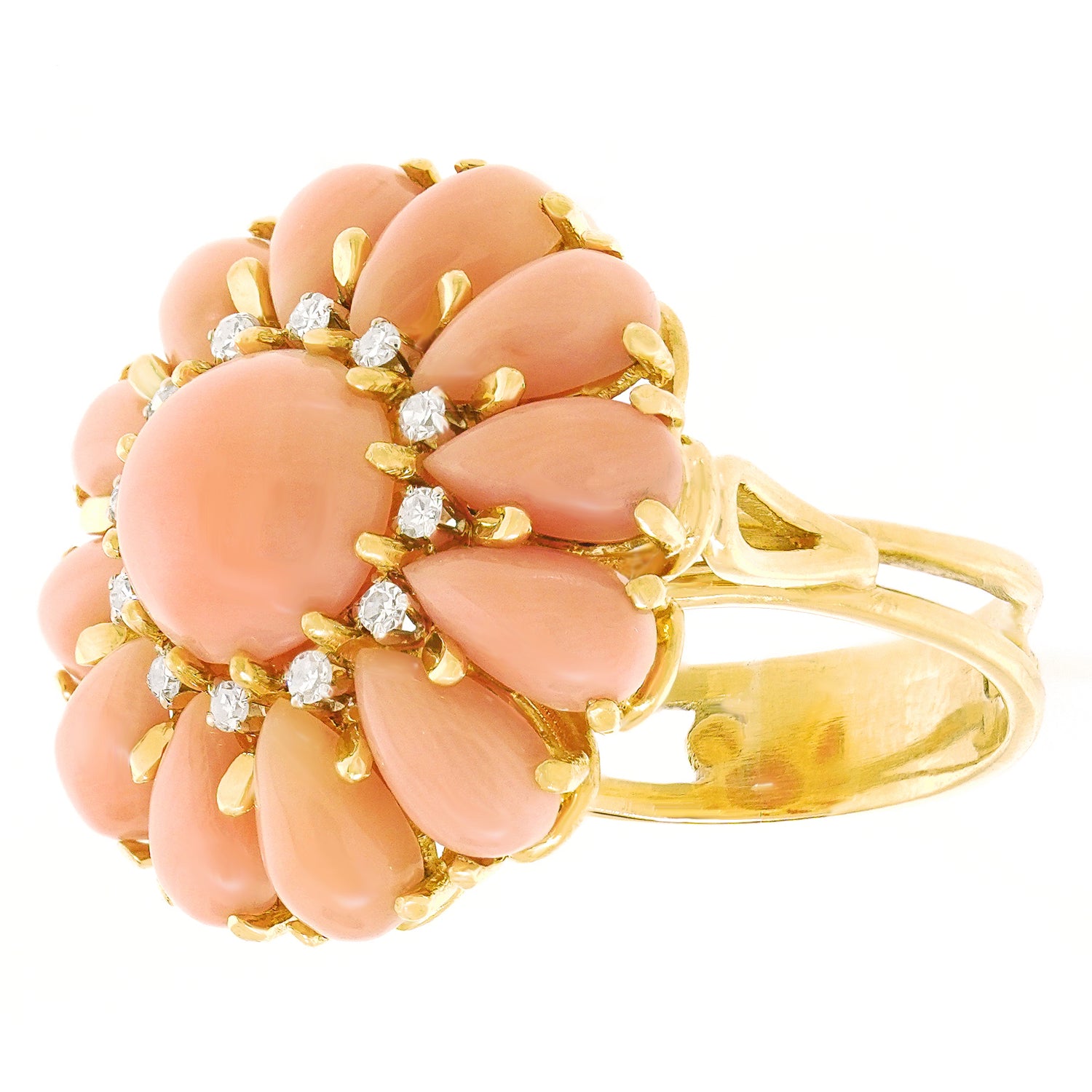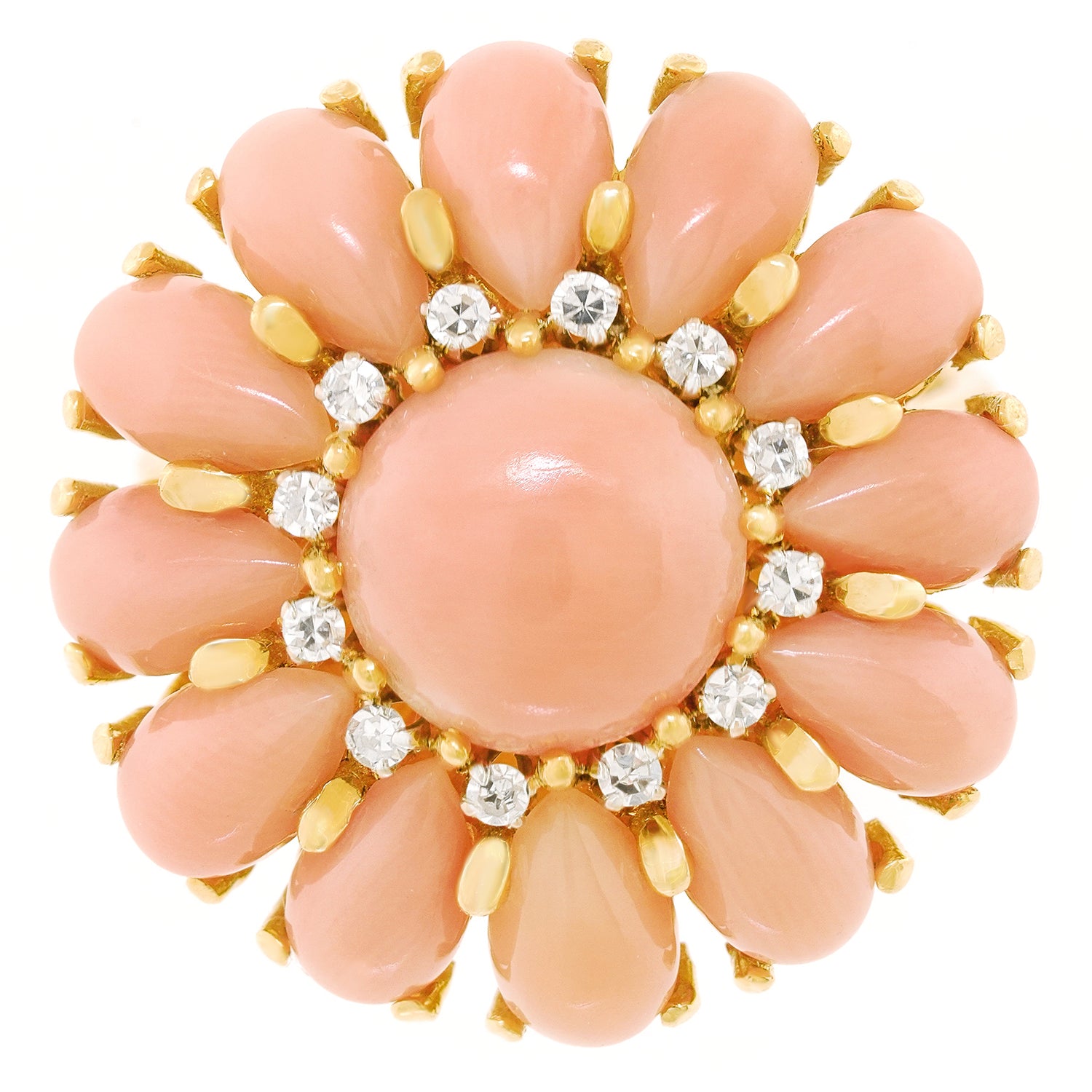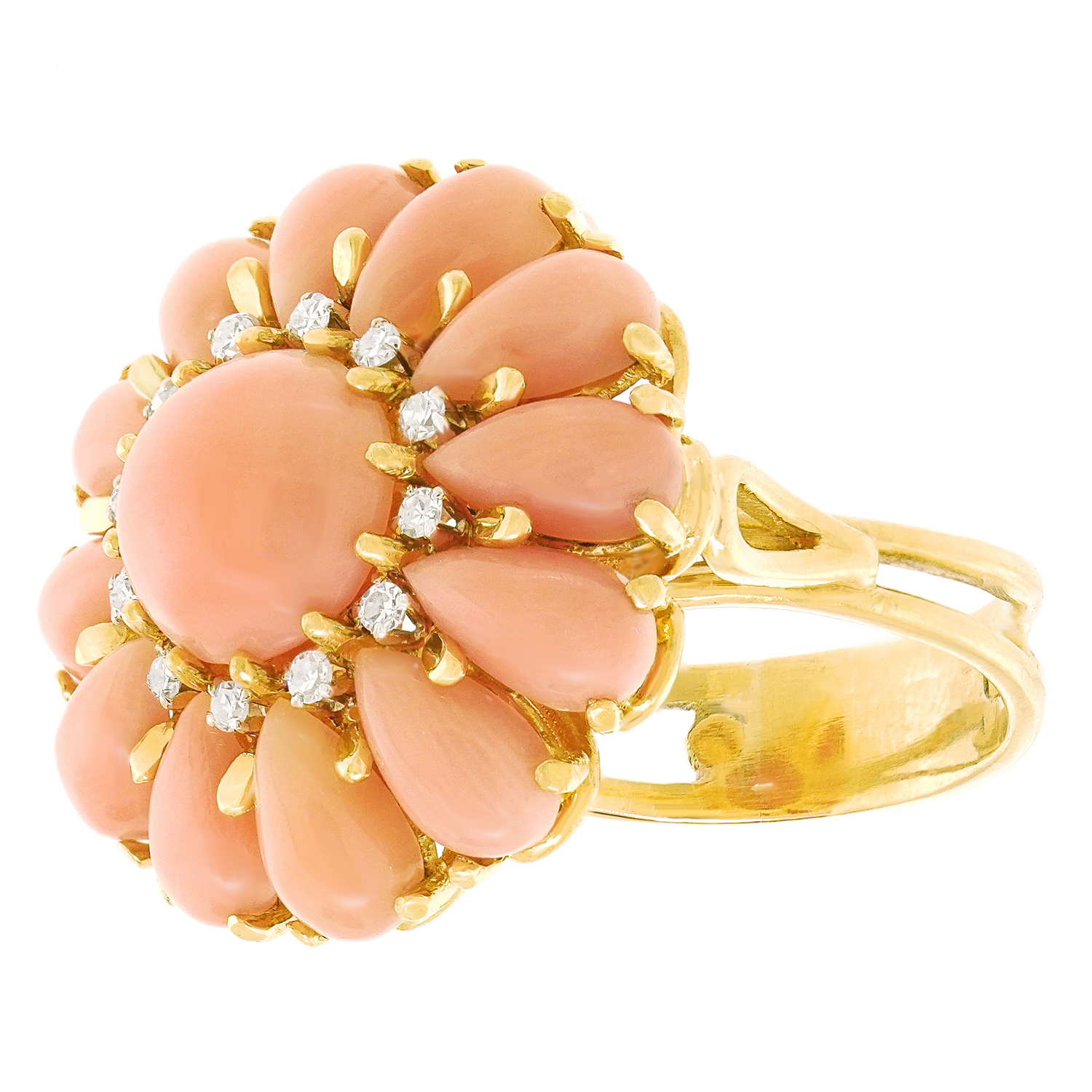 Circa 1950s, 18k, attributed Italy. This timelessly chic ring features delicately hued, well-matched pink coral set amidst bright diamond and gold accents. The color and style are deliciously, fabulously fifties. Its elegant look is underscored by fine hand fabrication. Excellent condition.