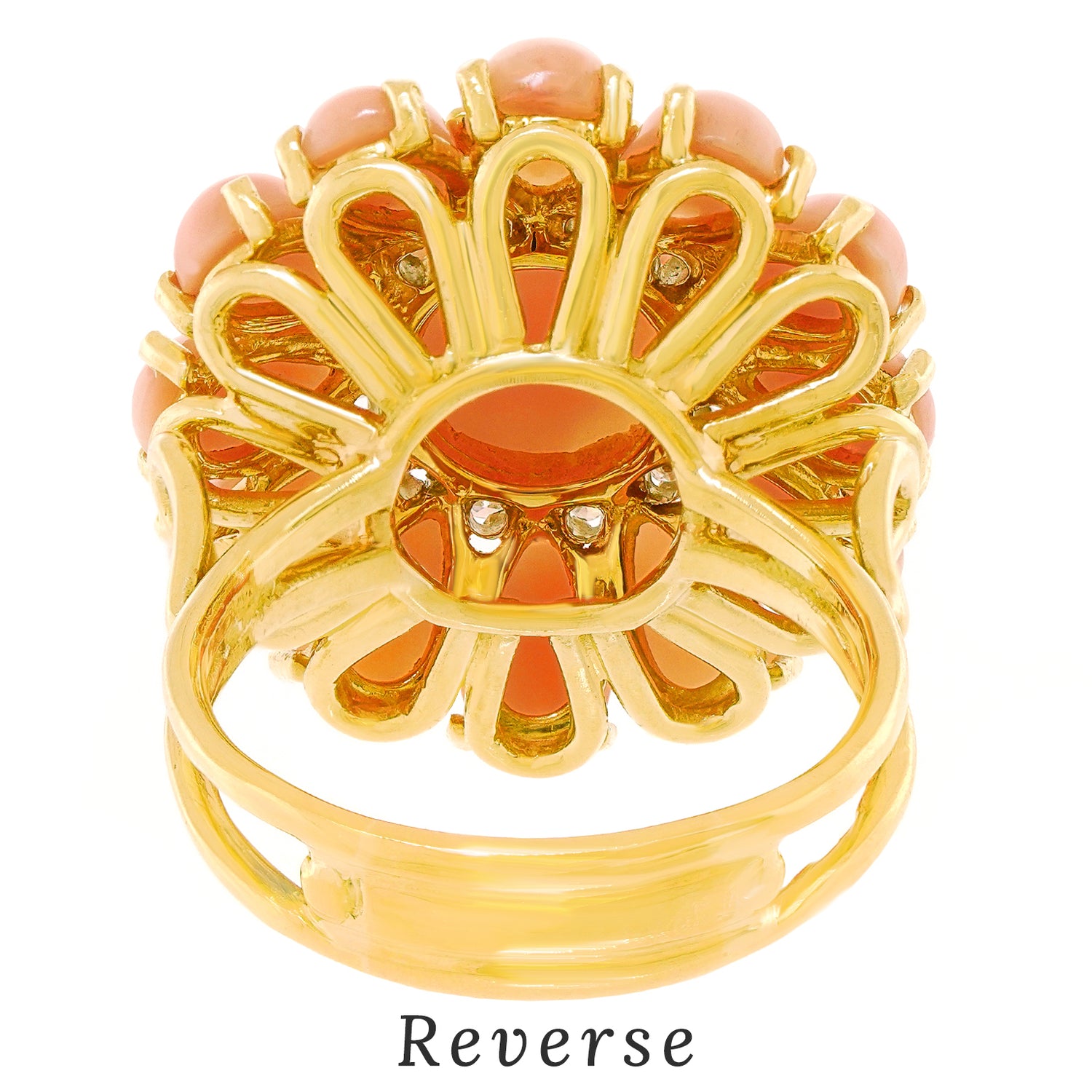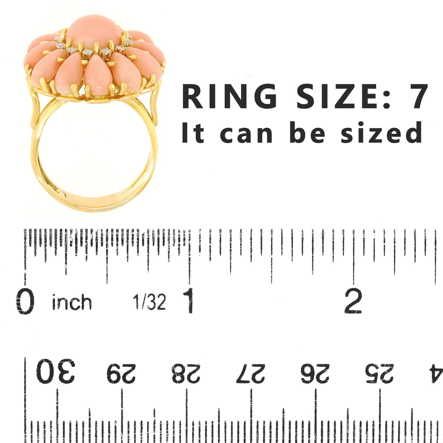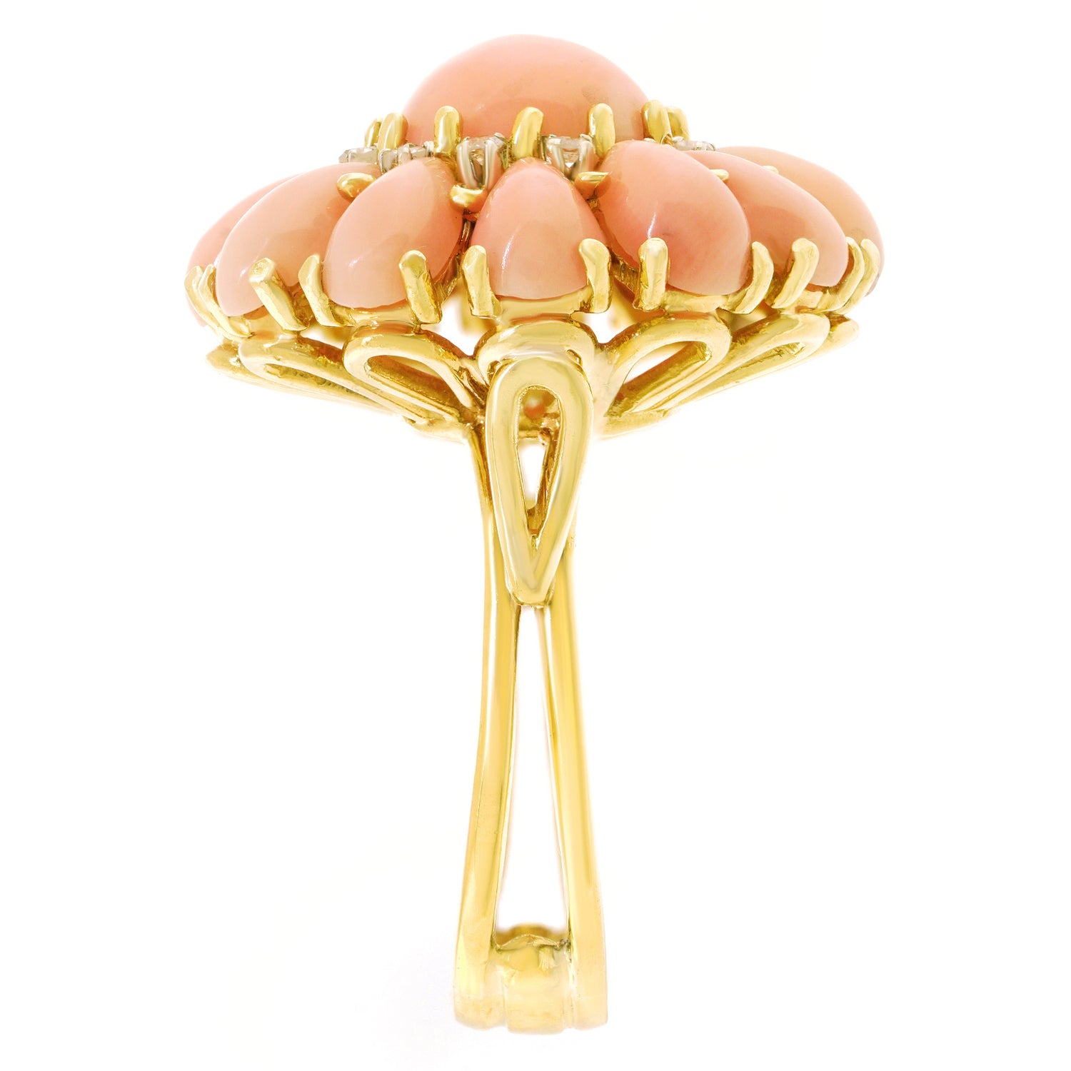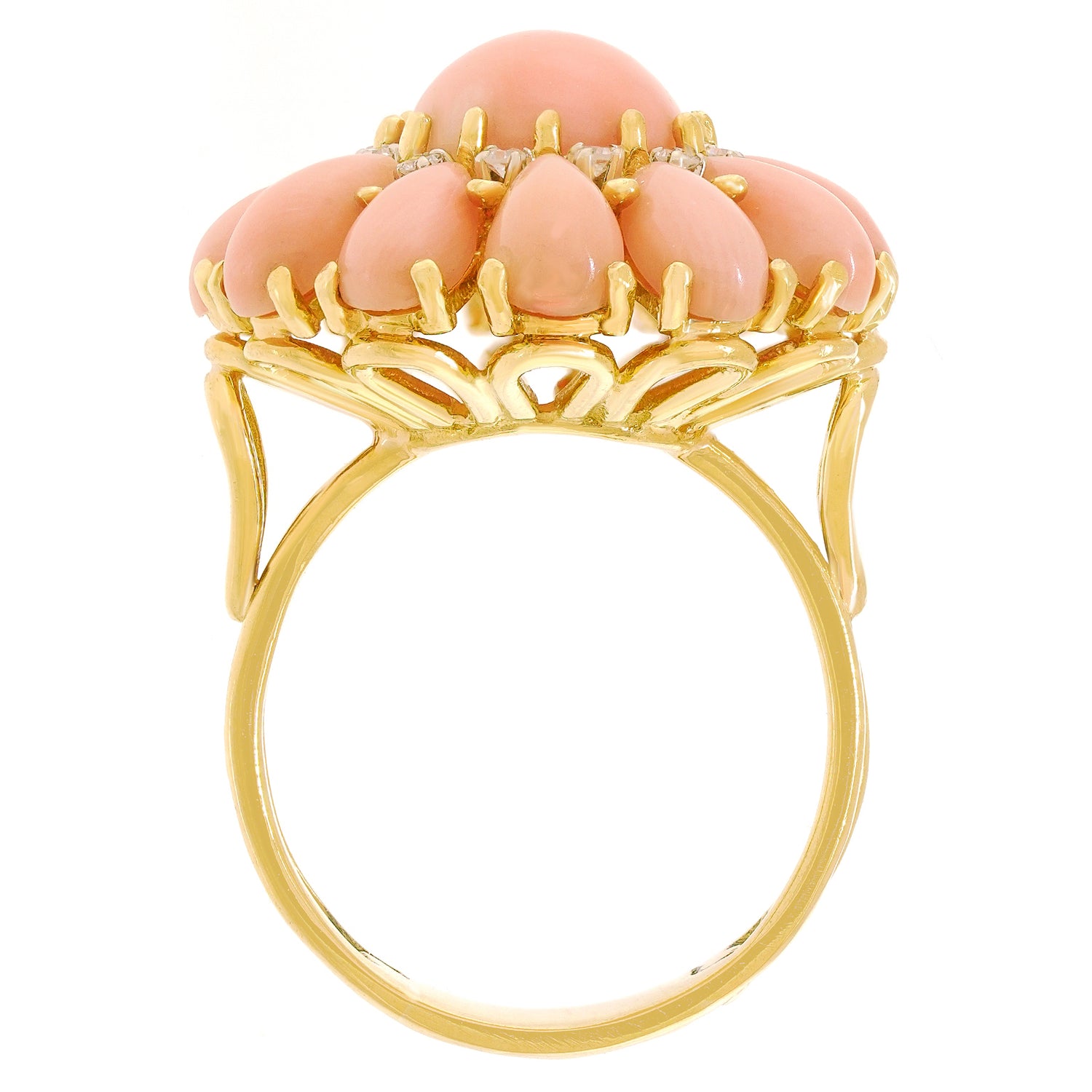 Circa 1950s, 18k, attributed Italy. This timelessly chic ring features delicately hued, well-matched pink coral set amidst bright diamond and gold accents. The color and style are deliciously, fabulously fifties. Its elegant look is underscored by fine hand fabrication. Excellent condition.