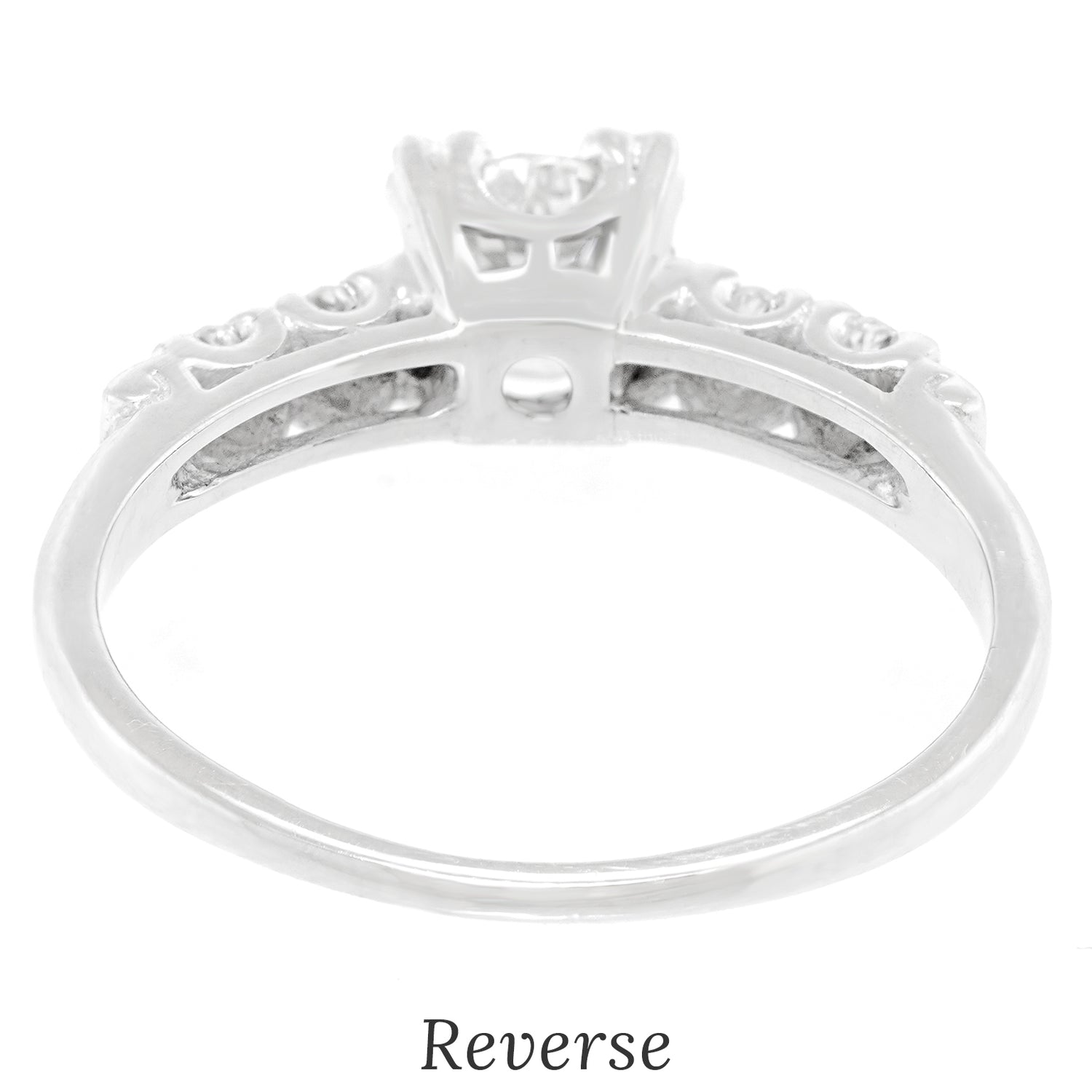 Circa 1930s, 18k, American. The focus of this classic engagement ring is the elegant late Deco styling. The GIA-graded .59-carat center stone (J color, VS1 clarity) is perfectly matched to this chic ring. The charming sophisticated look is underscored by meticulous metalwork in eighteen-karat white gold, and an additional .08 carats of diamonds (H color, SI1 clarity). This 1930s ring is in excellent condition.