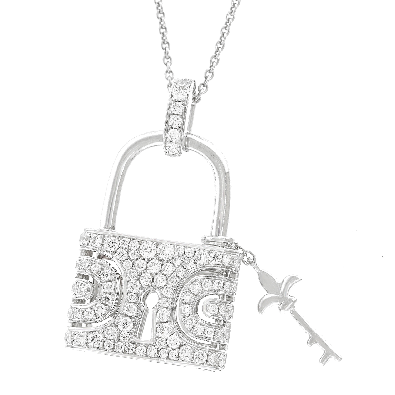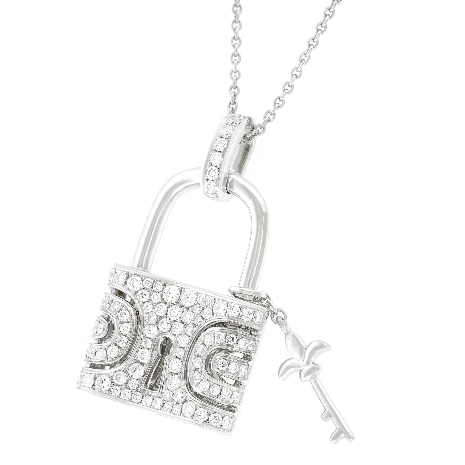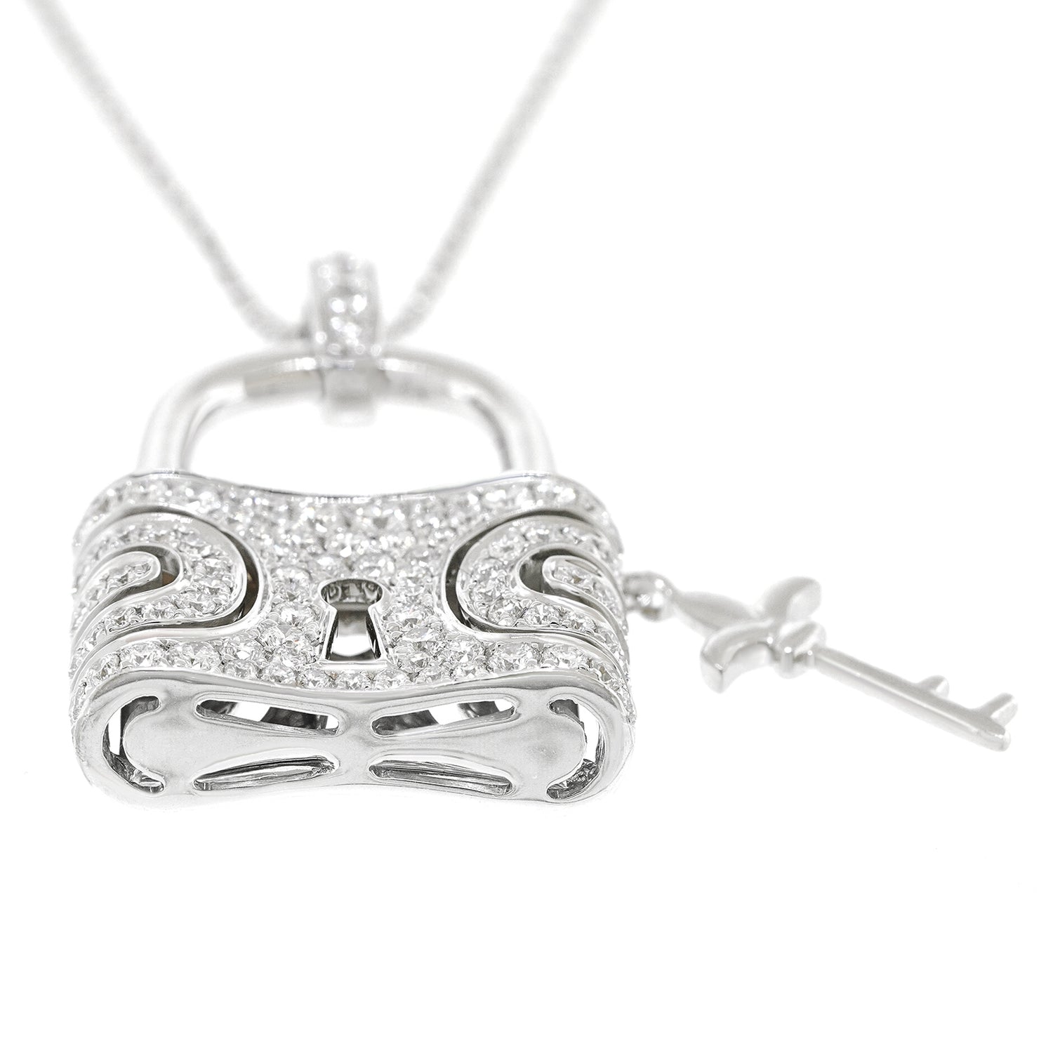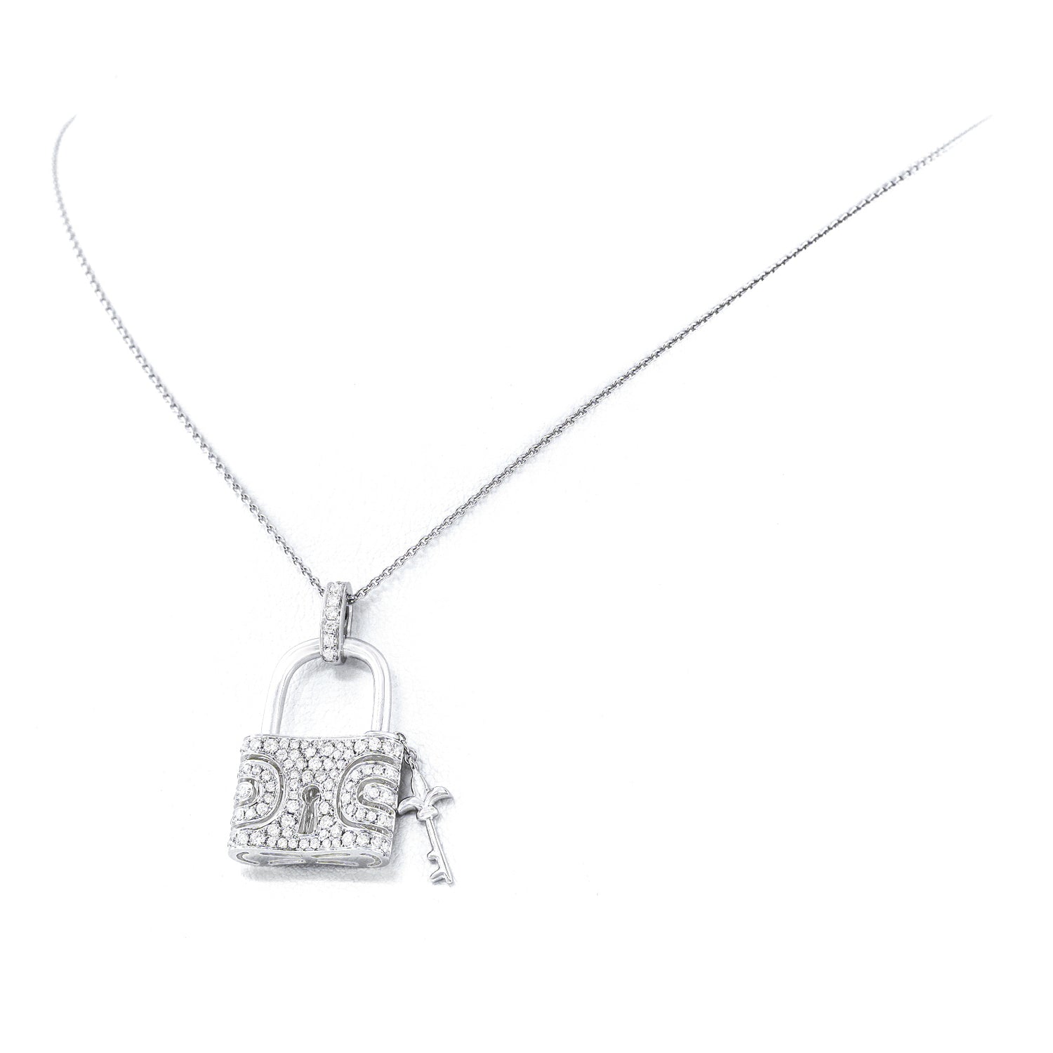Circa 2000s, 18k, Spark Creations, New York. Rife with fine details and diamonds, we can't help but fall in love with this lock & key necklace. From cute work looks to date night dresses, this necklace is the perfect romantic accessory. Meticulously fashioned in eighteen-karat white gold and set with 1.0 carat of brilliant white diamonds (G color VS clarity), it is in excellent condition. Noted: Spark chain included.