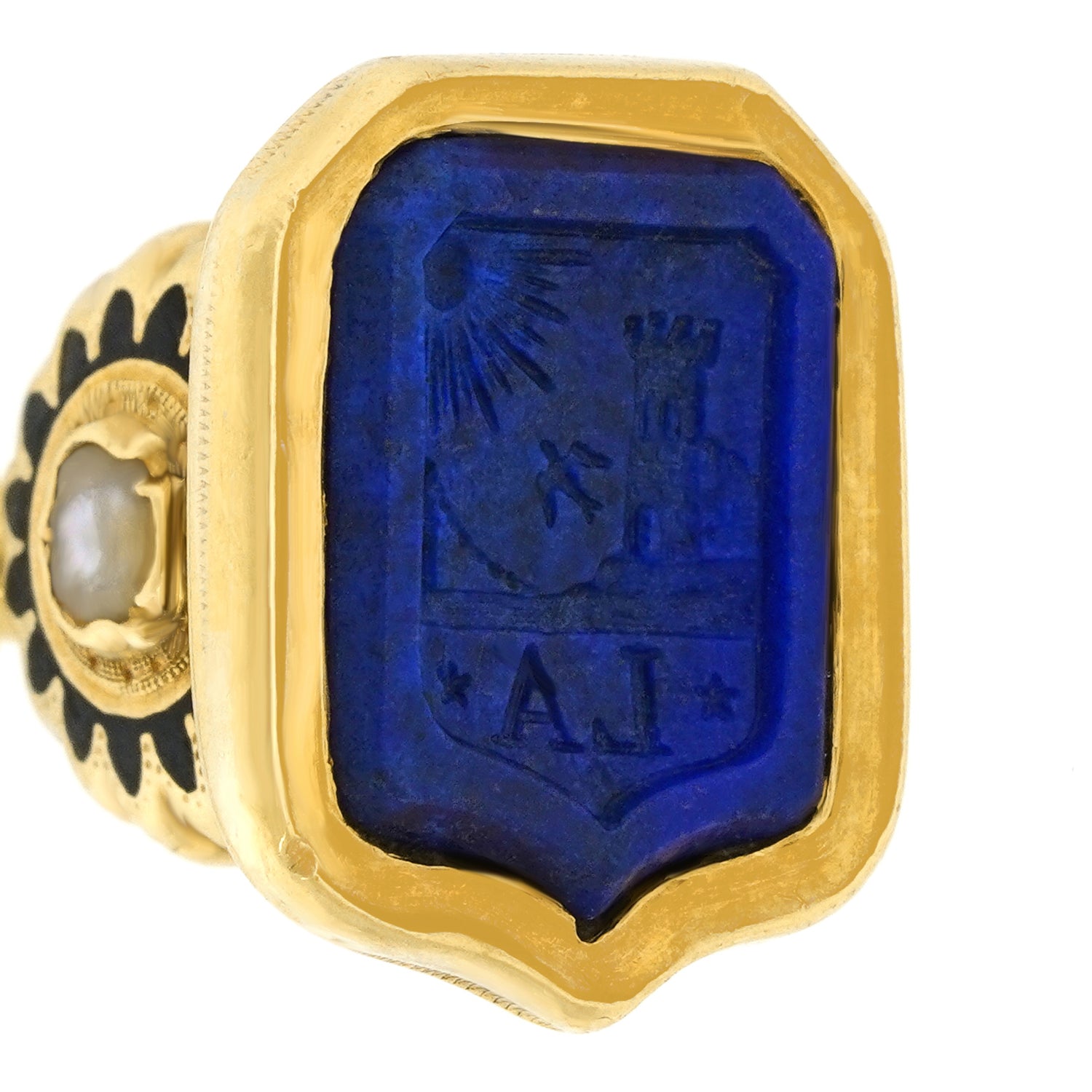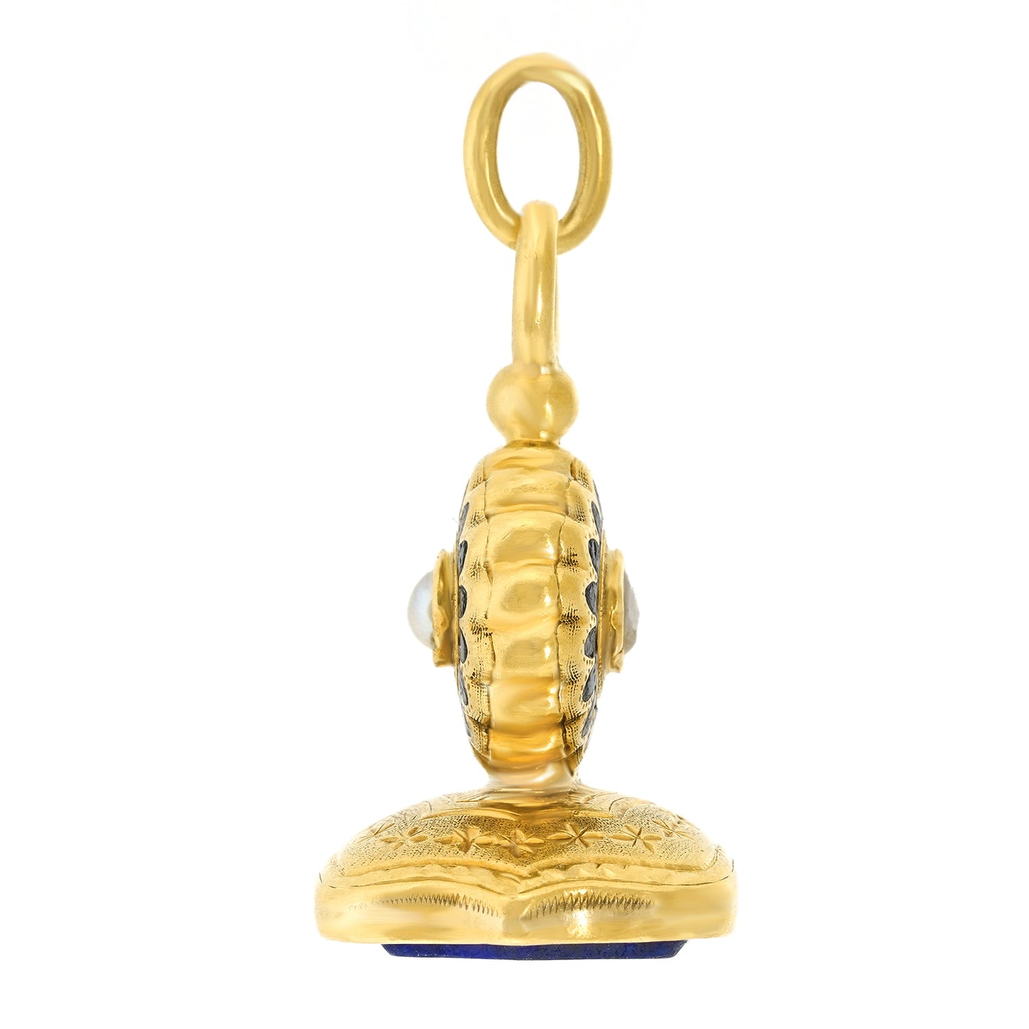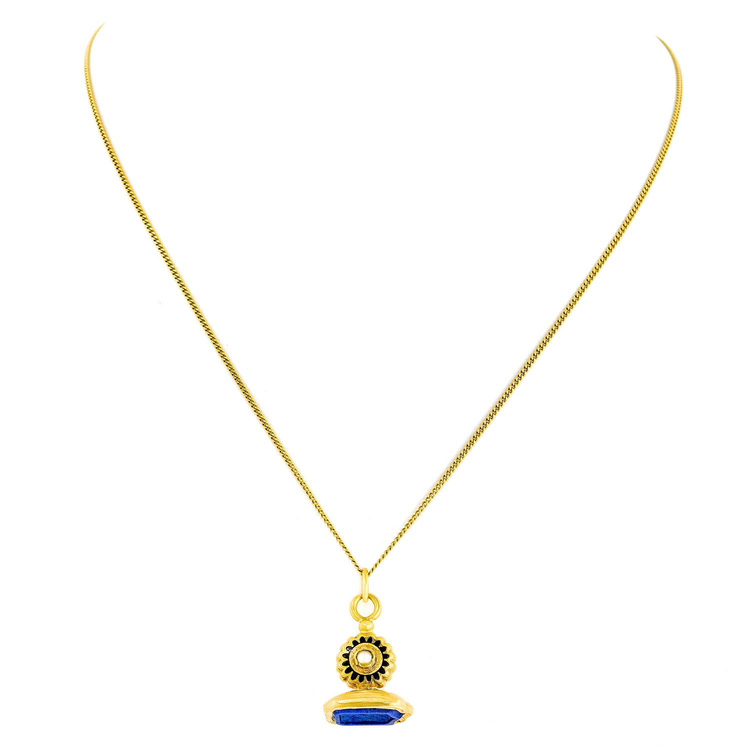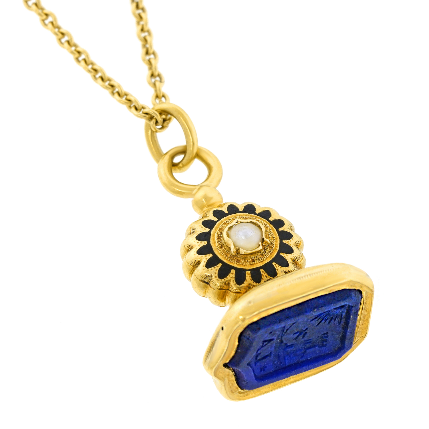 Circa 1910, 18k.   This antique fob is wonderfully decorated with enamel and set a finely colored lapis seal. The look is “town and country” at its vintage chic antique best. Quality hand construction throughout in eighteen-karat gold completes the picture. Very good condition.
