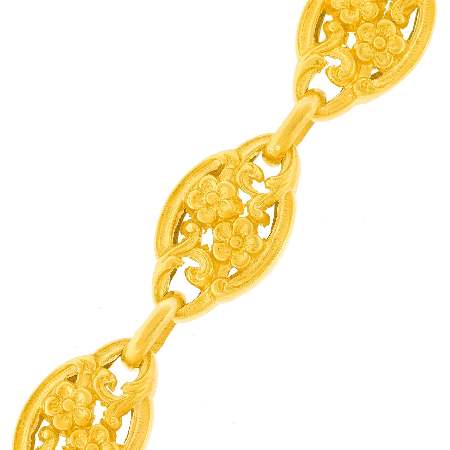Circa 1920s, 18k, France. This Deco bracelet features stylish 18k yellow gold filigree flower motif elements. Dressed up or down, the look is Gallic Town and Country at its most Parisian chic. A versatile accessory that is perfect on its own, with a watch, or with a stack of bracelets. Excellent condition.