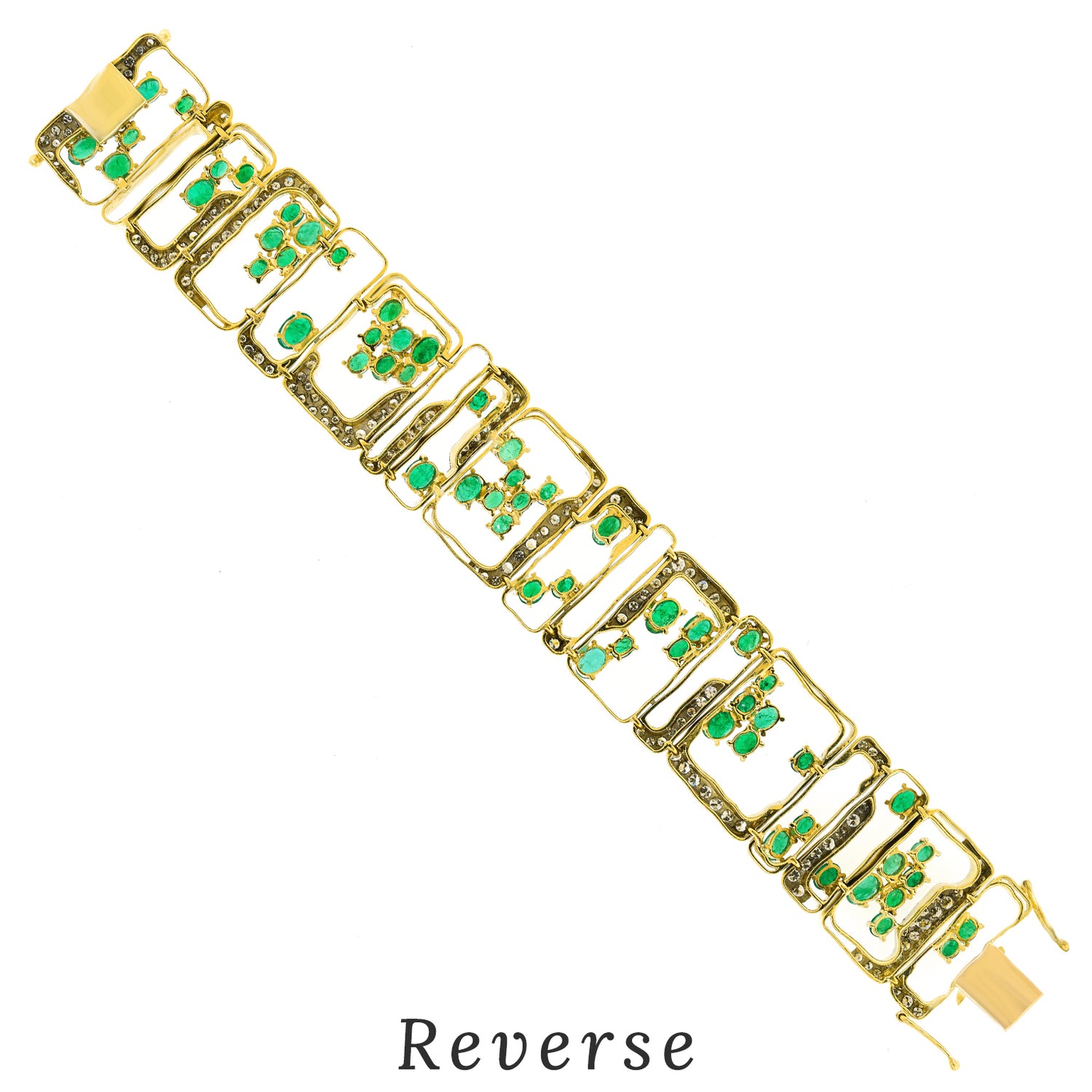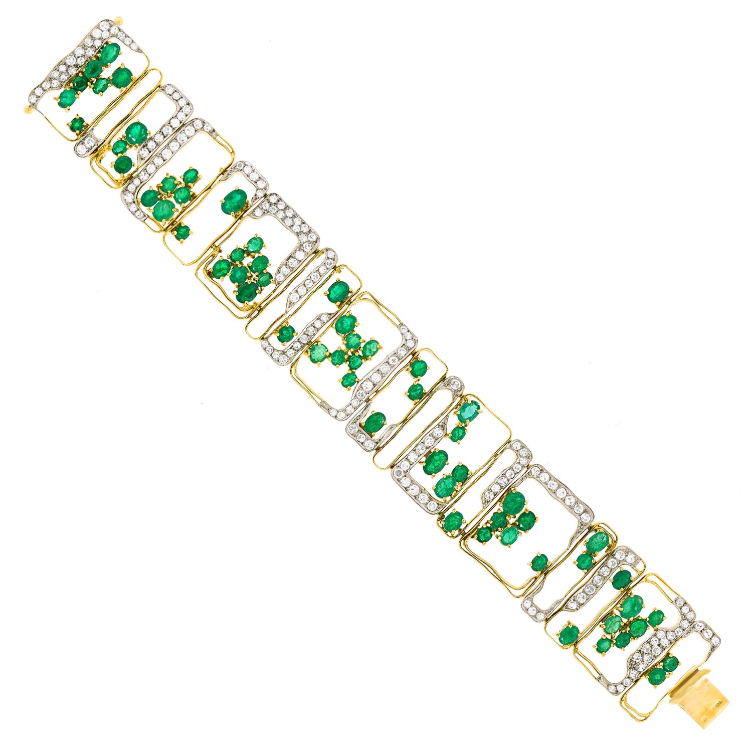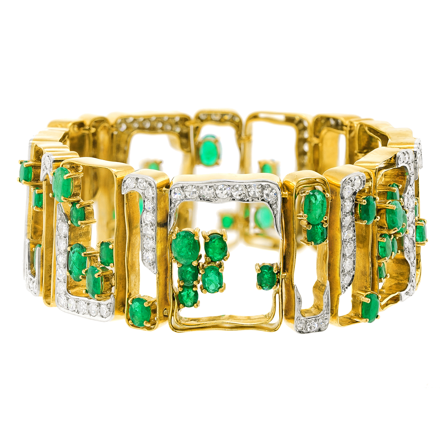 Circa 1950s, 18k, Swiss. This superb emerald and diamond bracelet is an organo chic tour-de-force. A modernist dreamscape of melting ice and snow with the green of spring dotting the snowscape, this one-of-a-kind jewel looks and feels spectacular. Beyond chic, it is in excellent condition.