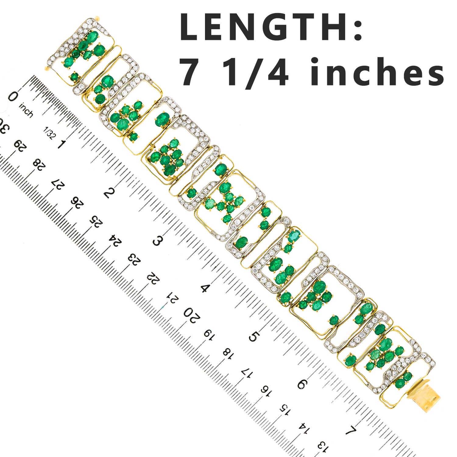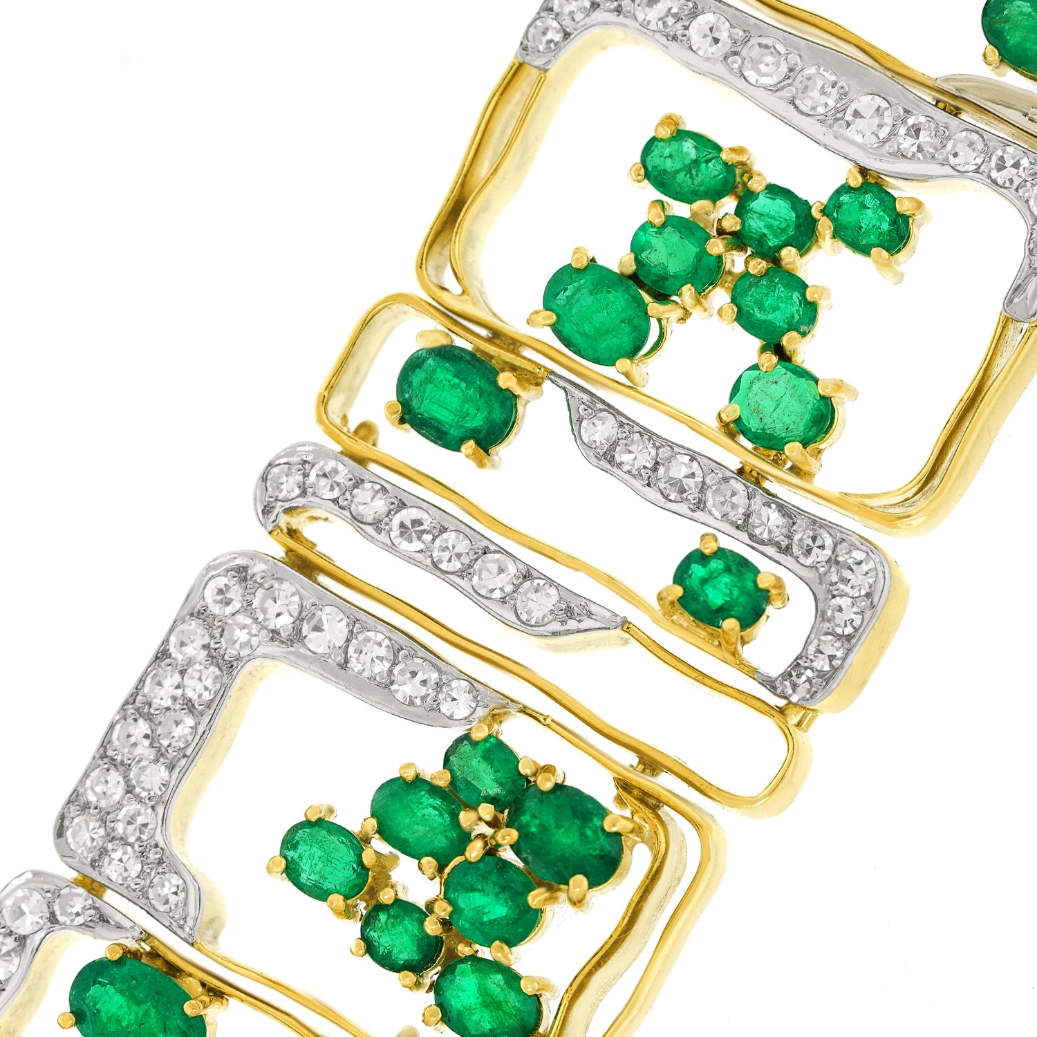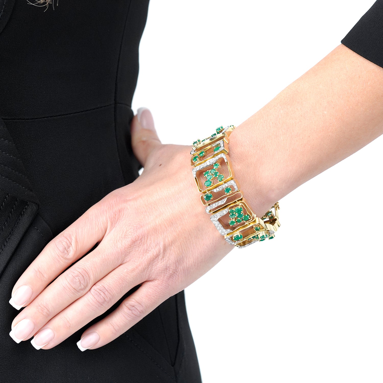 Circa 1950s, 18k, Swiss. This superb emerald and diamond bracelet is an organo chic tour-de-force. A modernist dreamscape of melting ice and snow with the green of spring dotting the snowscape, this one-of-a-kind jewel looks and feels spectacular. Beyond chic, it is in excellent condition.