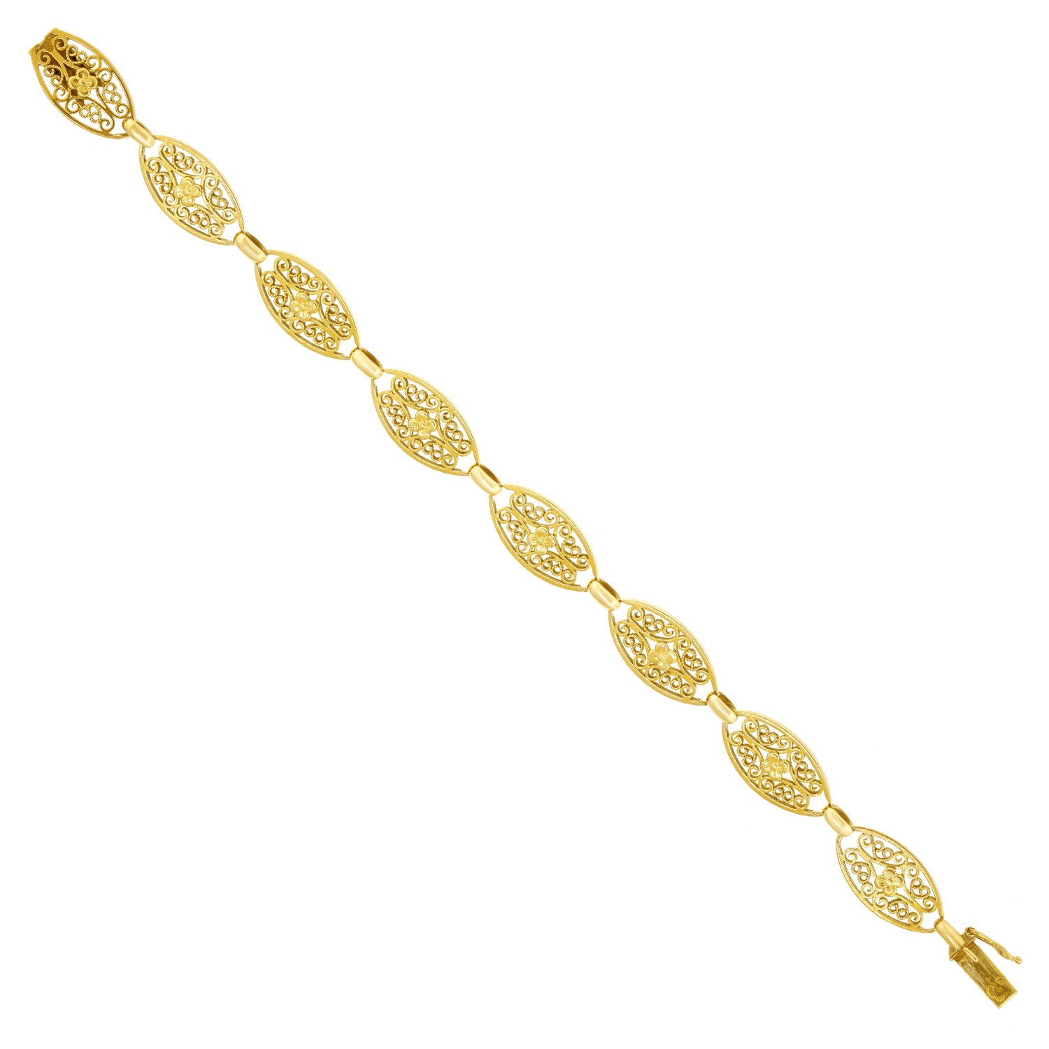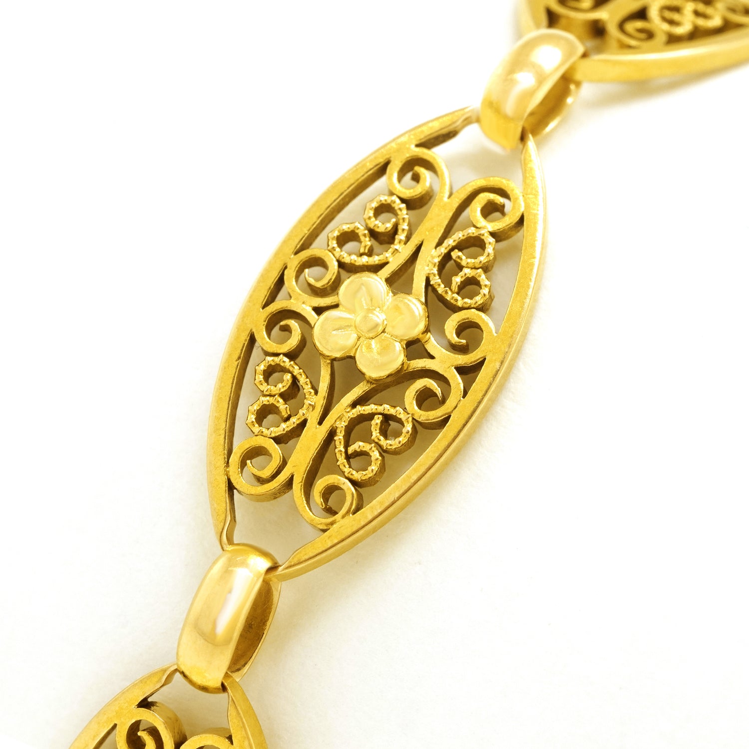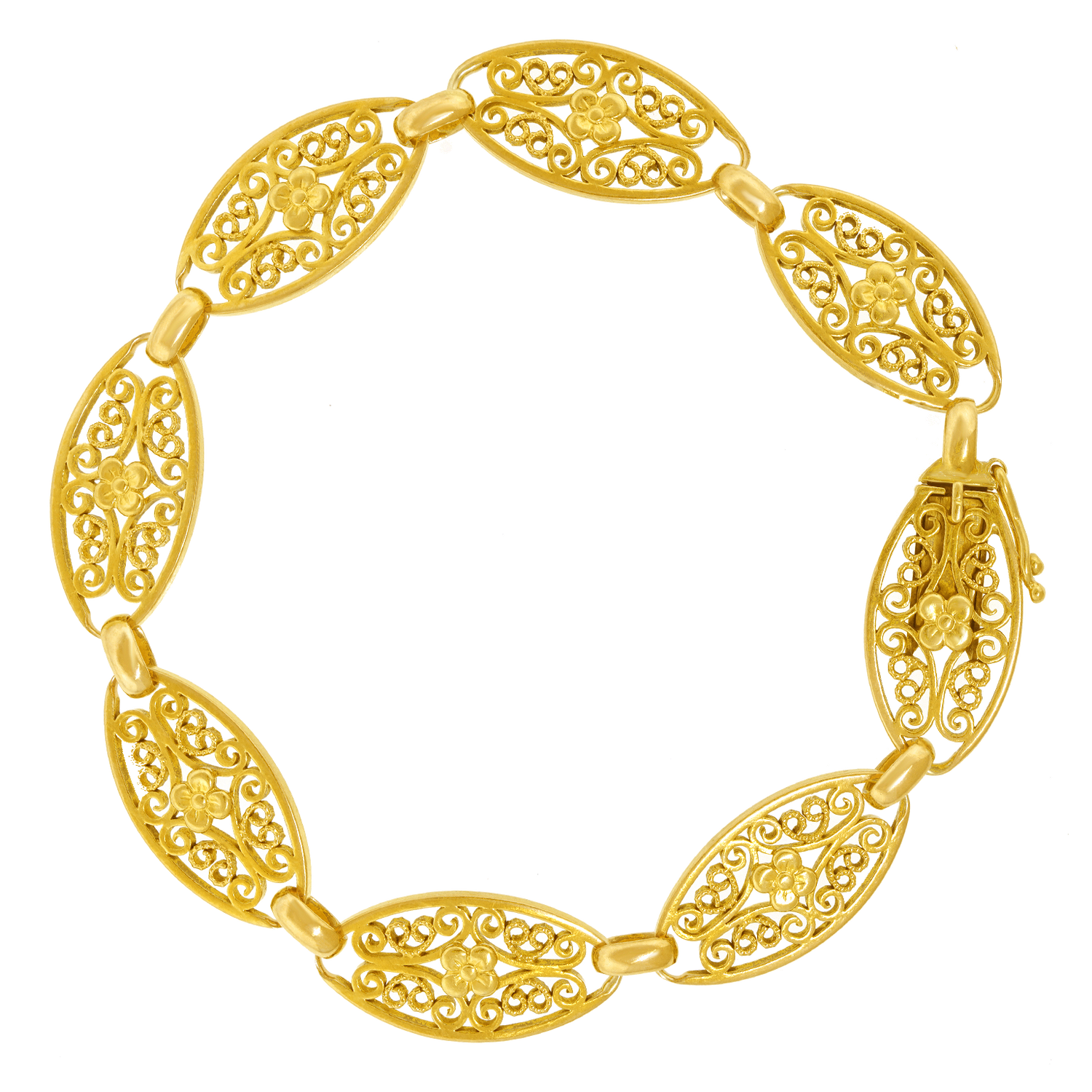 Circa 1890s, 18k, France. This antique bracelet features handmade 18k yellow gold filigree flower motifs. Dressed up or down, the look is Gallic Town and Country at its most Parisian chic. Excellent condition.
