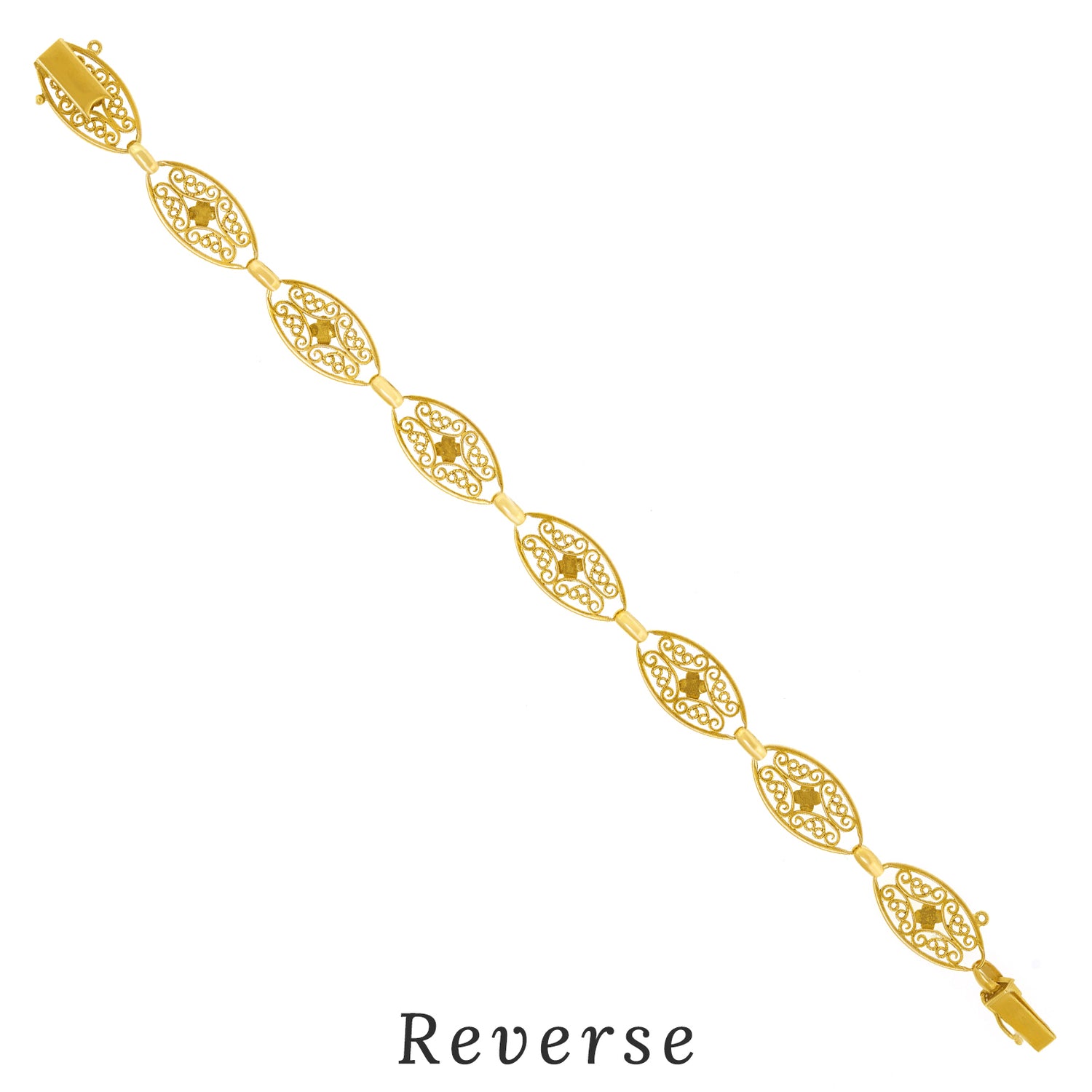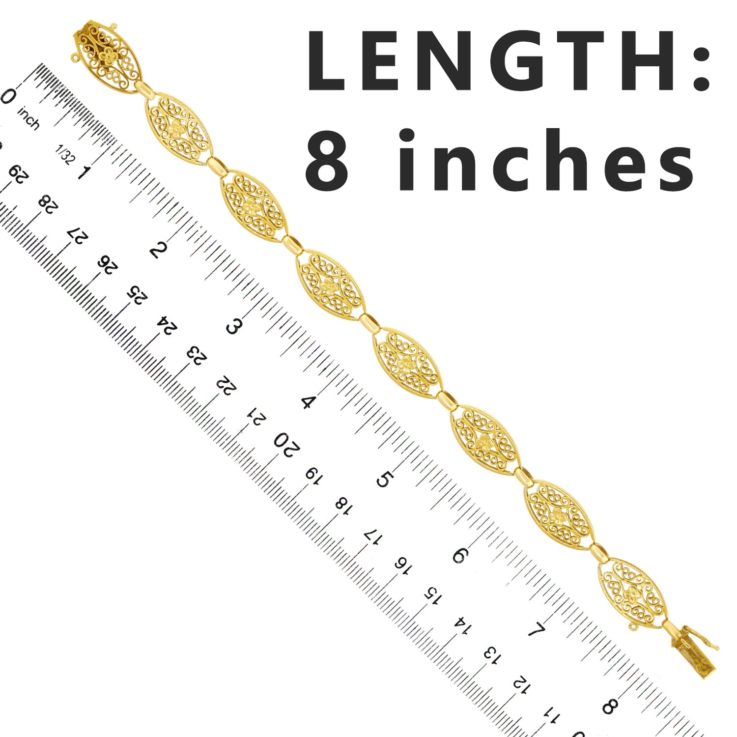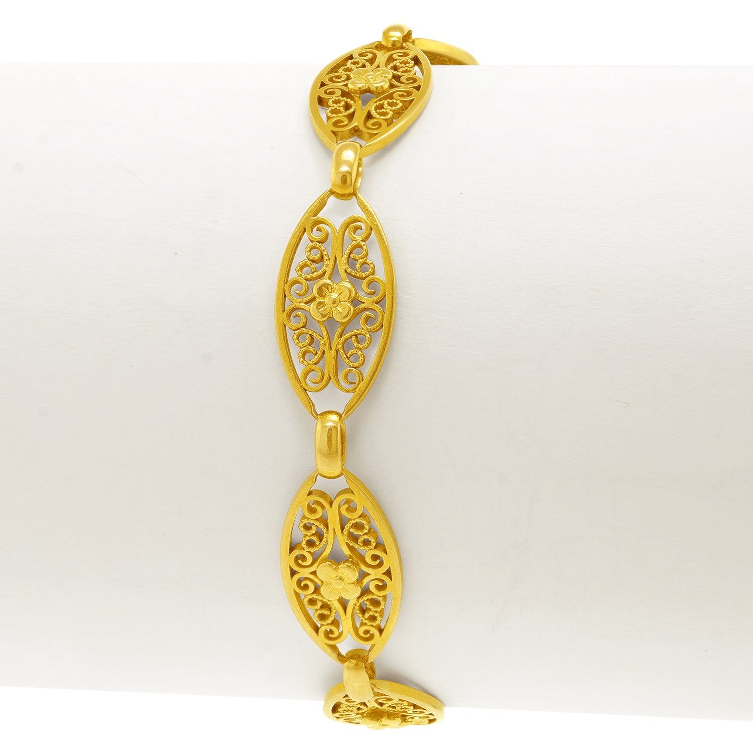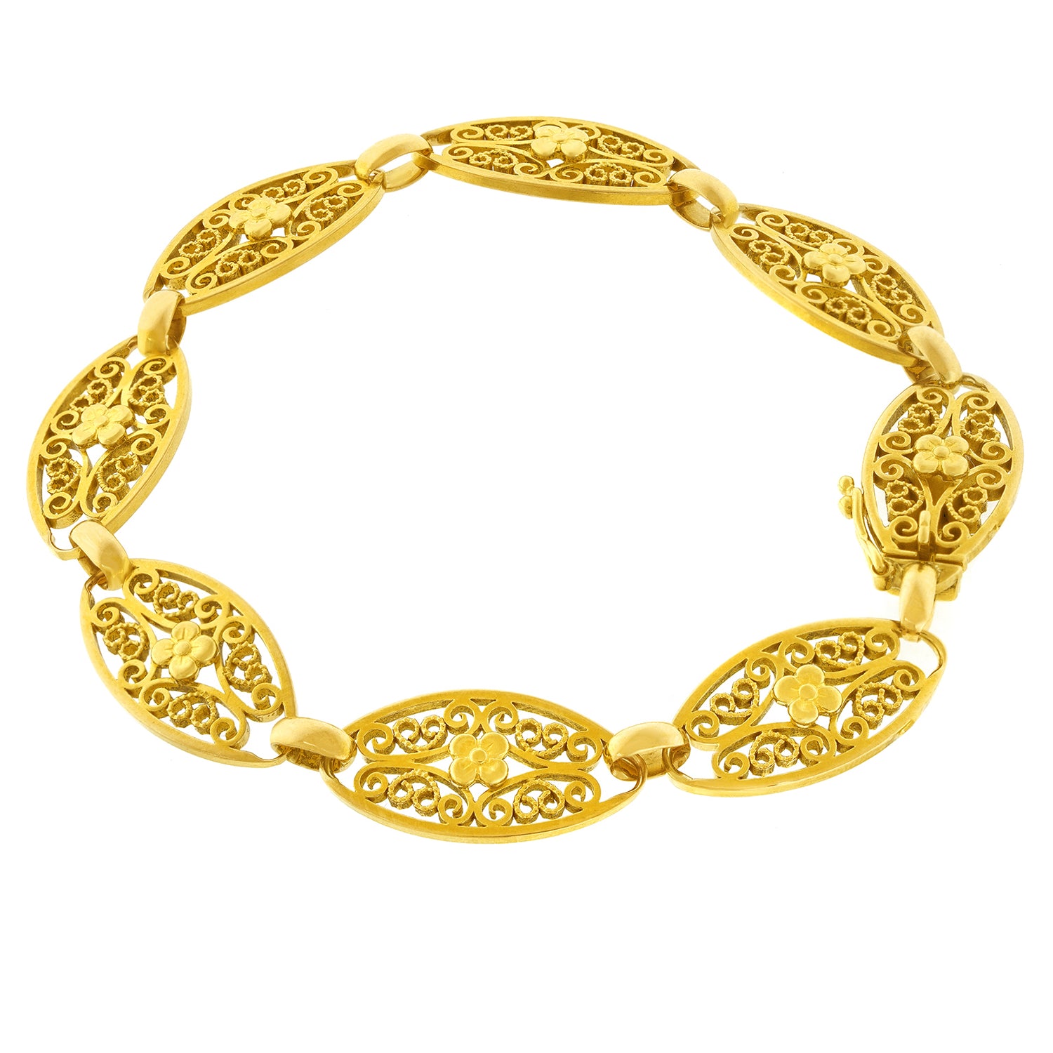 Circa 1890s, 18k, France. This antique bracelet features handmade 18k yellow gold filigree flower motifs. Dressed up or down, the look is Gallic Town and Country at its most Parisian chic. Excellent condition.