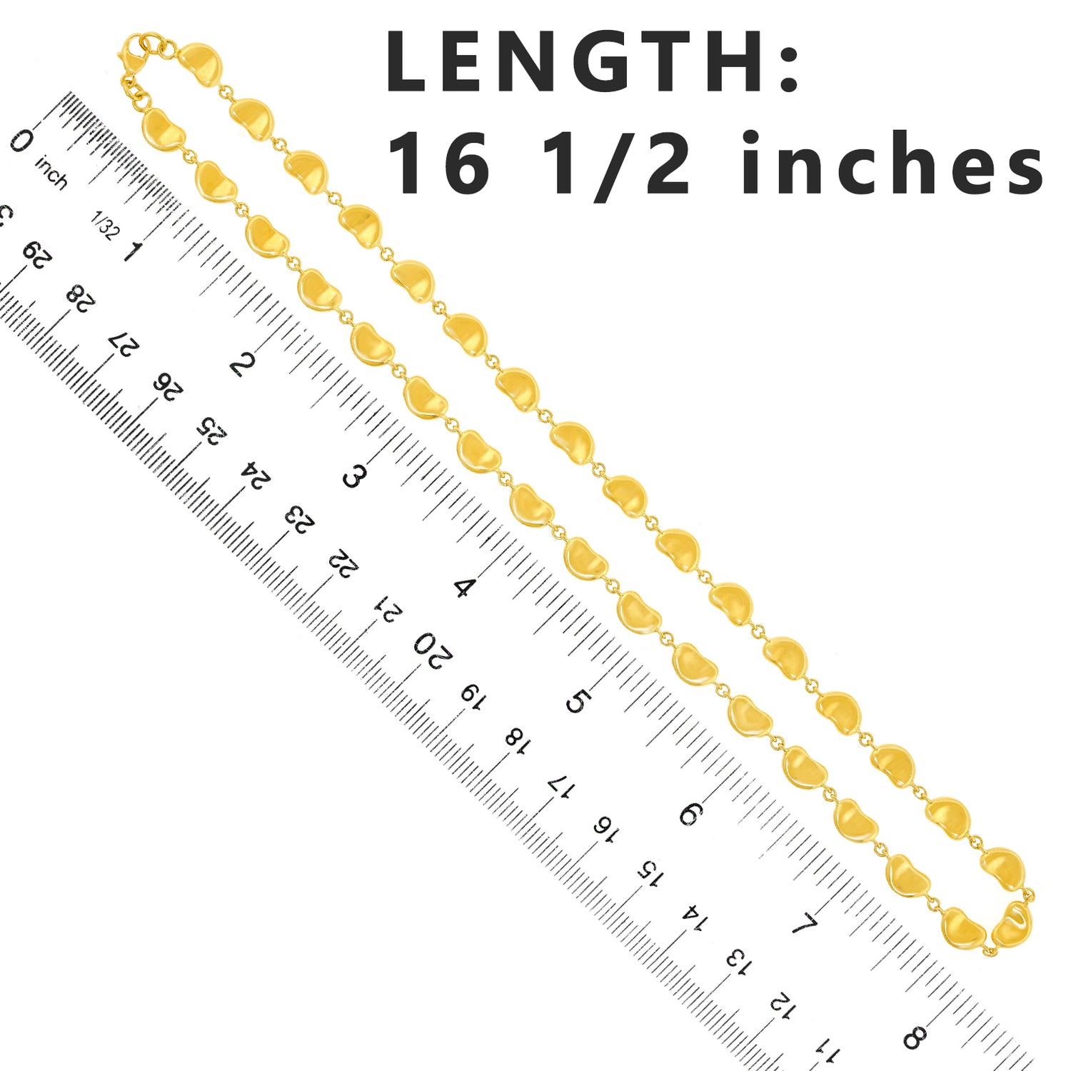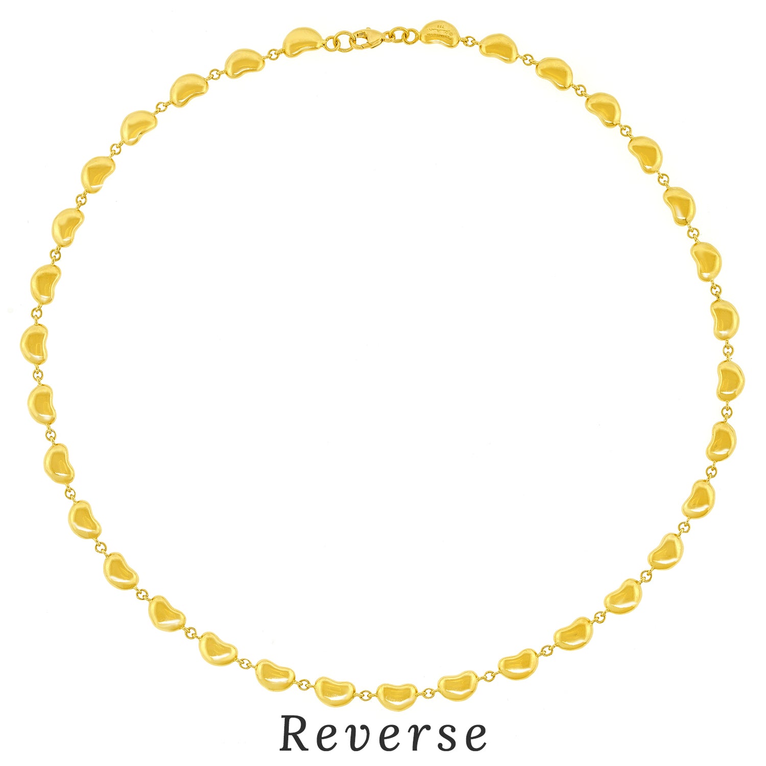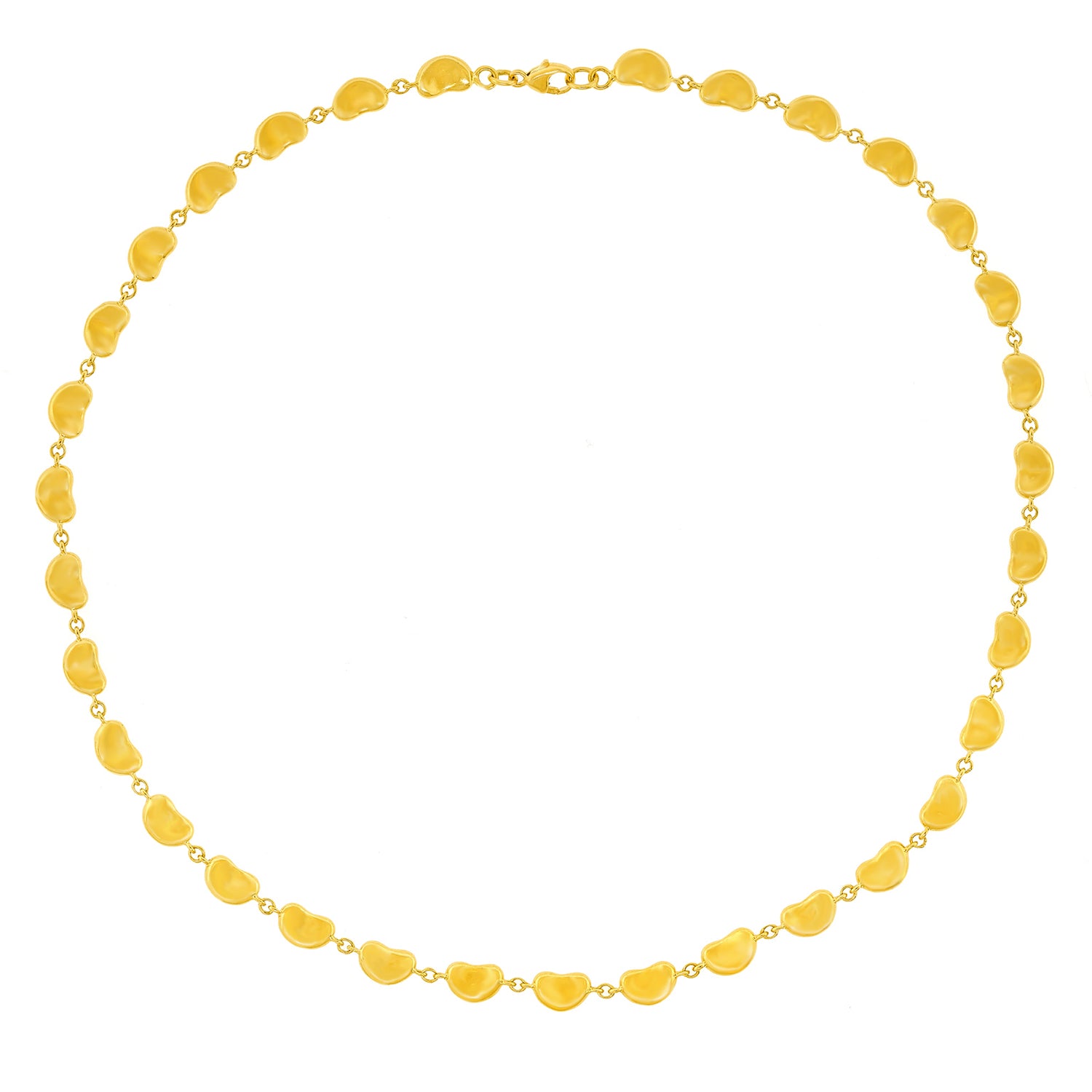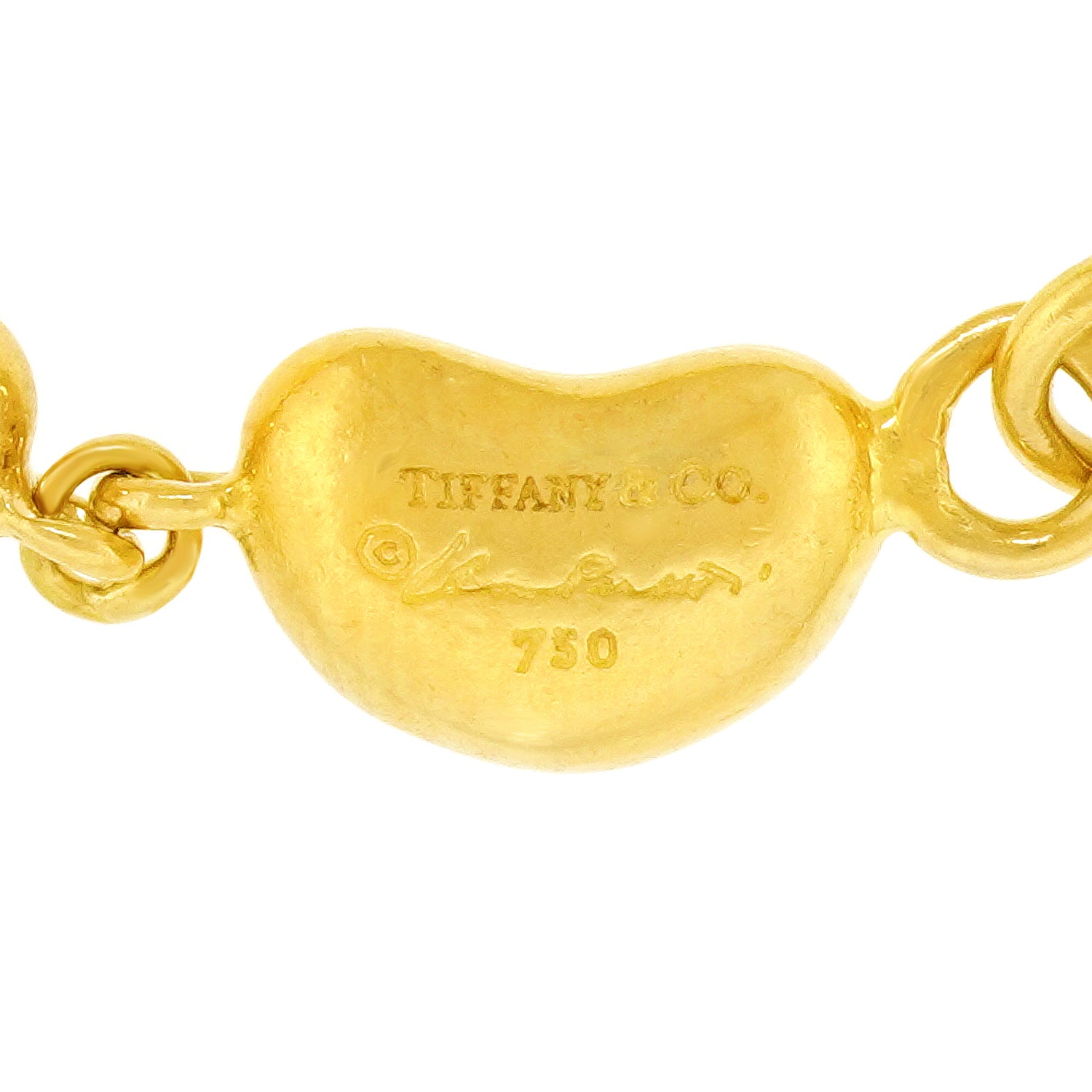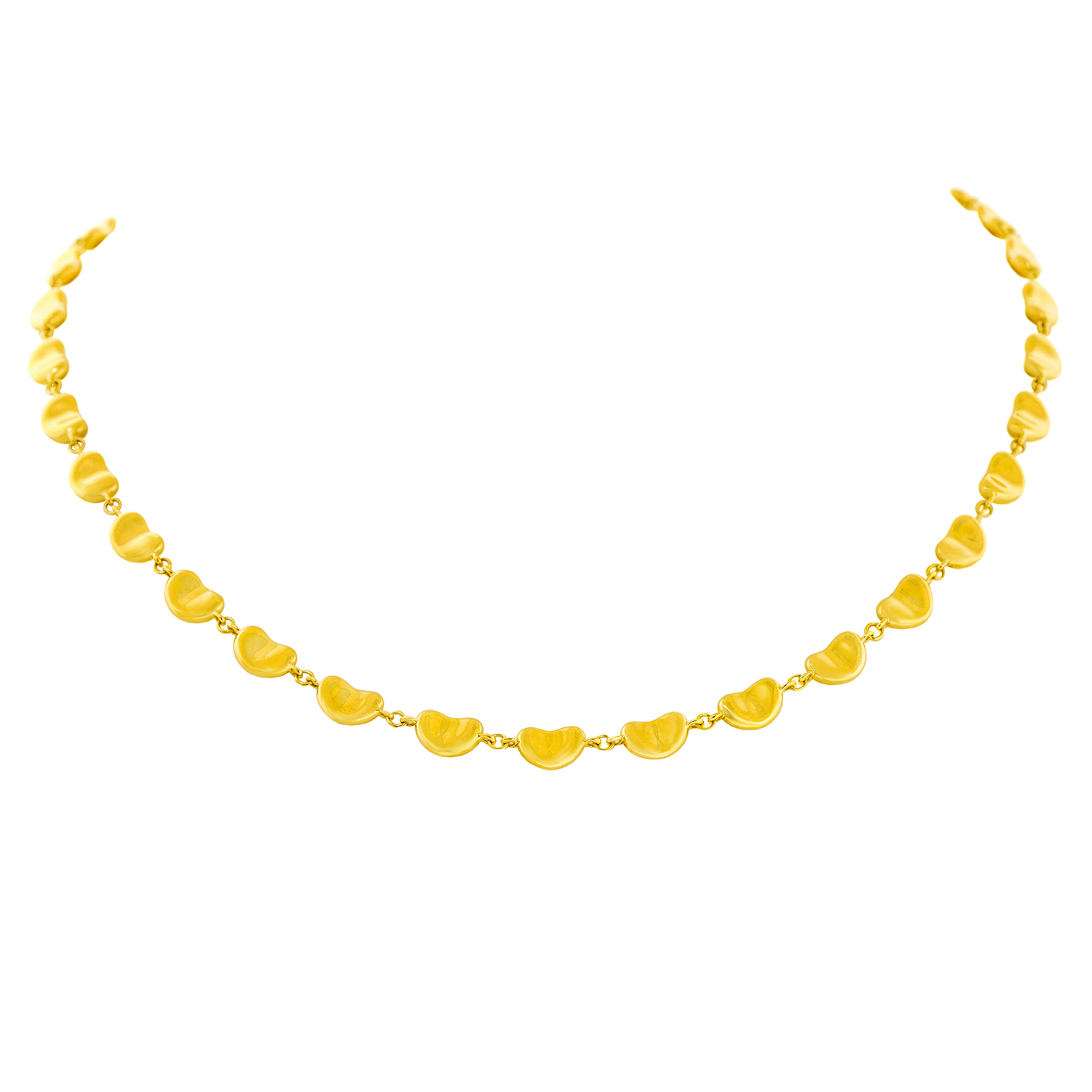 Circa 1980s, 18k, by Elsa Peretti, for Tiffany & Co., New York. Elsa Peretti's designs for Tiffany created a new style in jewelry. Visually capturing fluid narratives in metal, her amorphous pieces are miniature sculptures. These “bean” motifs are iconic examples of her best work. The diminutive size of this necklace makes it a bold standout redolent of all things big in fashion, a recurring theme in the seventies and eighties.