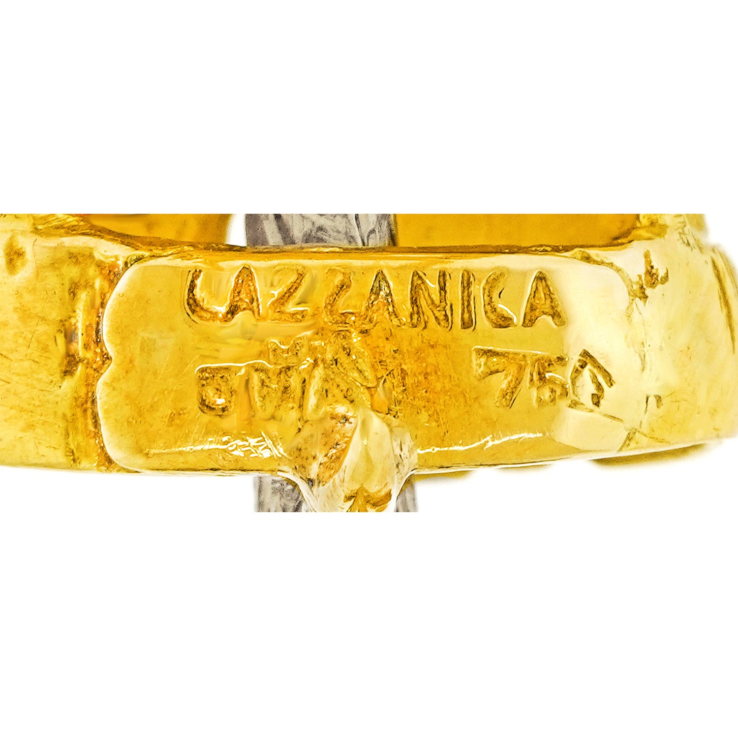 Circa 1960s, 18k, by Cazzaniga, Italy. This delightful scarecrow brooch by Cazzaniga is a sublime one-of-a-kind jewel. Every detail is perfectly executed. He is adorned with wide ruby eyes, there are garnet and emerald patches on his worn coat, and a bright red enamel tie completes the look. Founded in 1929 in Rome, Cazzaniga's salon is now by appointment only, continuing to create one-of-a-kind pieces for a select clientele. Excellent condition.