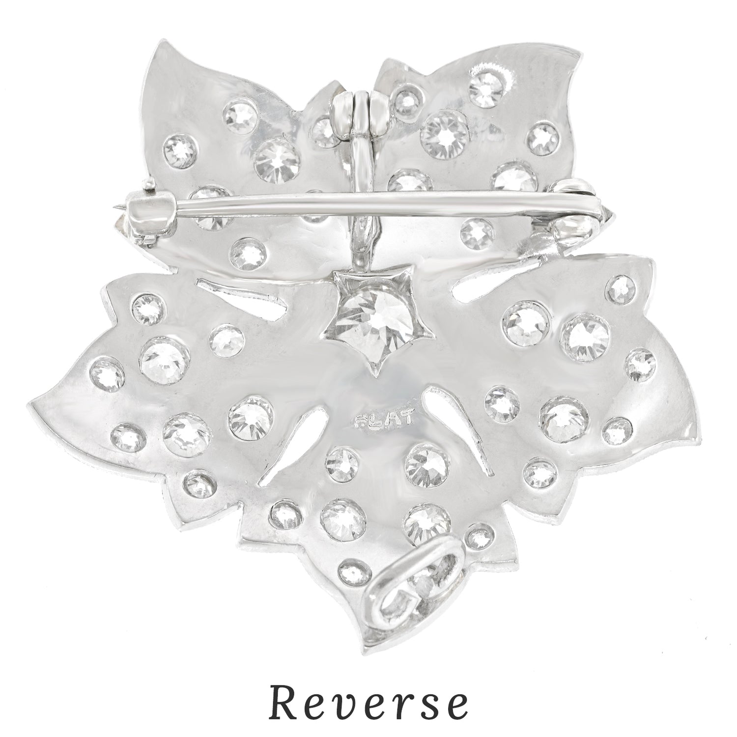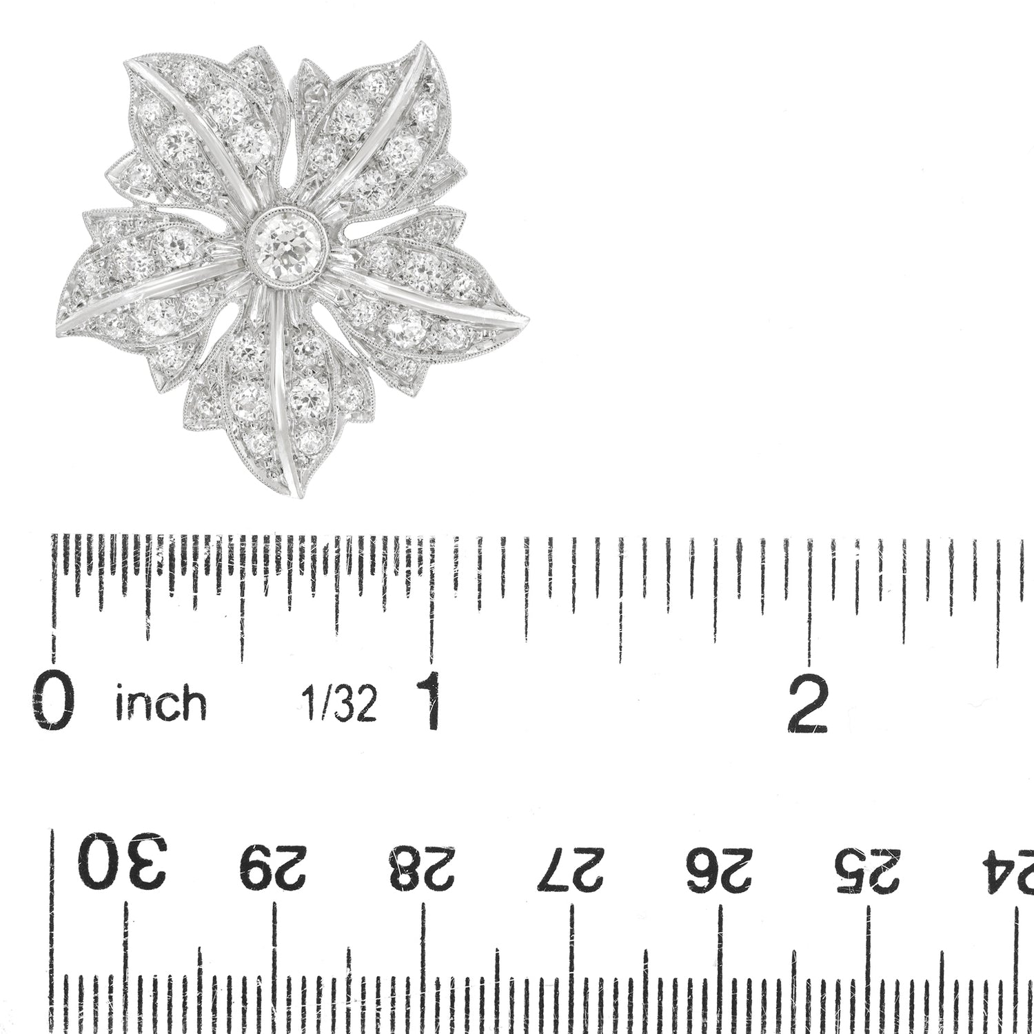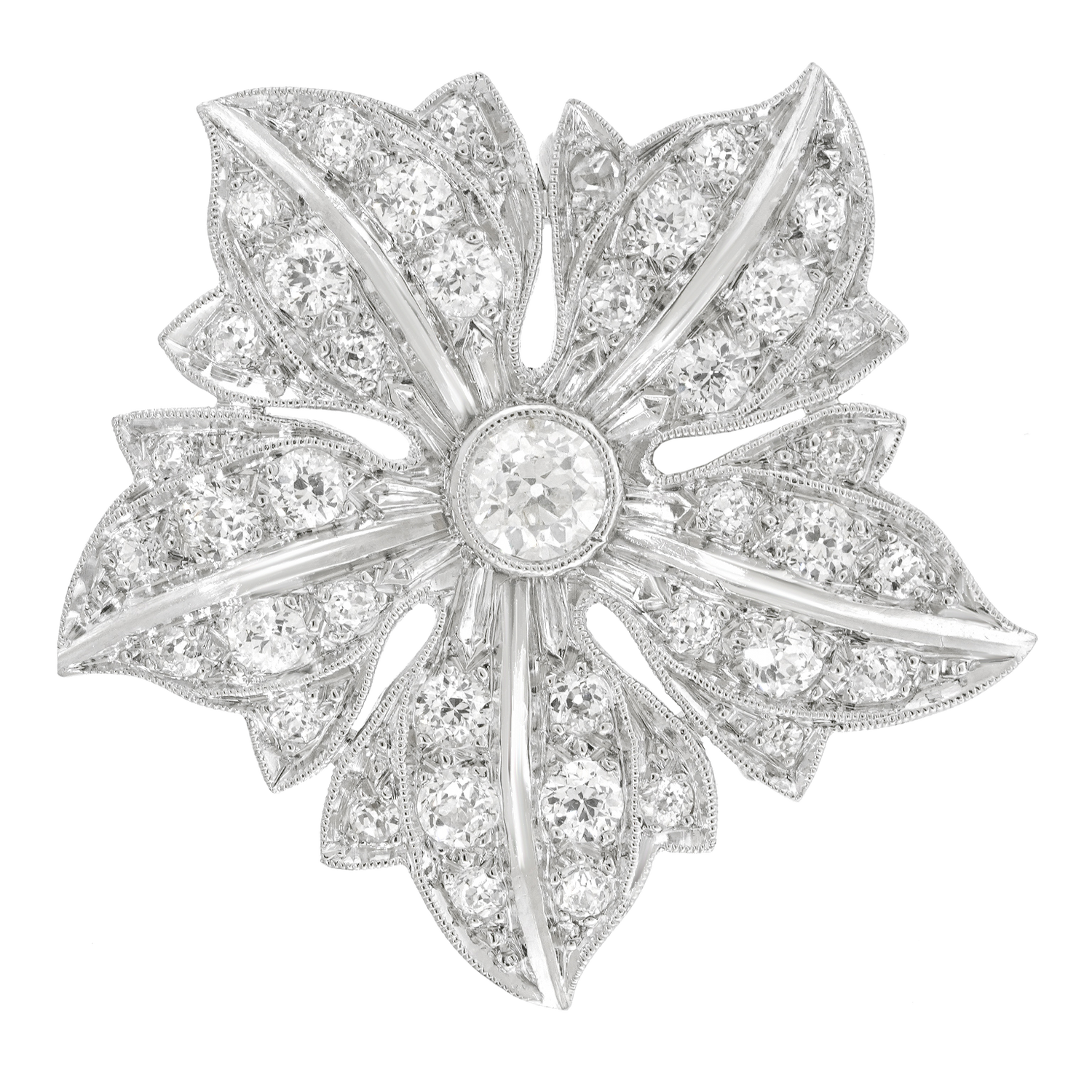 Circa 1920s, Platinum. This cheerful Art Deco brooch features 2.50 carats of brilliant white diamonds (H-G color, SI1-VS clarity). The perfect size; it goes brilliantly on a suit, cocktail dress or gown, it will also be irreverently chic with heels and jeans. Additionally, a great gift for anyone who wears a Tux or sport jacket. Superbly fabricated in platinum, this jewel is in excellent condition.