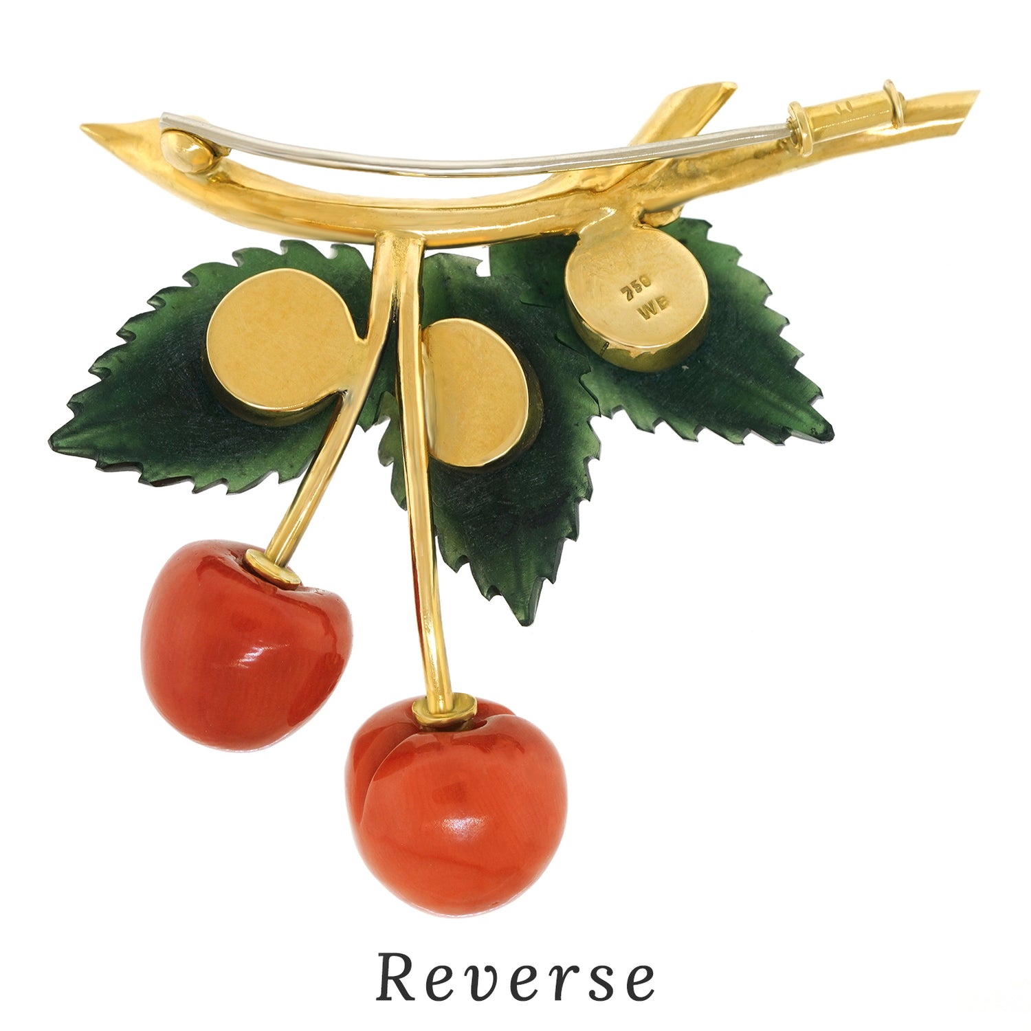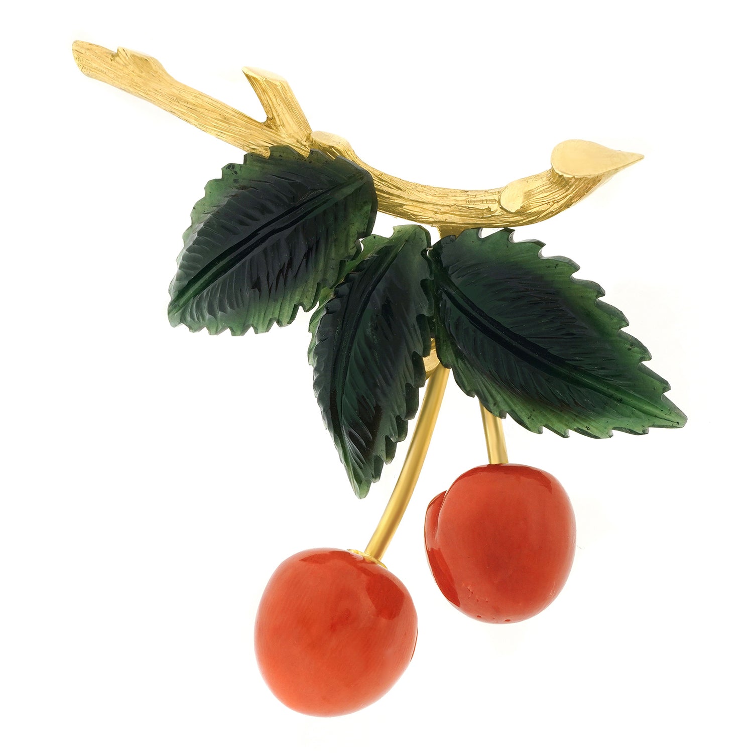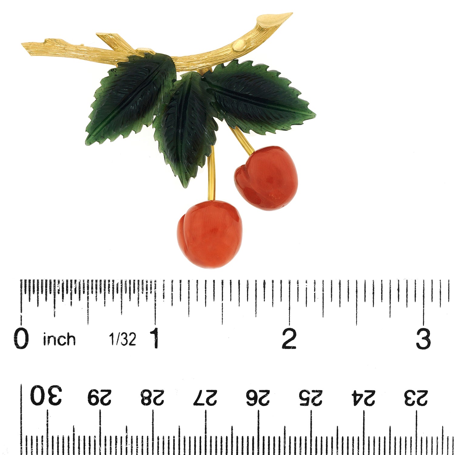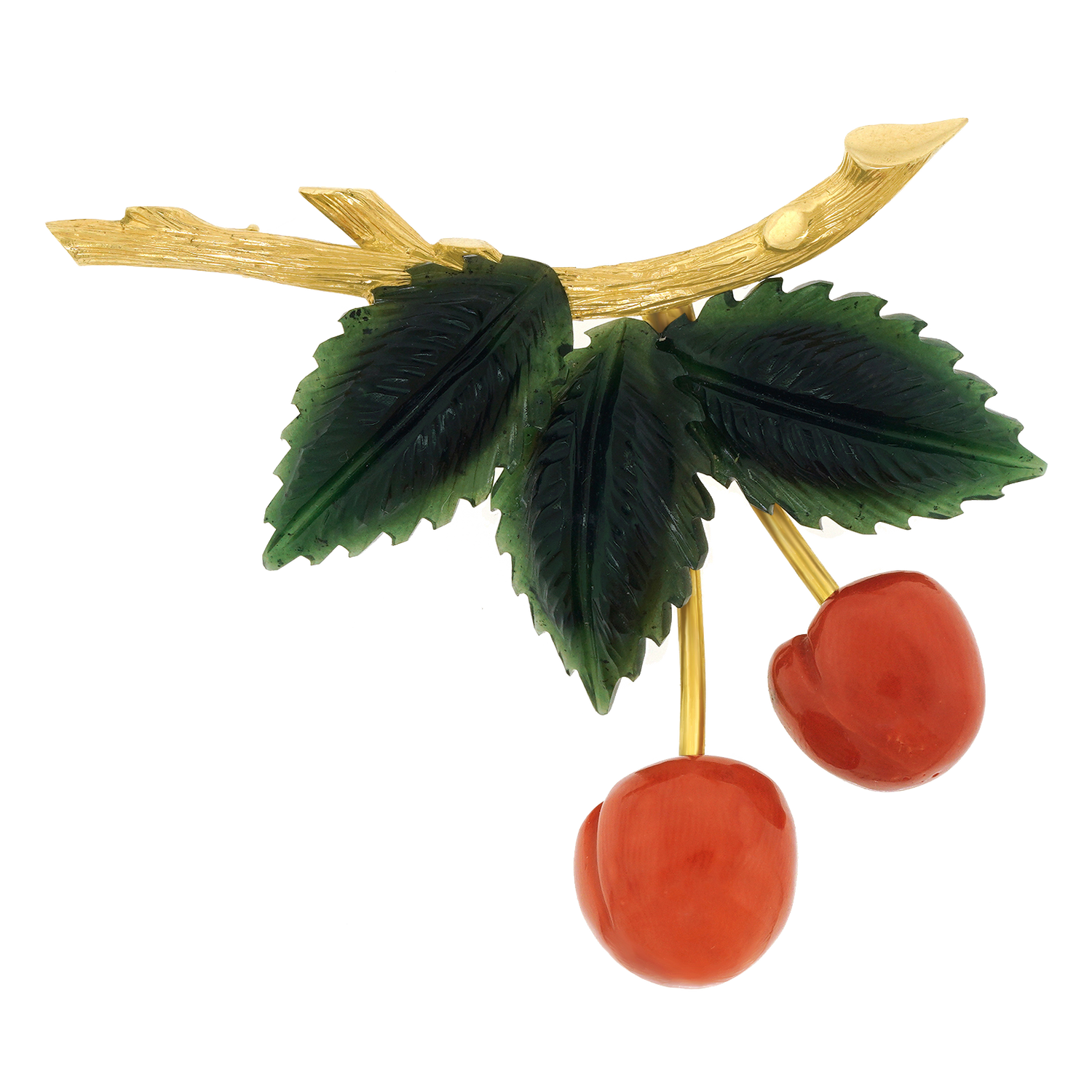 Circa 1920s, 18k, Switzerland. This charming twenties brooch features coral cherries with carved jade leaves, and a handmade 18K gold branch. The look is vintage chic at its antique best. The attention to detail is especially marvelous and the gold work superb. Excellent condition.