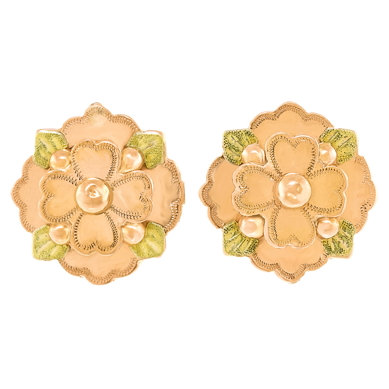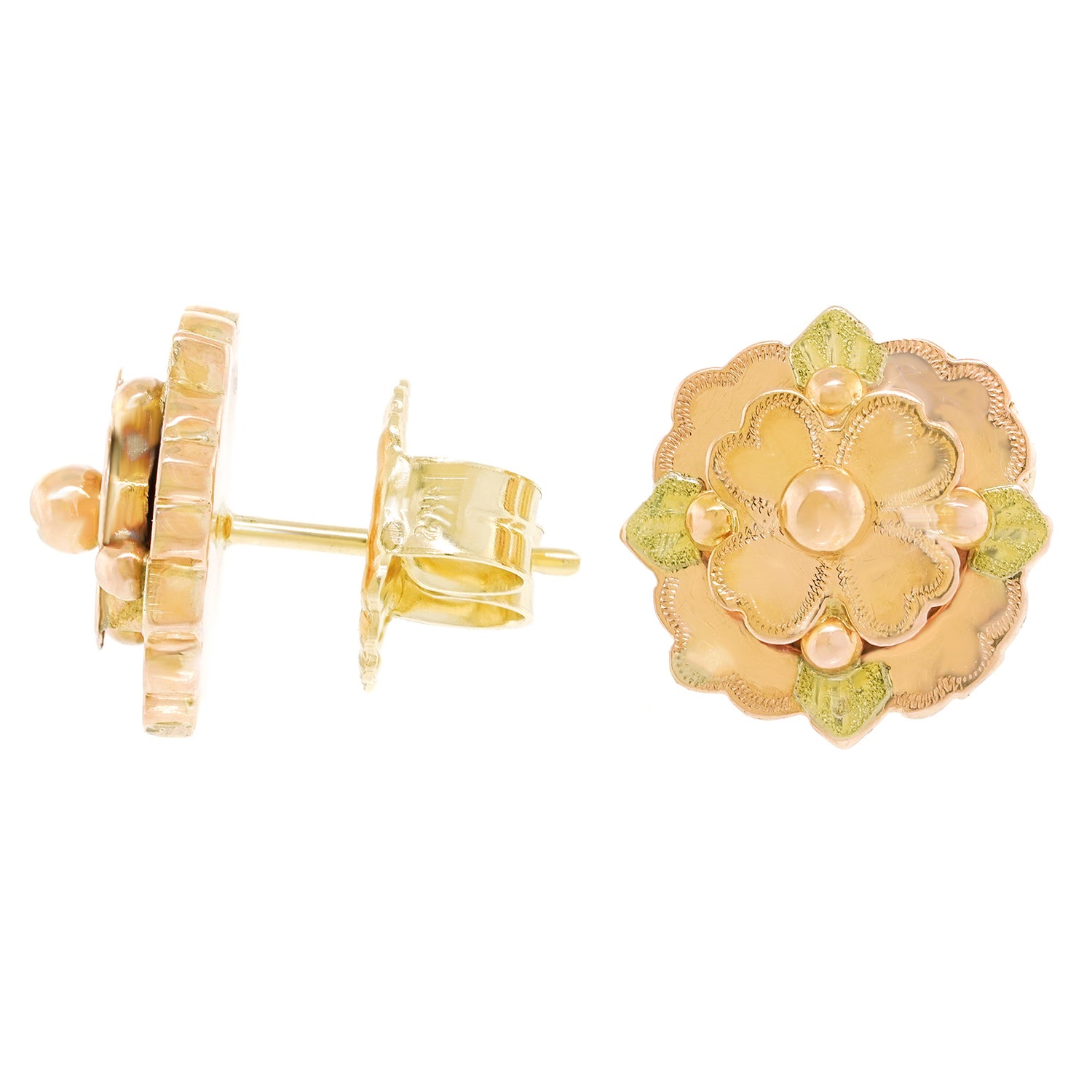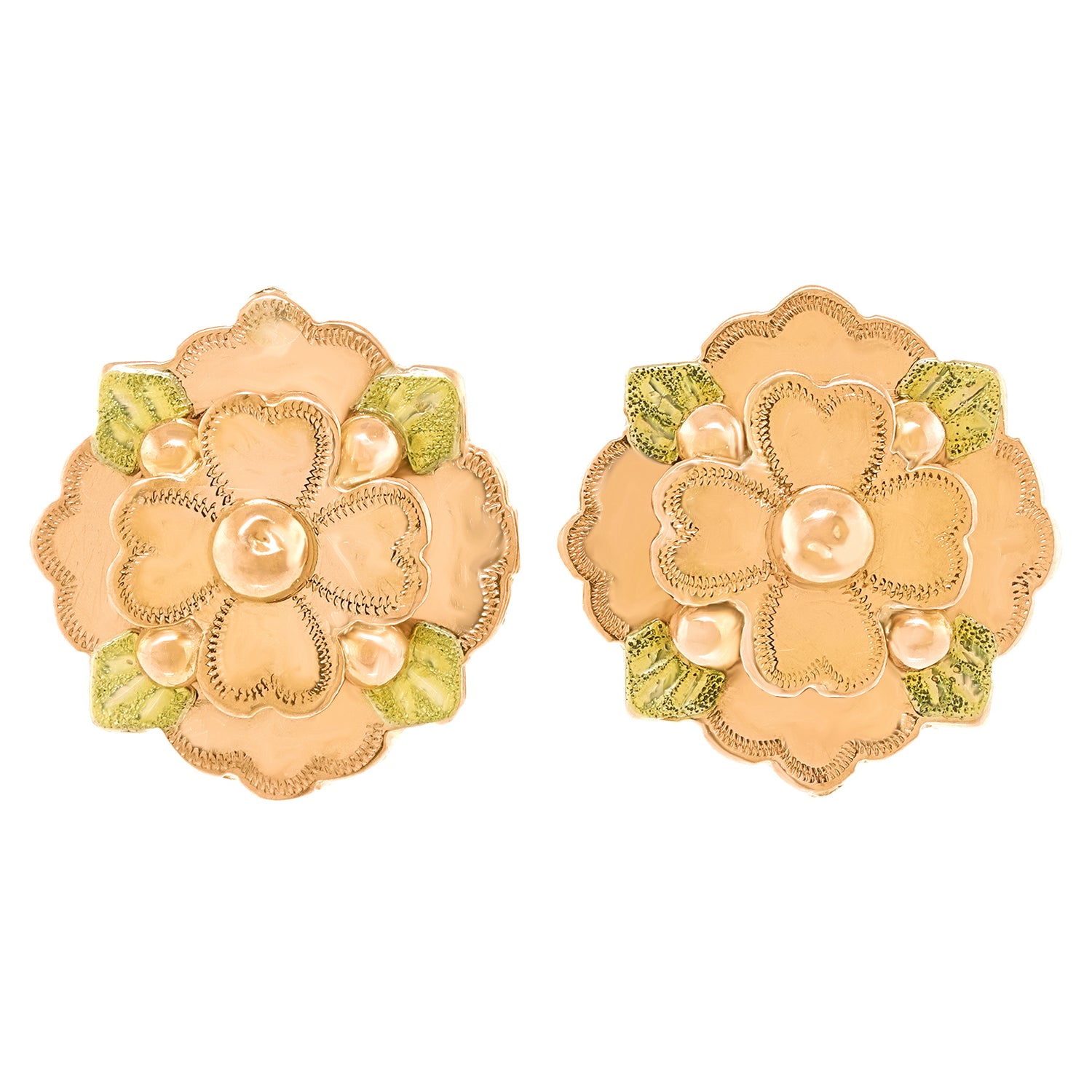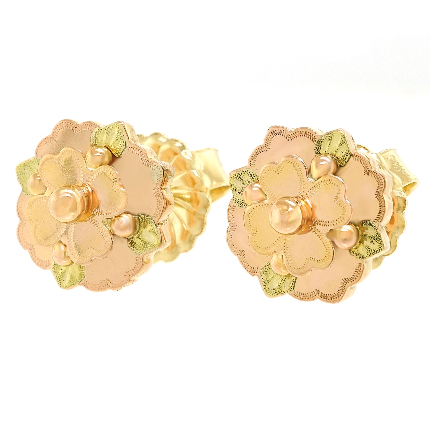 Circa 1880s, 14k. These earrings are the epitome of charm and whimsy. Flowers and leaves. The warm yellow and soft green gold draw the eye. Easy to wear, these antique jewels will become signature style. Excellent condition.