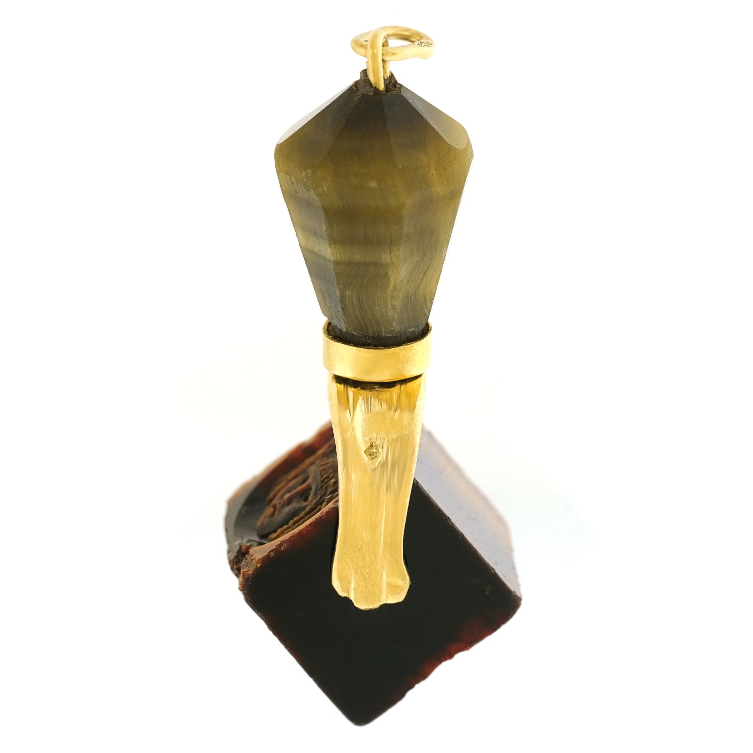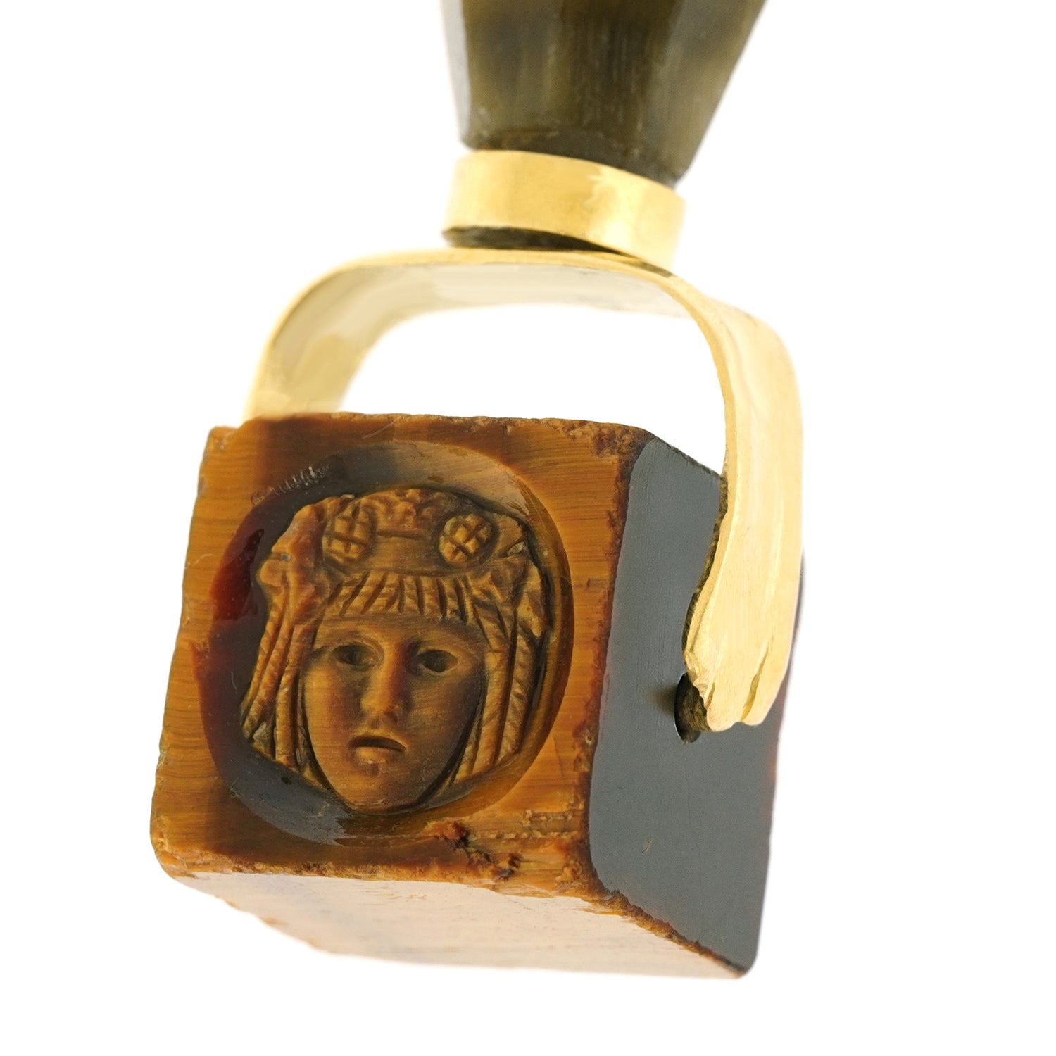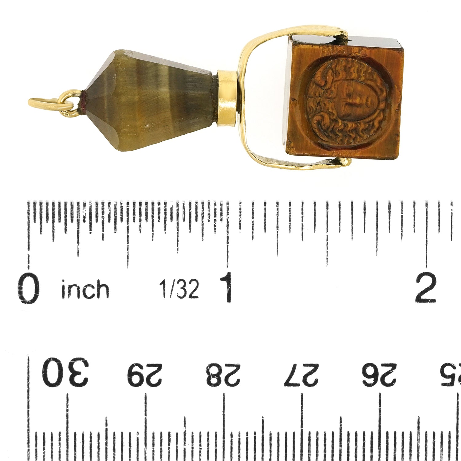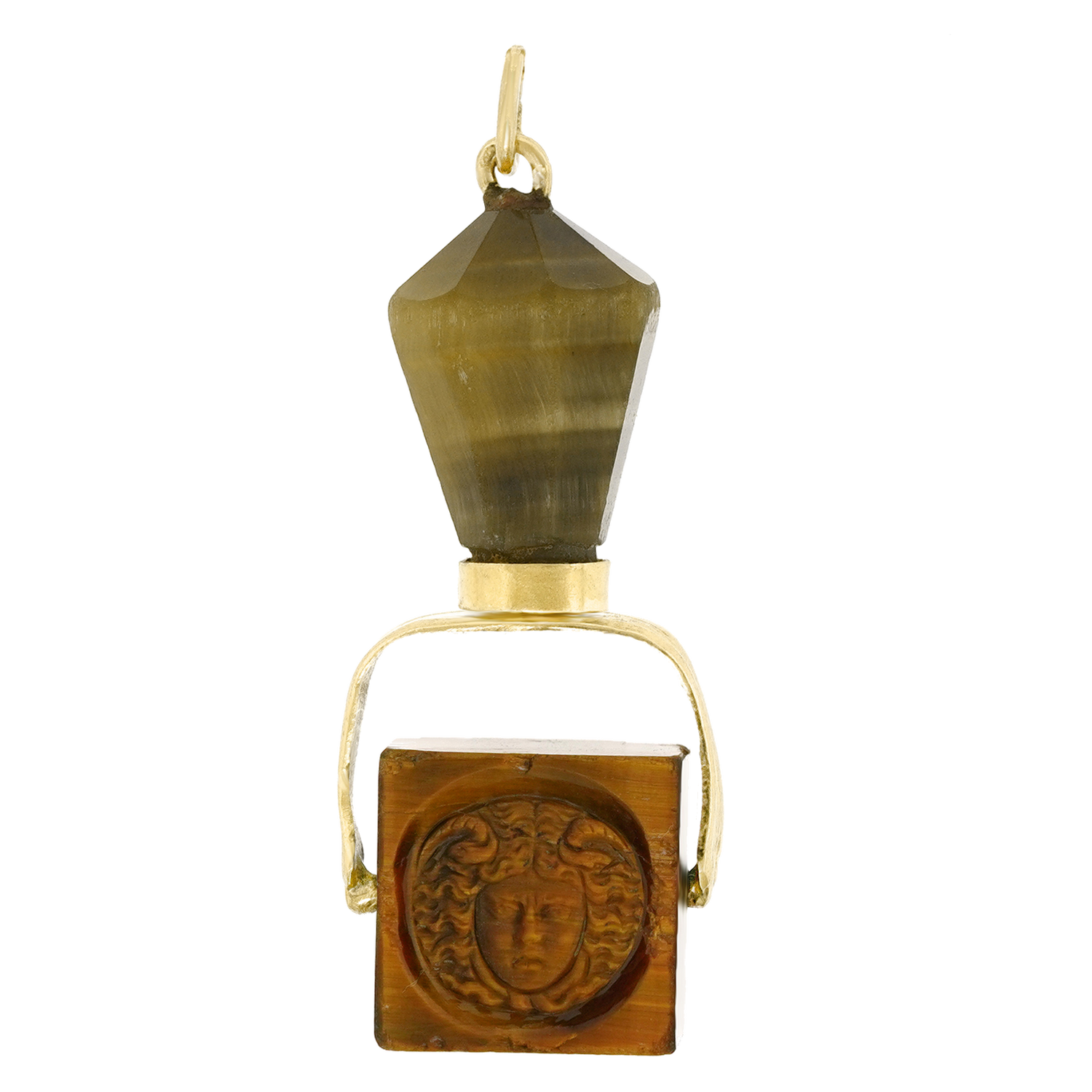 Circa 1880s, 18k, France. This rotating two-sided seal fob with 18k gold mounts is also a charming pendant, perfect for layered multiples. Featuring fine carvings of Medusa before and after her transformation, the look is Gallic town and country chic at its archeological revival best. Wear it long or short, on its own, or as part of a talismanic group. Sturdily constructed, the piece feels wonderful on and has a generous bale. Very good condition.