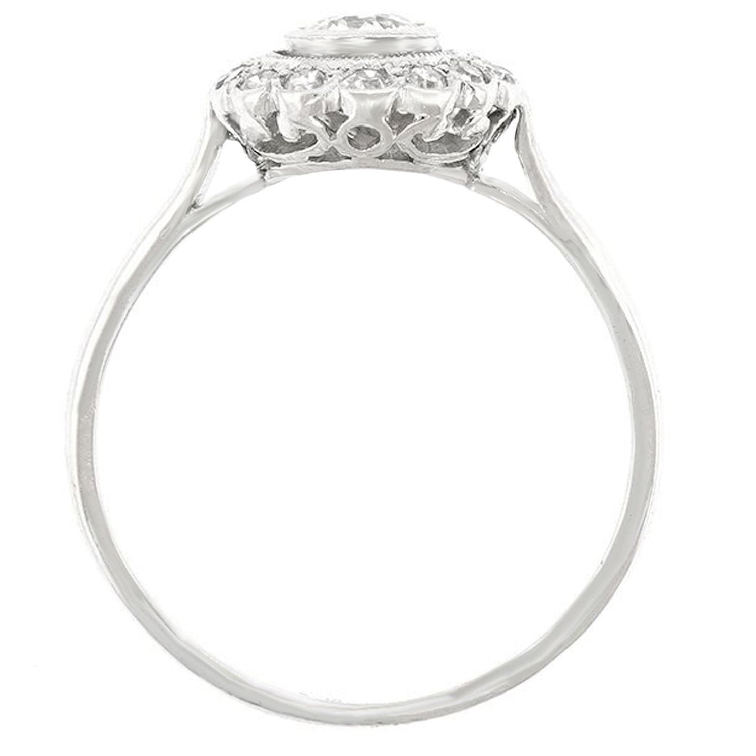 Circa 1920s, platinum, France. Delightfully French, this charming ring has a sophisticated geometric style that shouts Art Deco. Set with a lovely .30 carat center stone (H color, SI1 clarity) surrounded by .21 carats of accent stones it is beautifully made in platinum. Equally perfect as an everyday ring or as an engagement ring, it is in excellent condition.