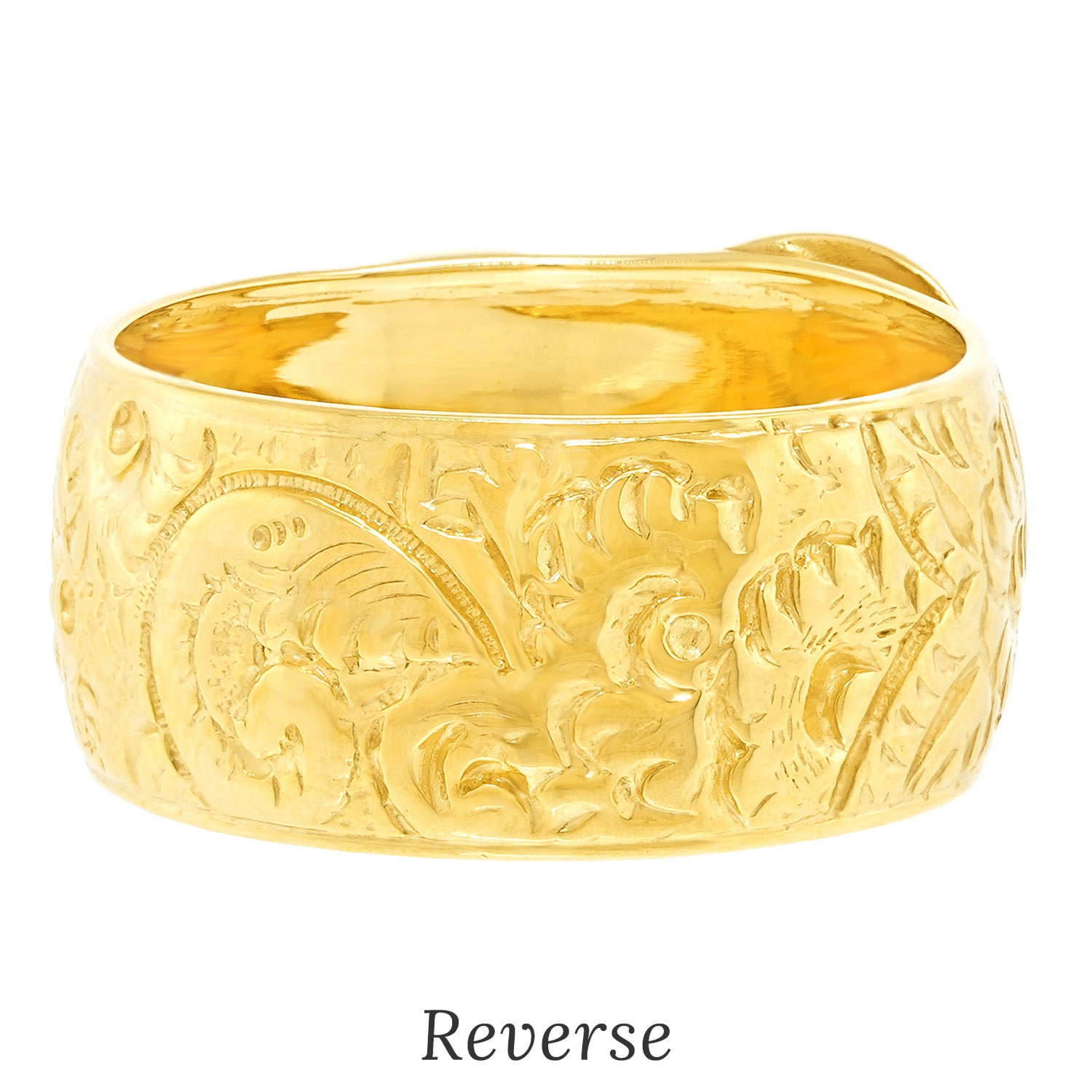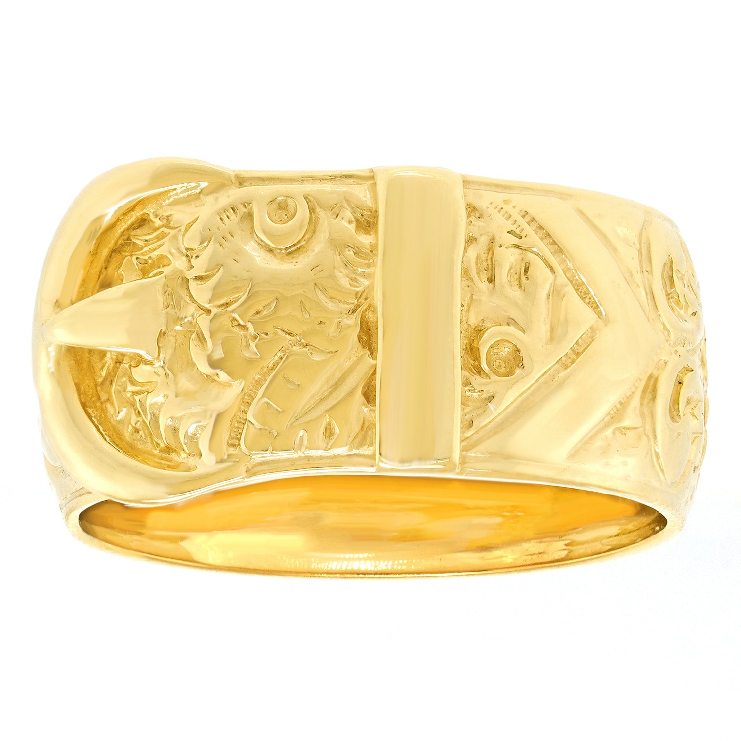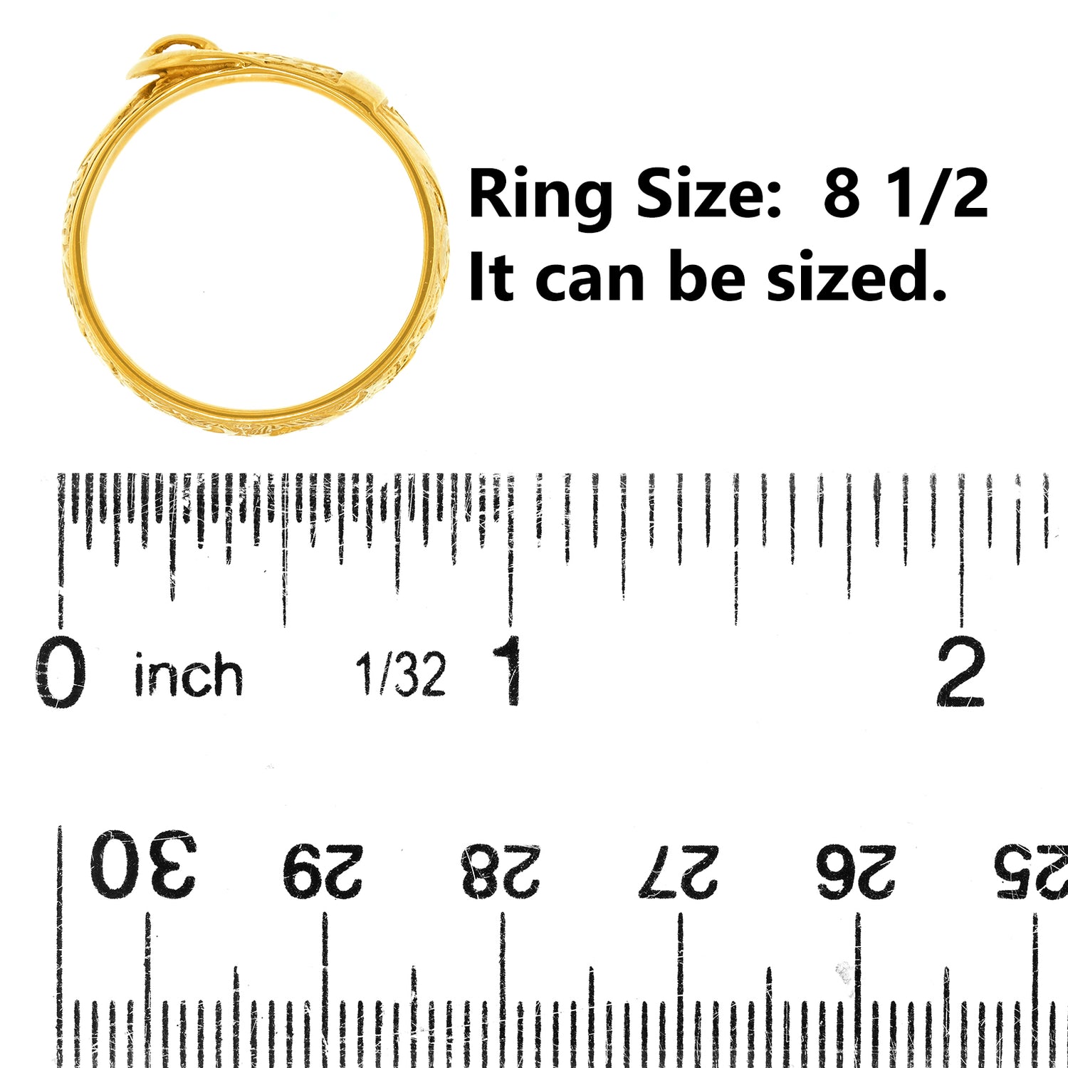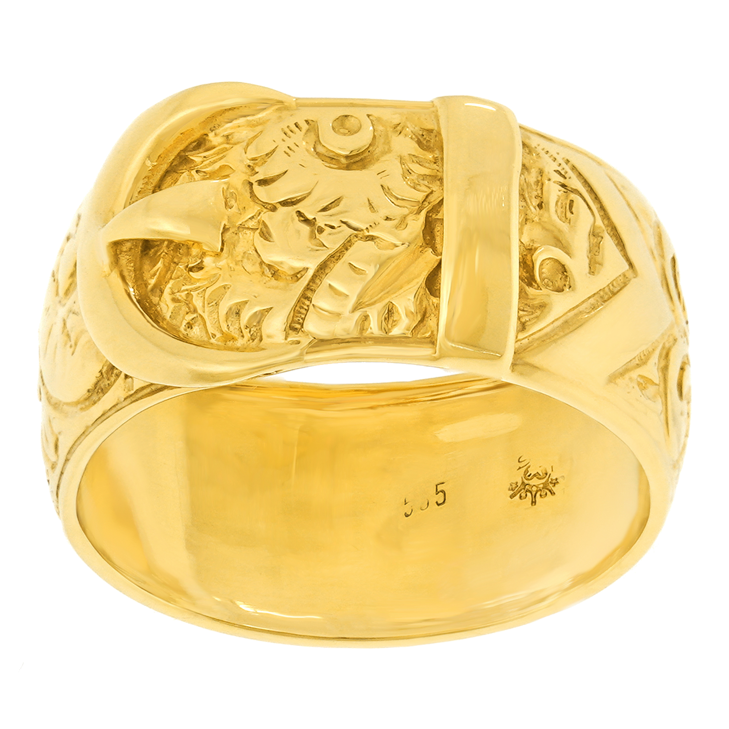 Circa 1890s, 14k. This antique gold buckle ring with its hand-engraved details is quite charming. The look is fashionably Bohemian… vintage chic at its antique best. Handmade in fourteen karat gold, pieces like this one began a style that is as chic and popular today as it was brilliantly nouvelle over 150 years ago. Excellent condition.