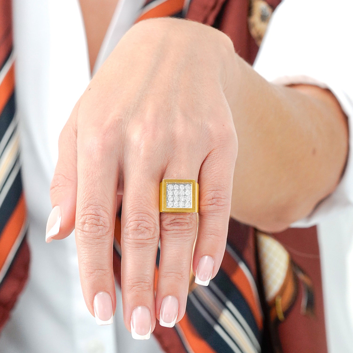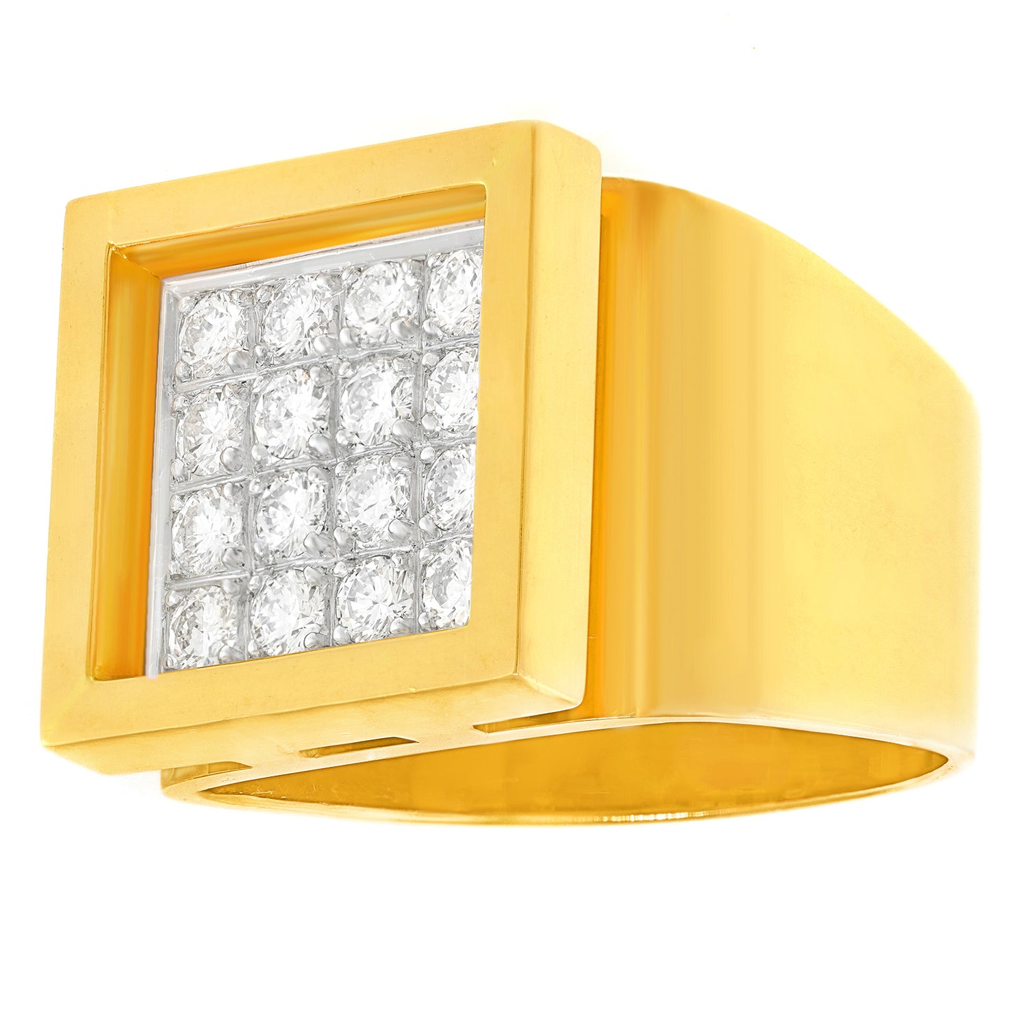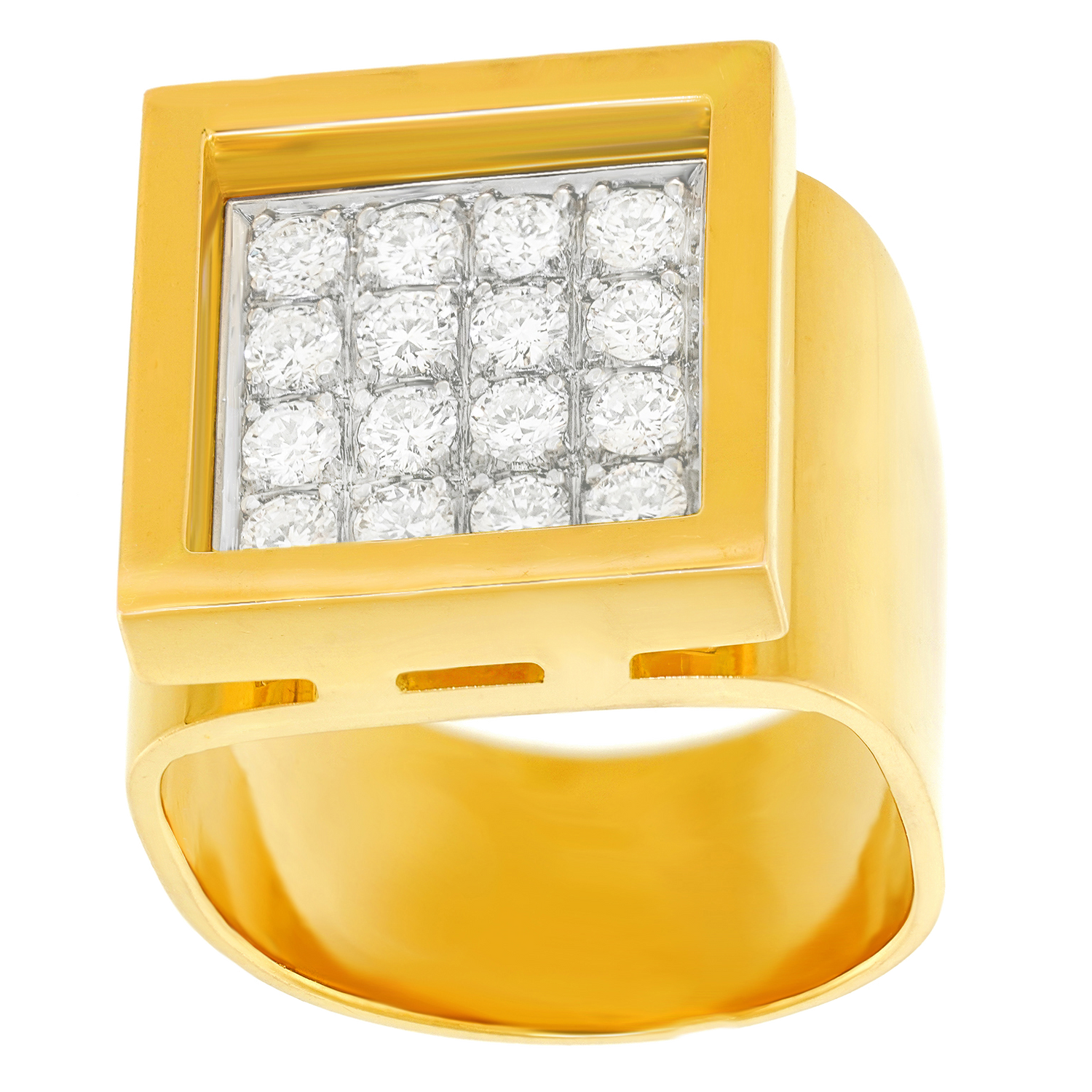 Circa 1960s, 18k, Switzerland. In the big bold, diamonds, and gold category, this ring has it all - a fabulous sixties Modernist design, 1.0 carats of fine white diamonds (H color, VS clarity), and a sophisticated visual presence. Fine fabrication completes the picture. Excellent condition.