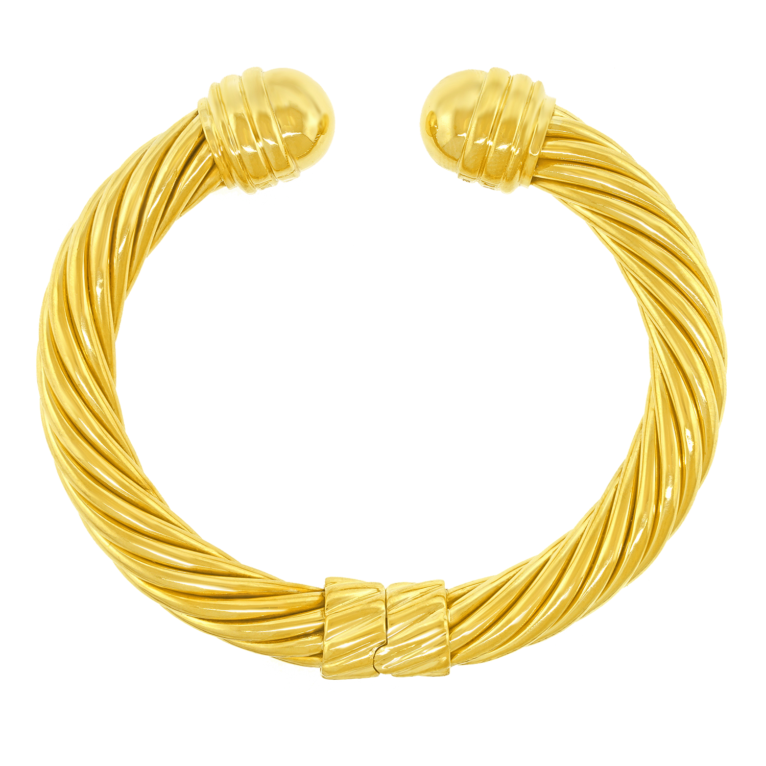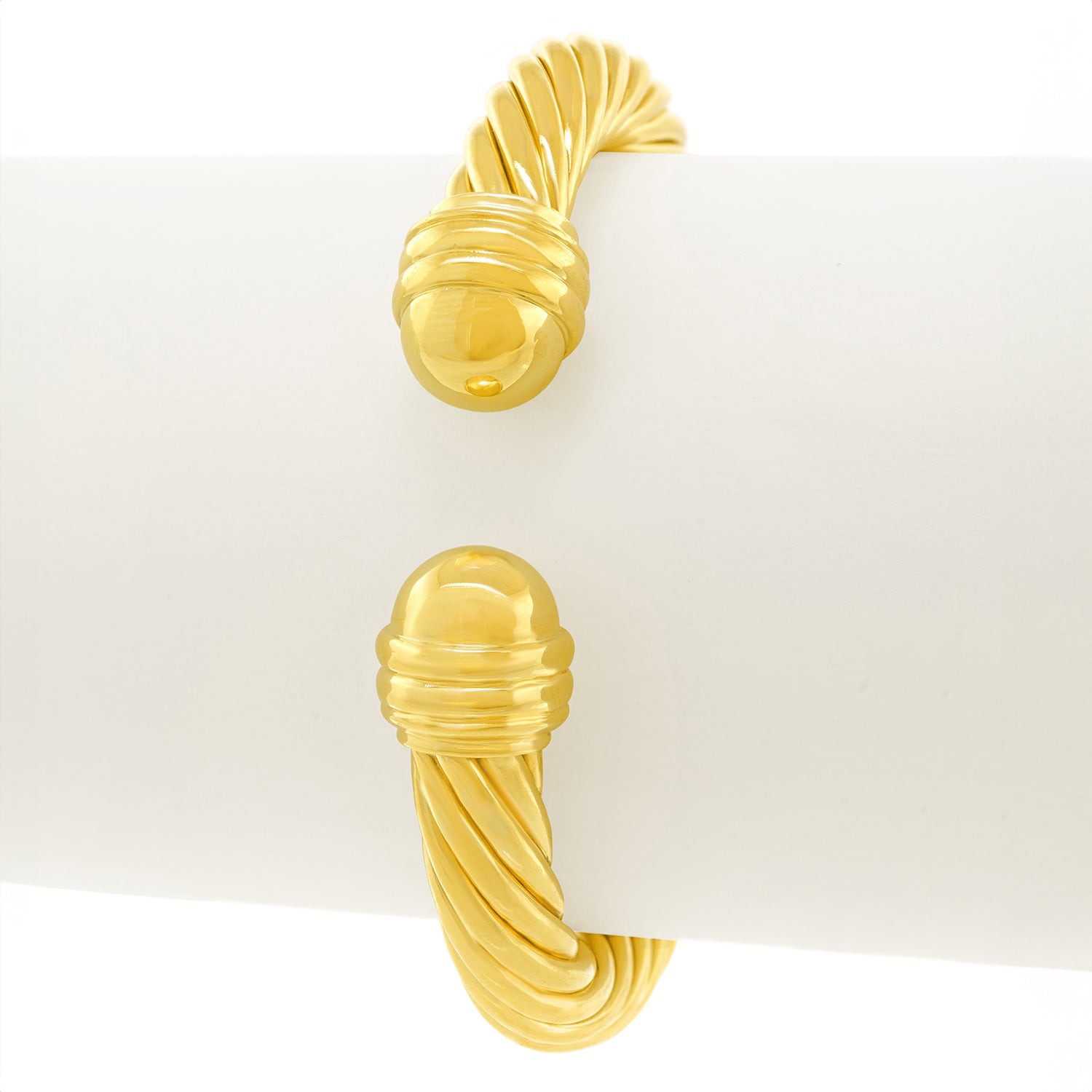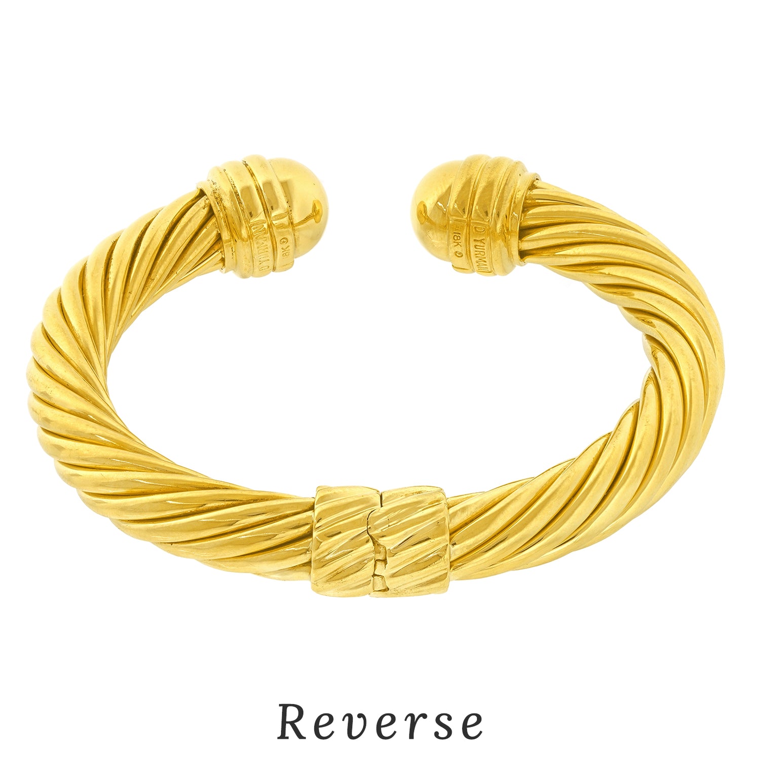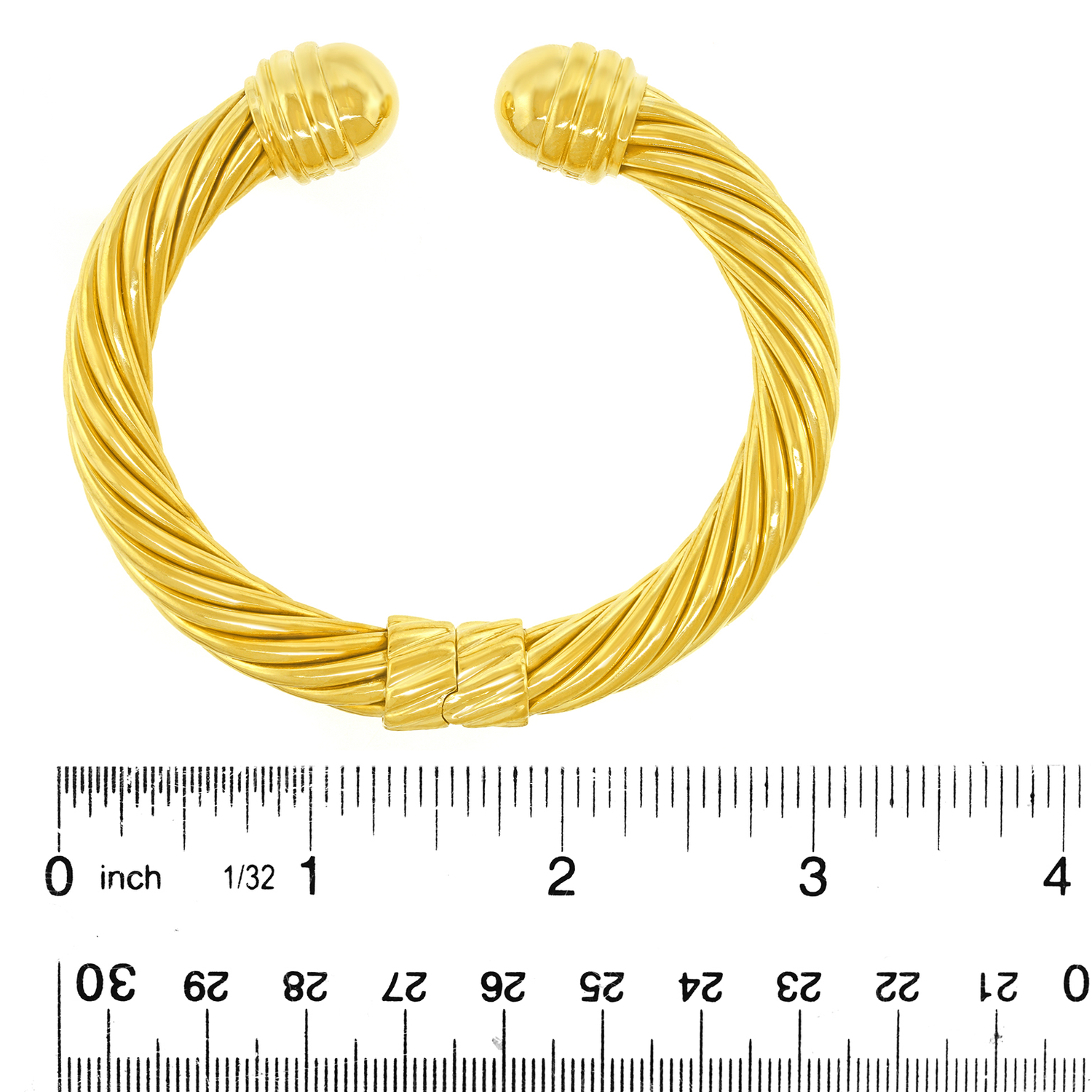 Circa 1990s, 18k, by David Yurman, American. Tasteful and tailored (David Yurman's sweet spot). This is your goes everywhere, does everything yellow gold bangle bracelet! Instantly recognizable, the iconic cable twist motif is a fashion staple. This bracelet stands alone and looks great as part of a multiples stack. Quality fabrication completes the picture. Excellent condition.