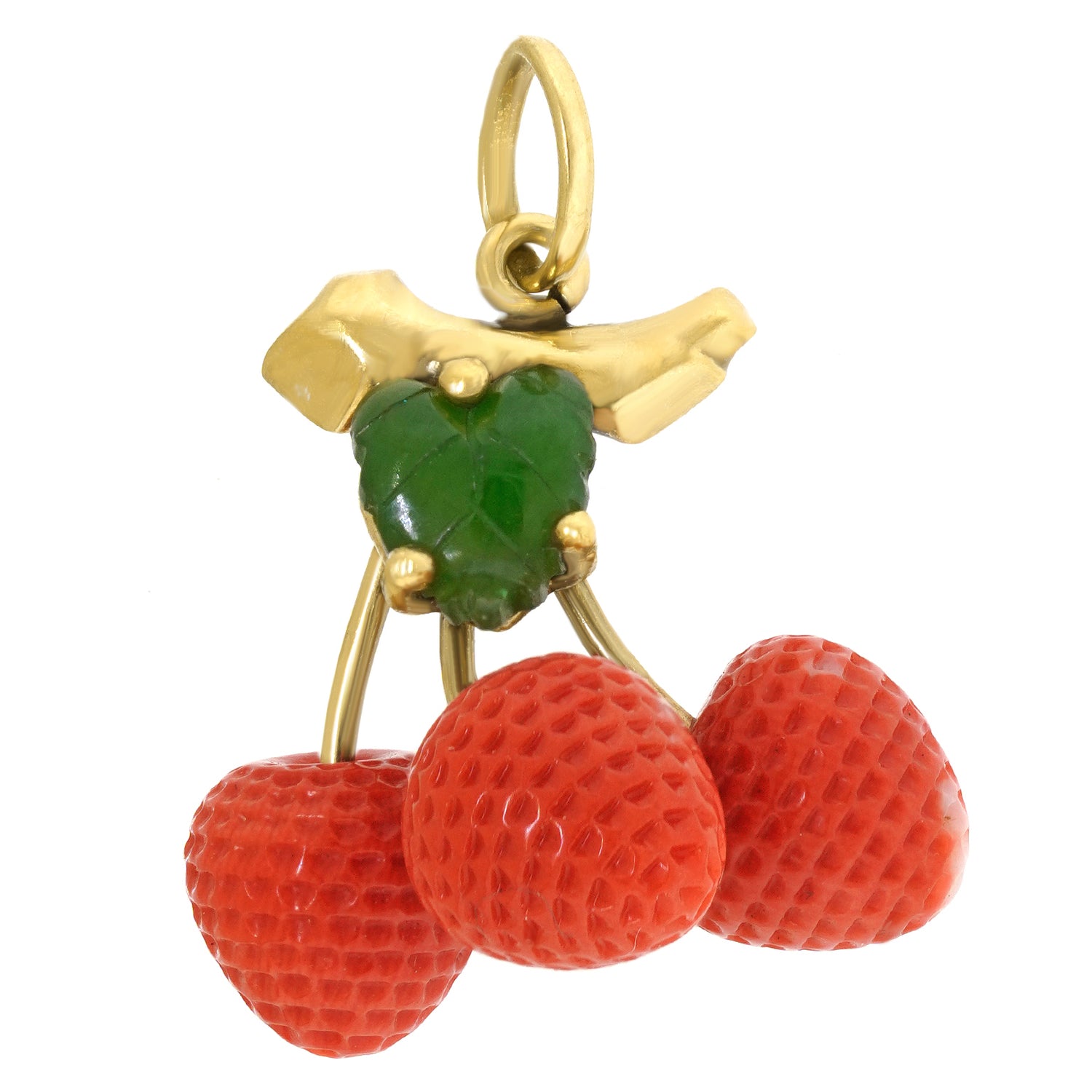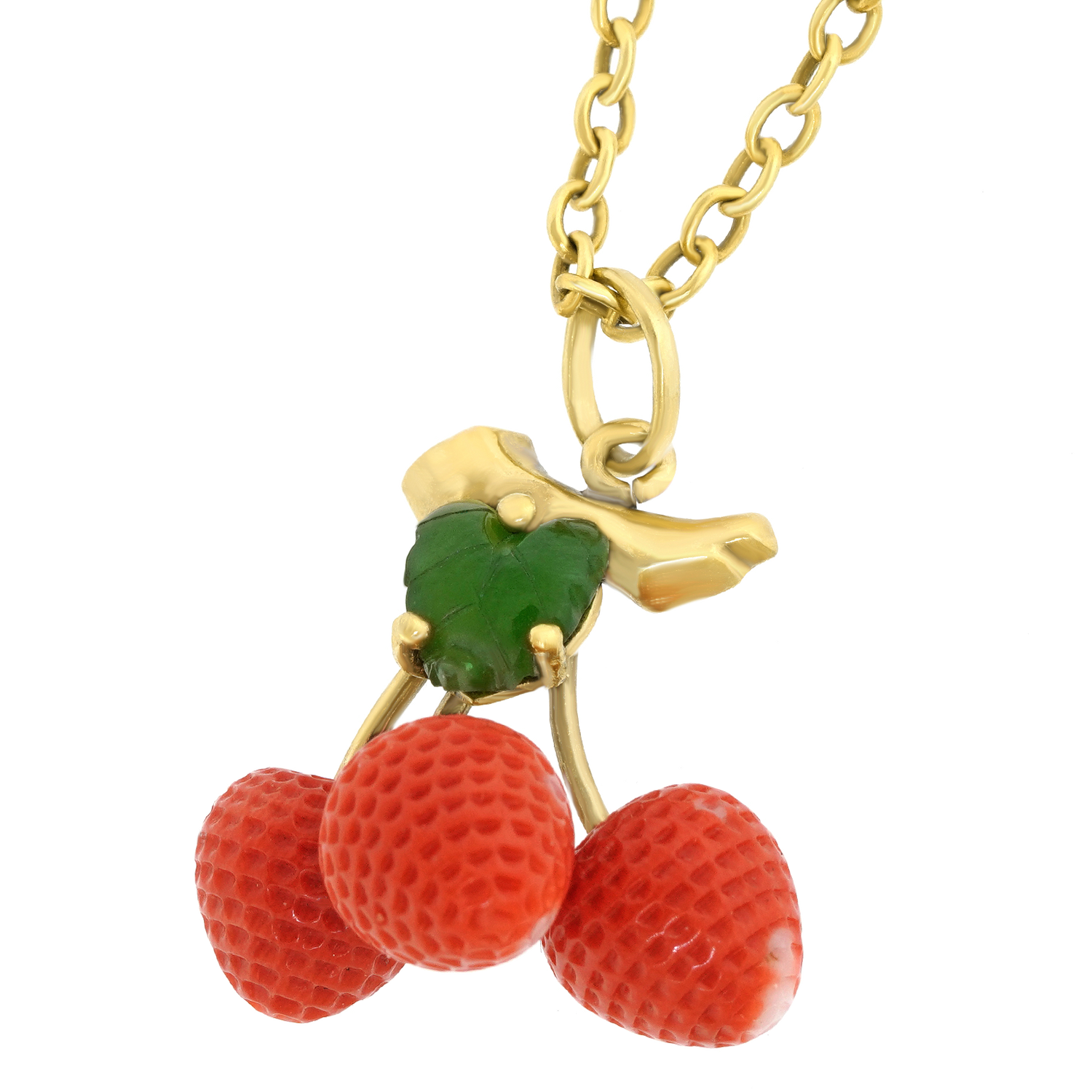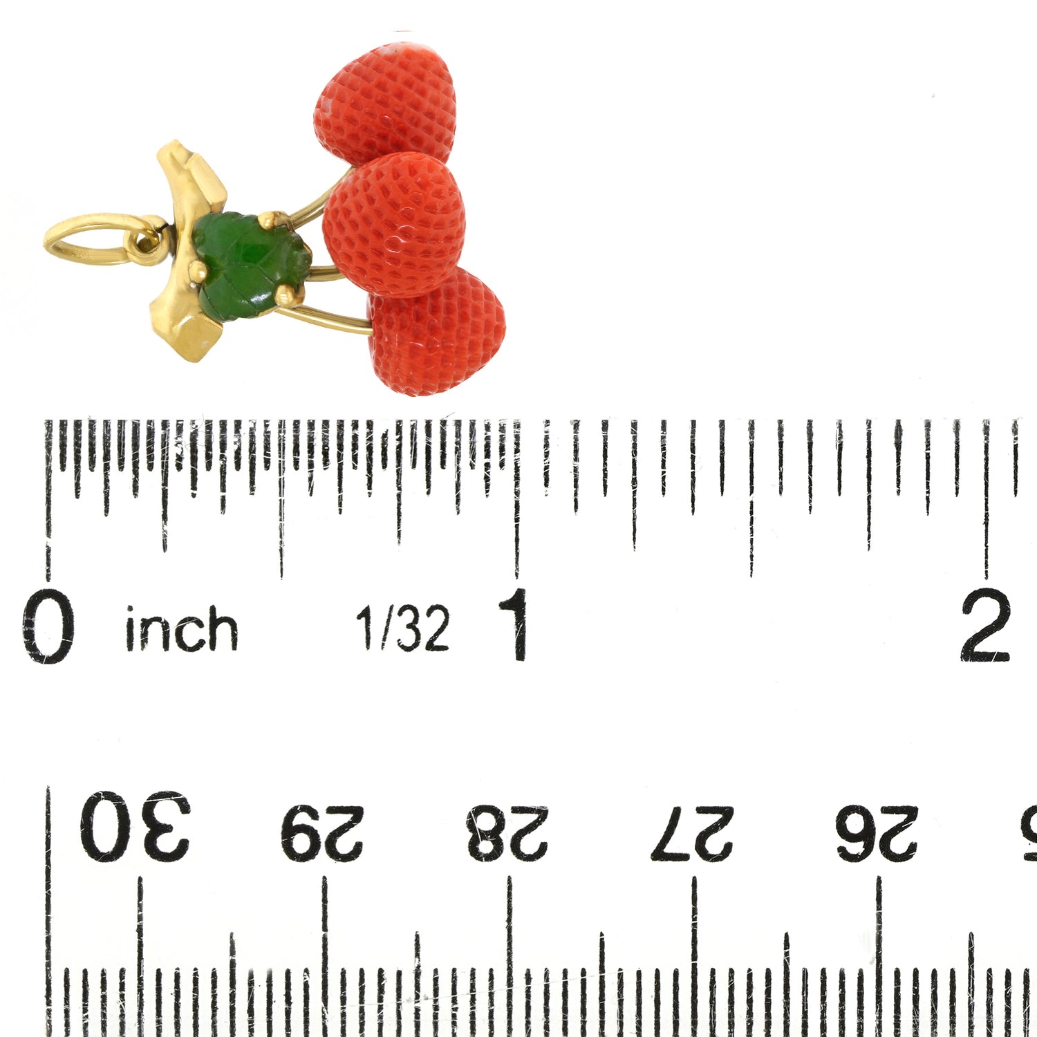 Circa 1950s, 18k, possibly Swiss. This charming strawberry pendant is redolent of warm alpine summers. These tiny wild strawberries, fresh off the vine, are found in the upland forests of Switzerland and must be eaten when picked ...a perfect summer moment. Carved in coral and jade, this pendant is a colorful treasure. Excellent condition.