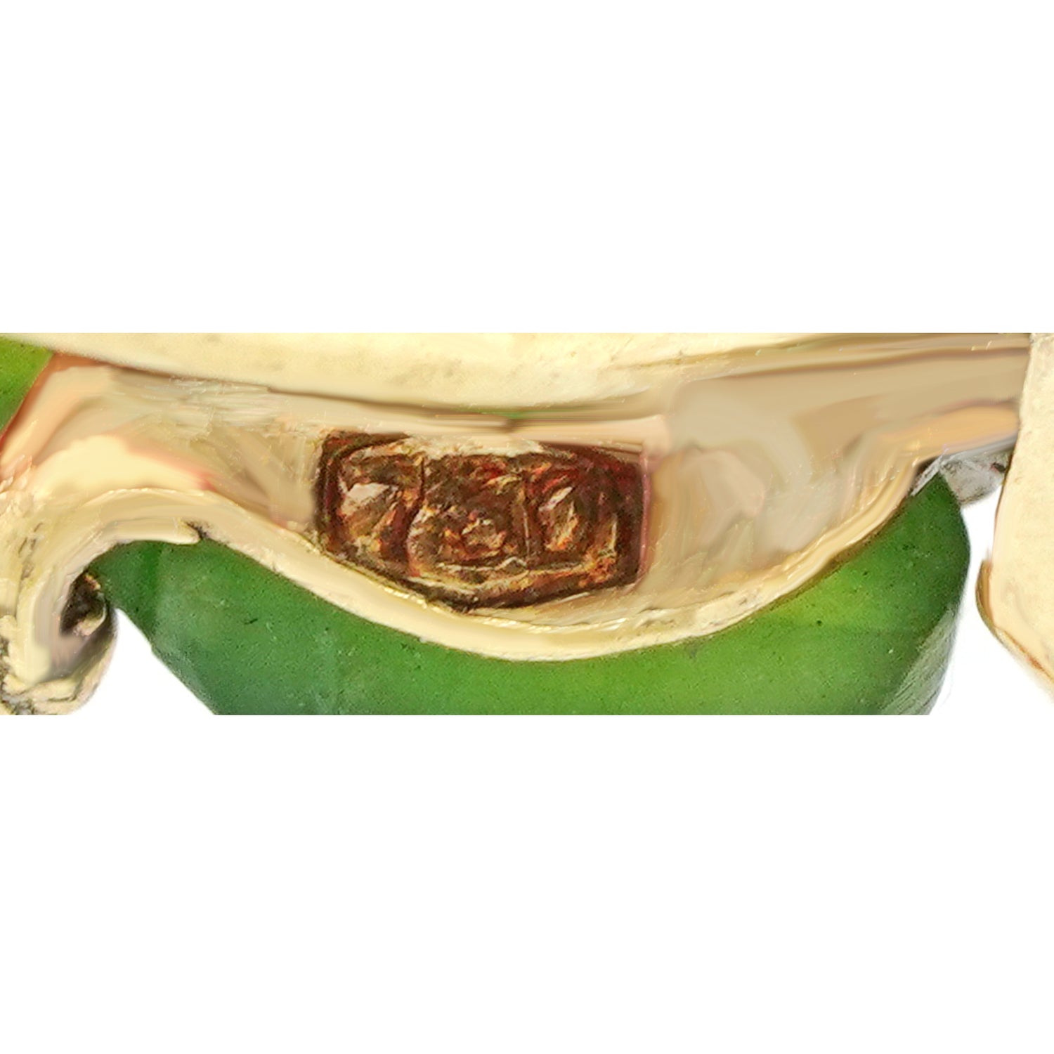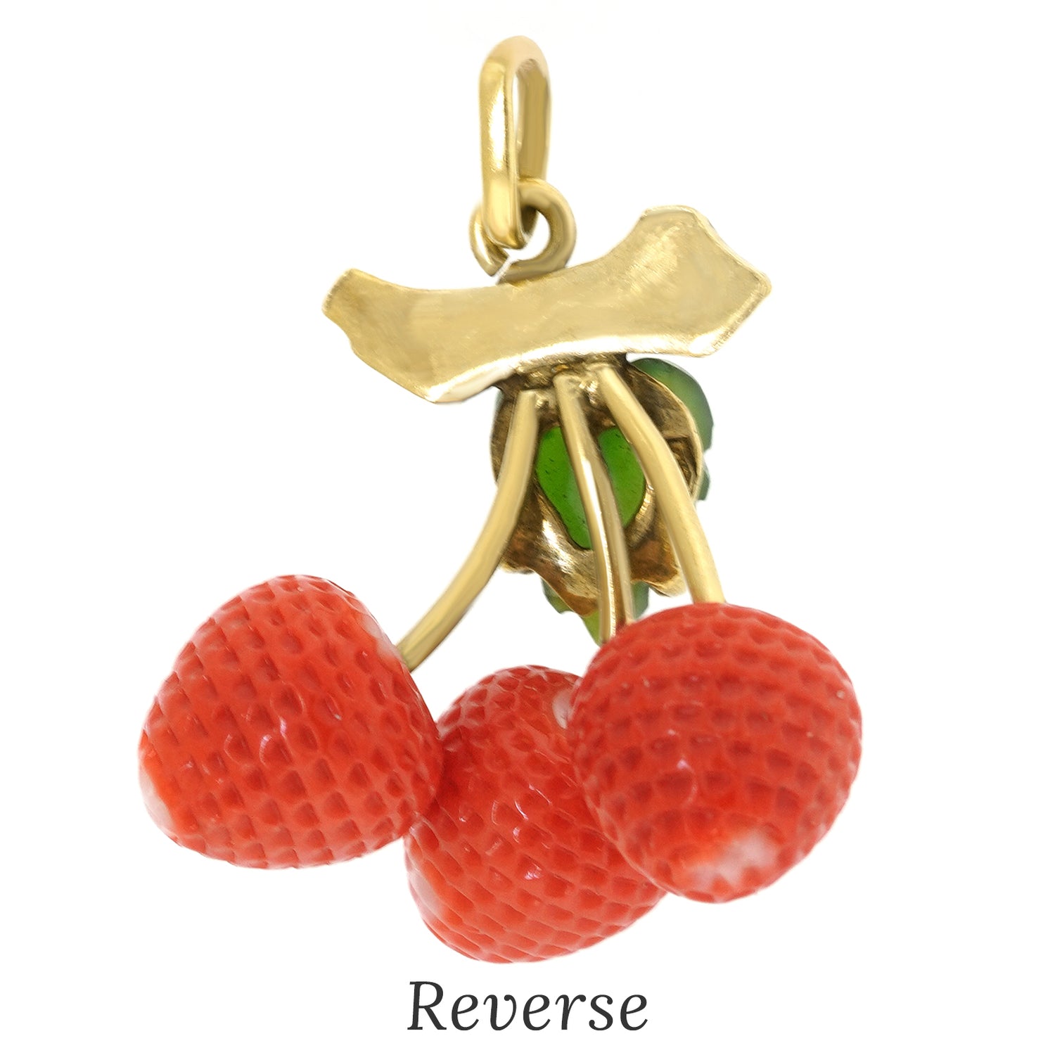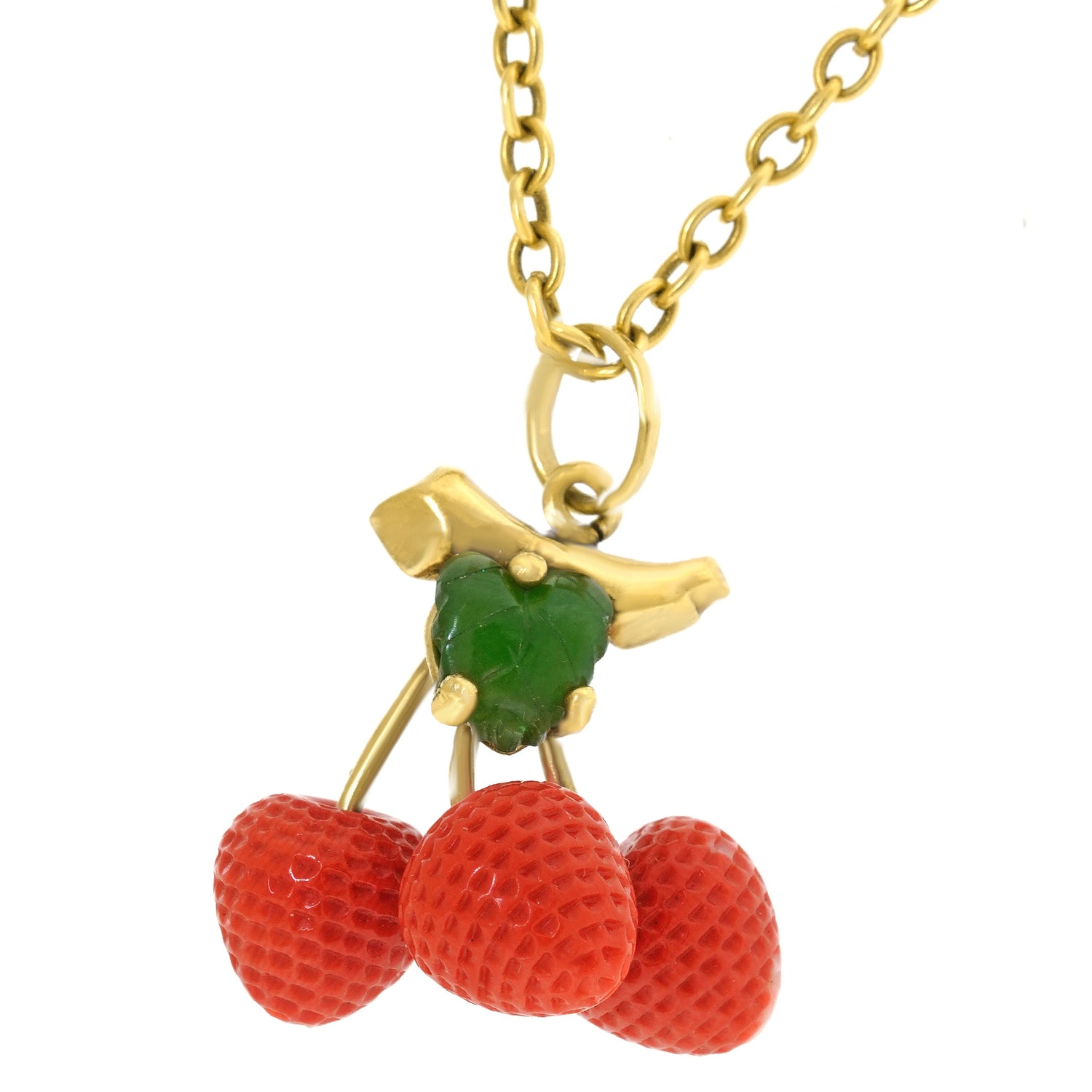 Circa 1950s, 18k, possibly Swiss. This charming strawberry pendant is redolent of warm alpine summers. These tiny wild strawberries, fresh off the vine, are found in the upland forests of Switzerland and must be eaten when picked ...a perfect summer moment. Carved in coral and jade, this pendant is a colorful treasure. Excellent condition.