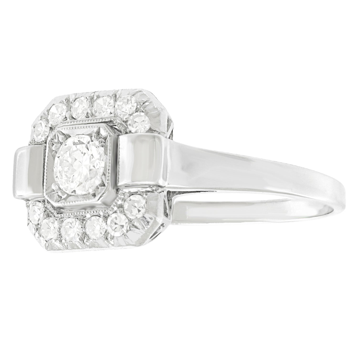 Circa 1920s, 14k, Switzerland. Delightfully bright and spectacularly Art Deco, this charming ring has a sophisticated geometric motif. Impeccable as an everyday ring or engagement ring, its fine white .25 carat diamond (F color, SI1 clarity) is surrounded by .35 carats of additional stones. Beautifully made in 14k white gold, it is in excellent condition.
