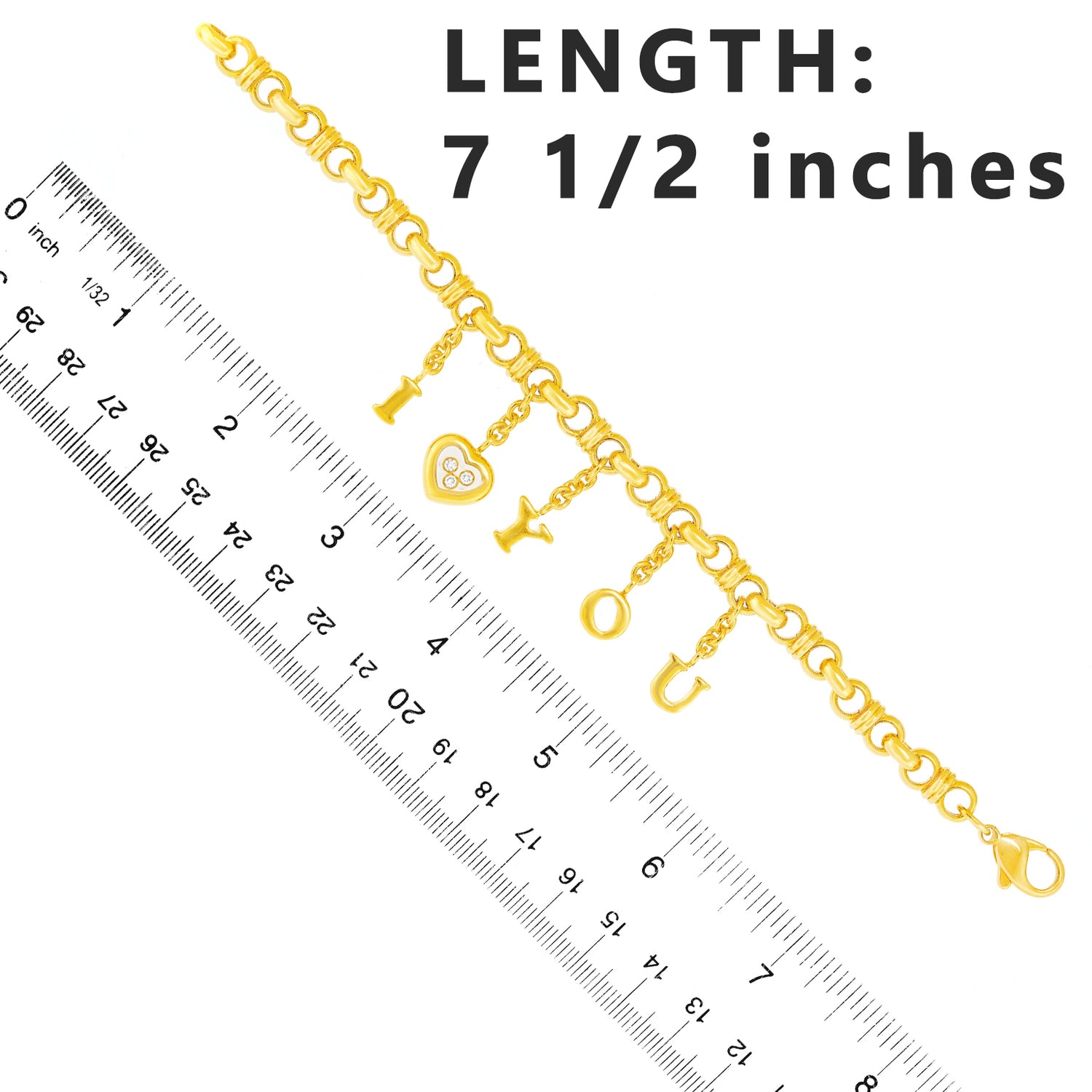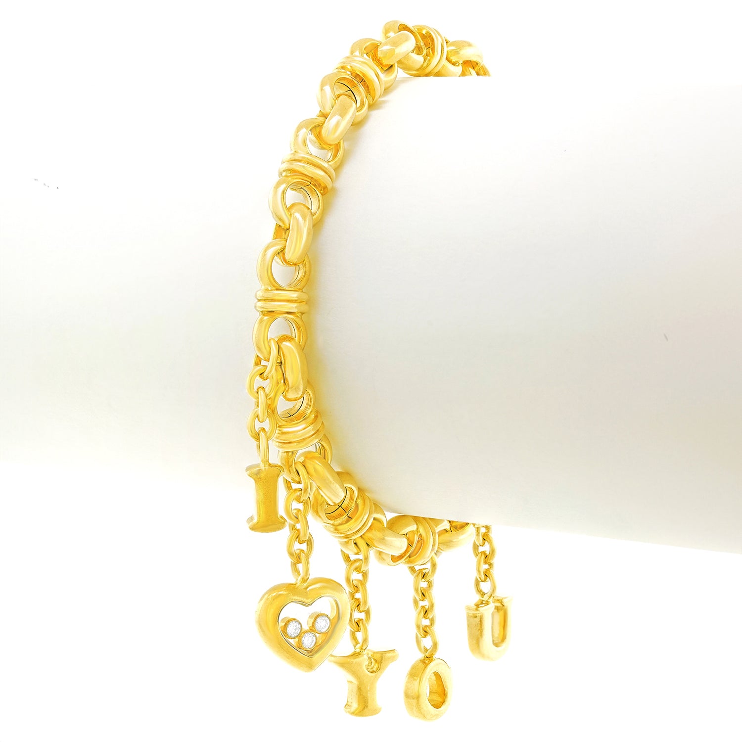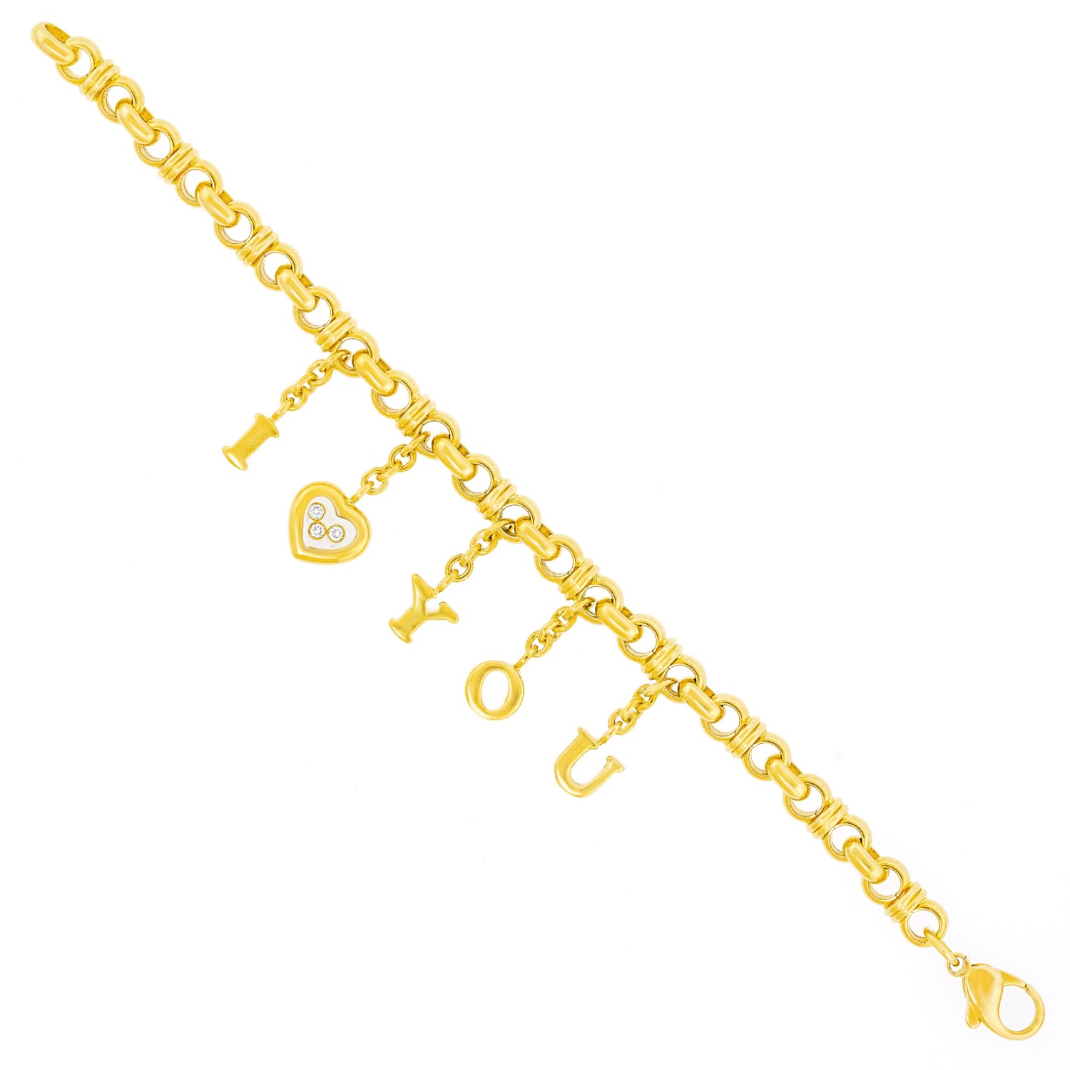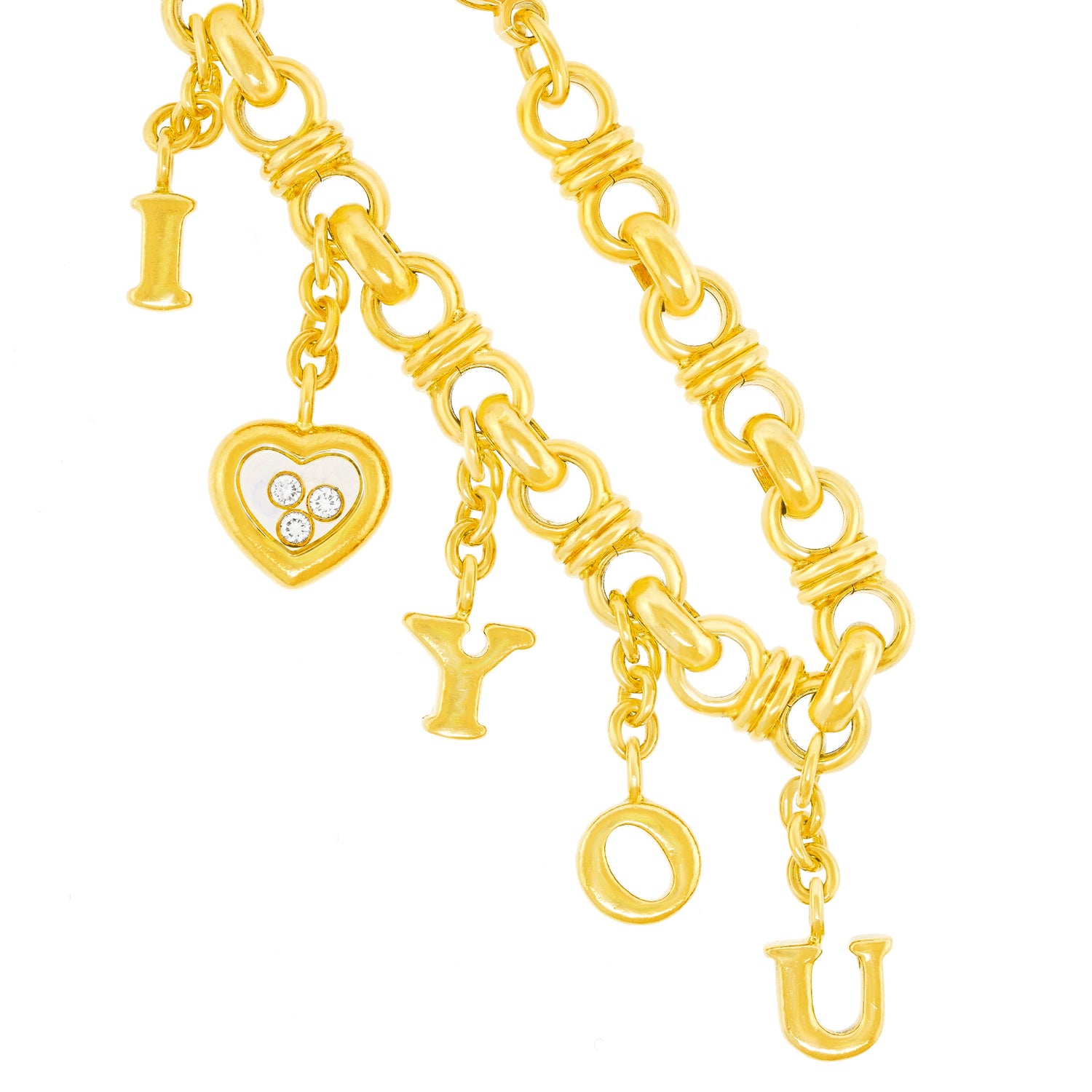 Circa 1990s, 18k, by Chopard, Switzerland. This Chopard "I Love You" charm bracelet is a playful expression of the happy diamonds style. The look says fashion is fun! Perfect on its own or brilliantly stacked with other bracelets. Finely fashioned in 18k yellow gold, it is in excellent condition.