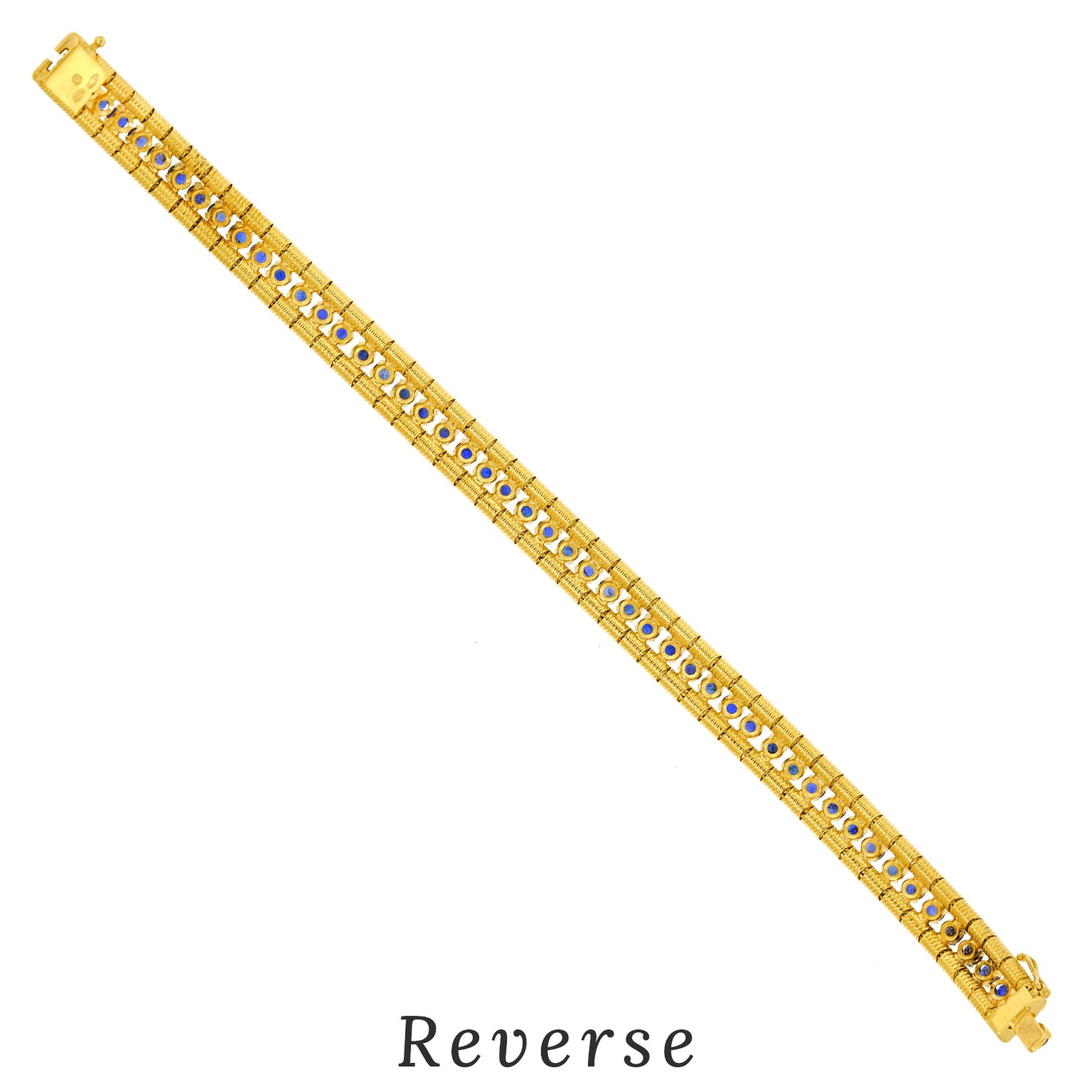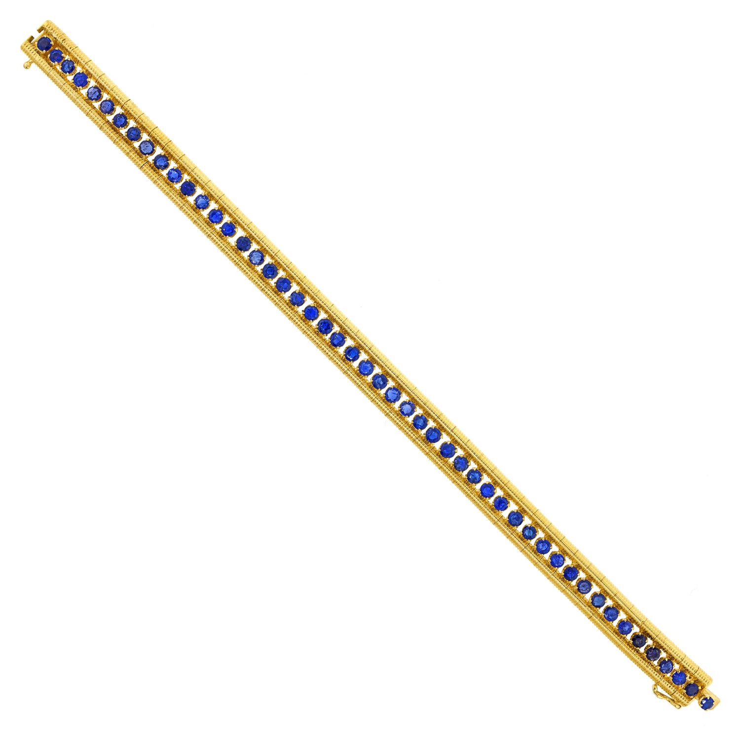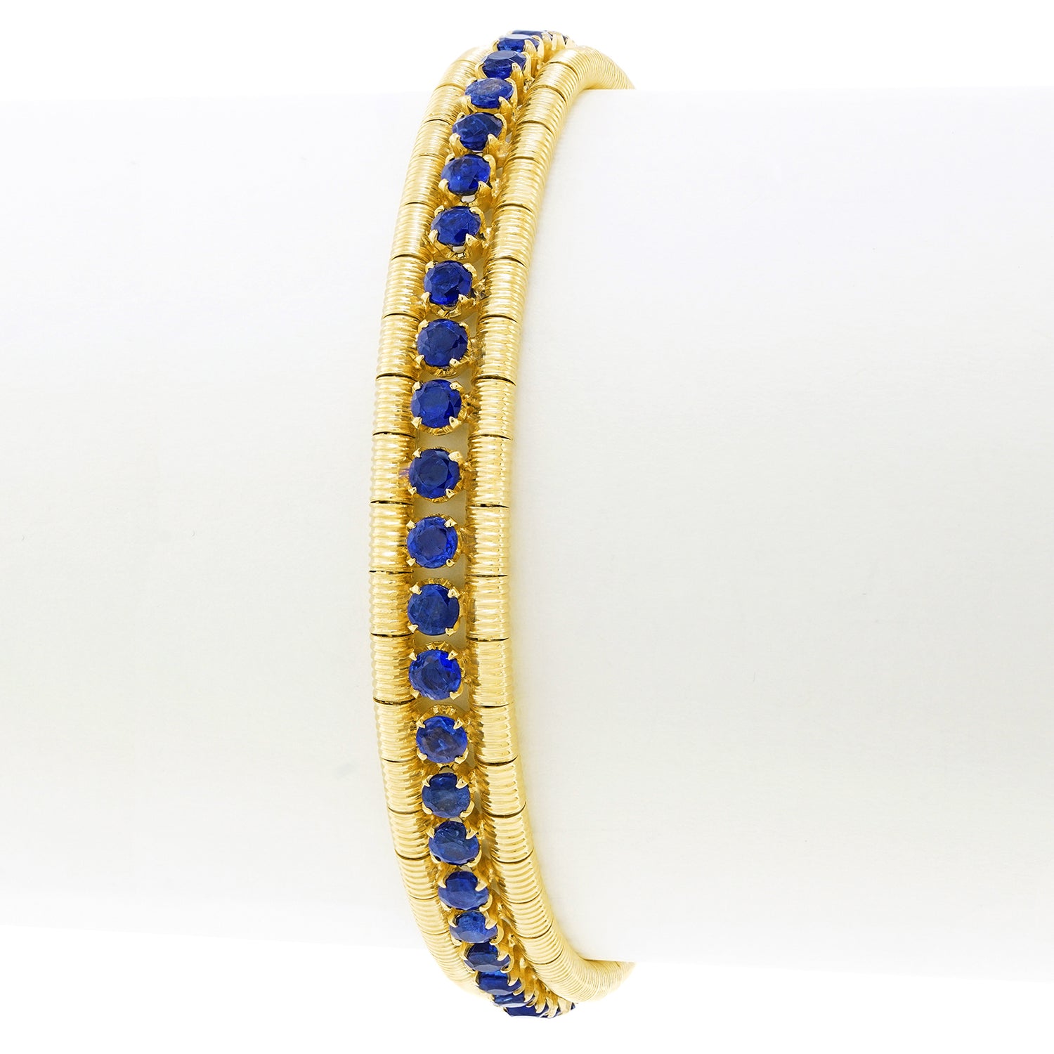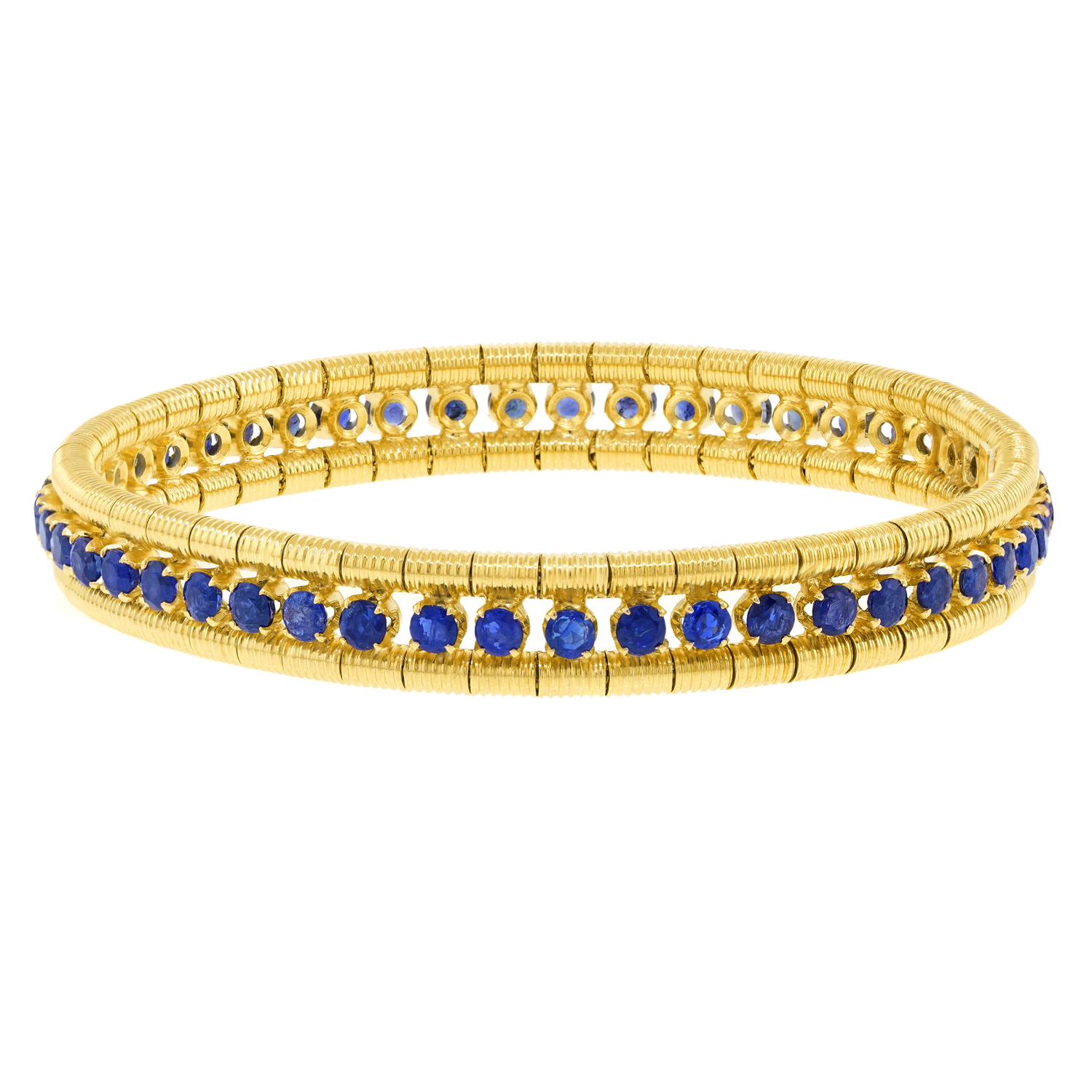 Circa 1960s, 18k, Italy. Stylishly sixties, this flexible Italian bracelet looks and feels amazing! Featuring 8.0 carats of intense blue sapphires set in polished and textured eighteen karat yellow gold, meticulous fabrication completes the visual narrative. Excellent condition.