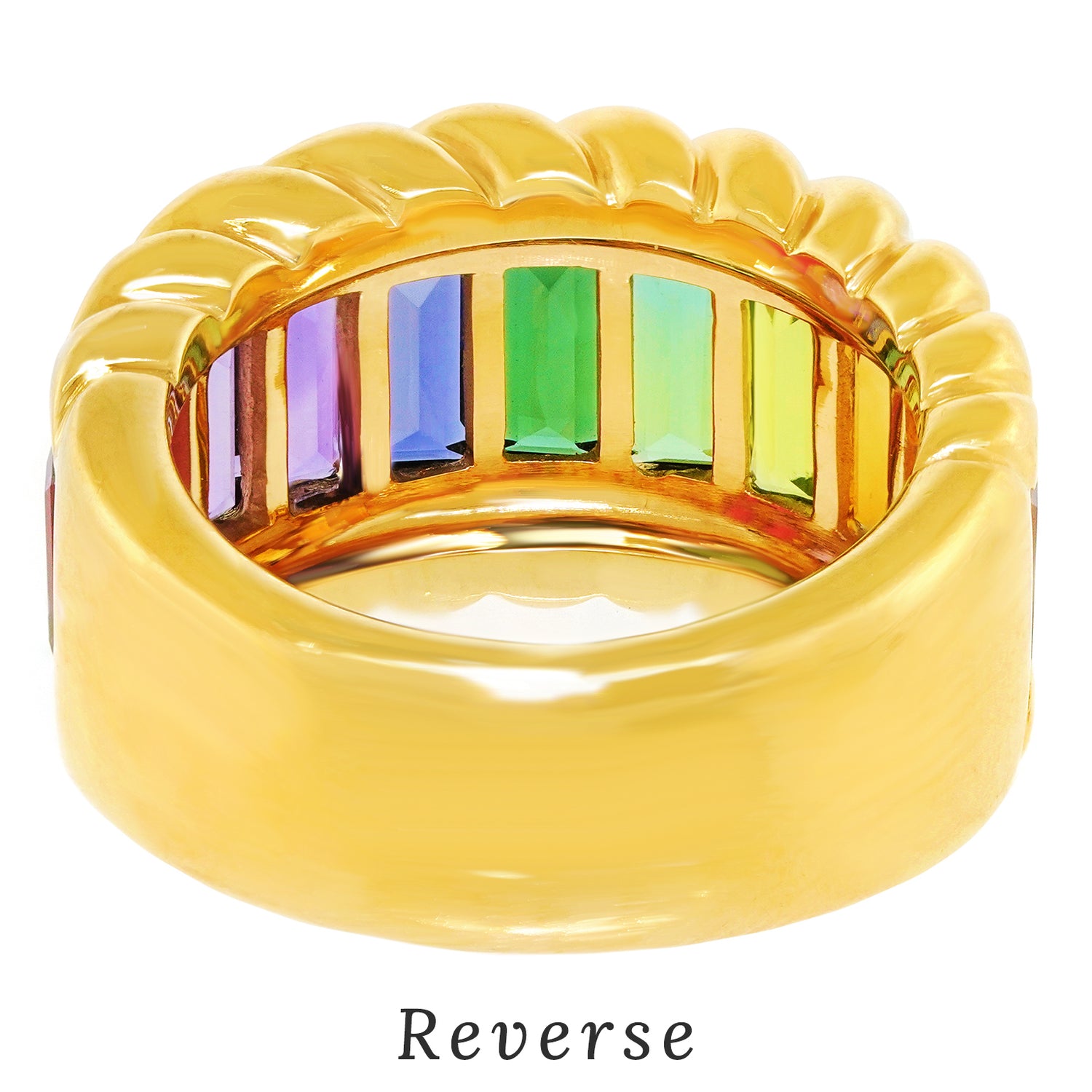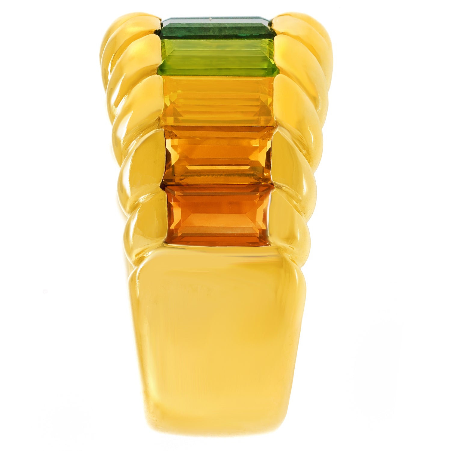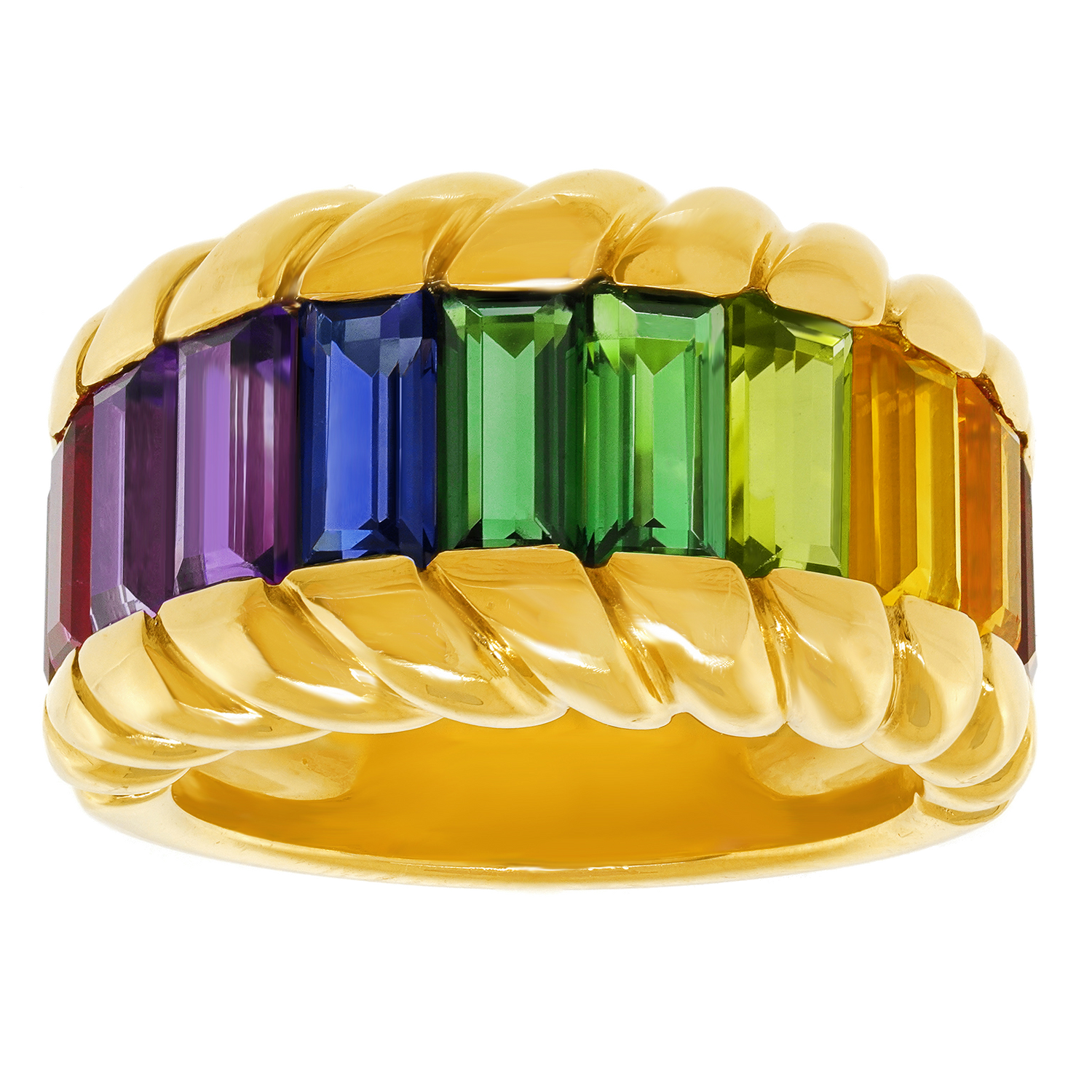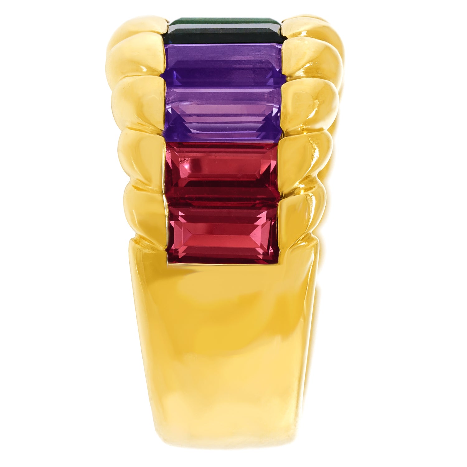 Circa 1980s, 18k, by Gubelin, Switzerland. This delightful 18k Swiss rainbow ring features 5.0 carats of superb colored stones. The look is pop art eighties at its vintage best. For almost two centuries Gubelin has been renowned for the quality of their colored stones and the visionary design of their jewelry. This ring is an excellent example of their attention to detail and uncompromising commitment to quality. Excellent condition.