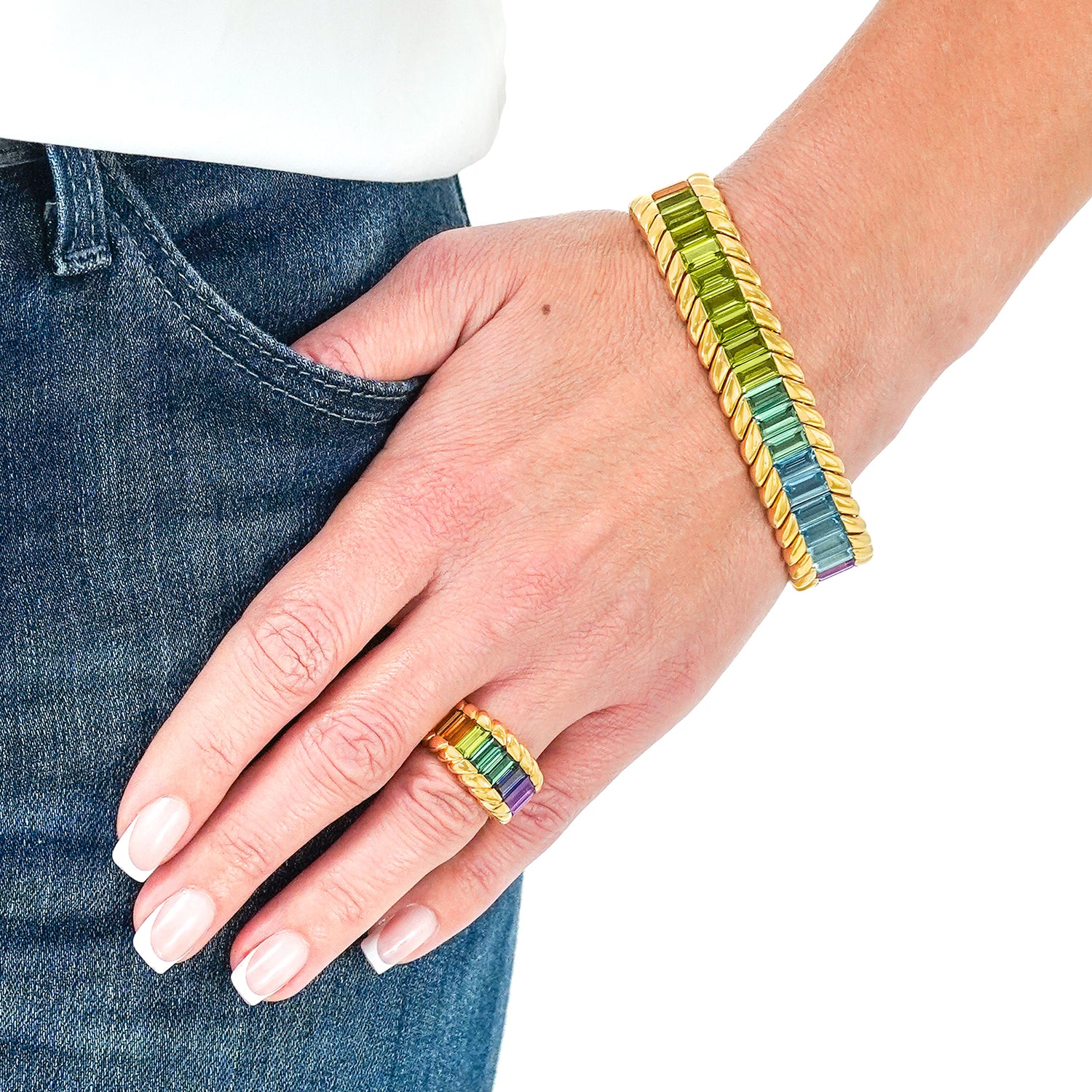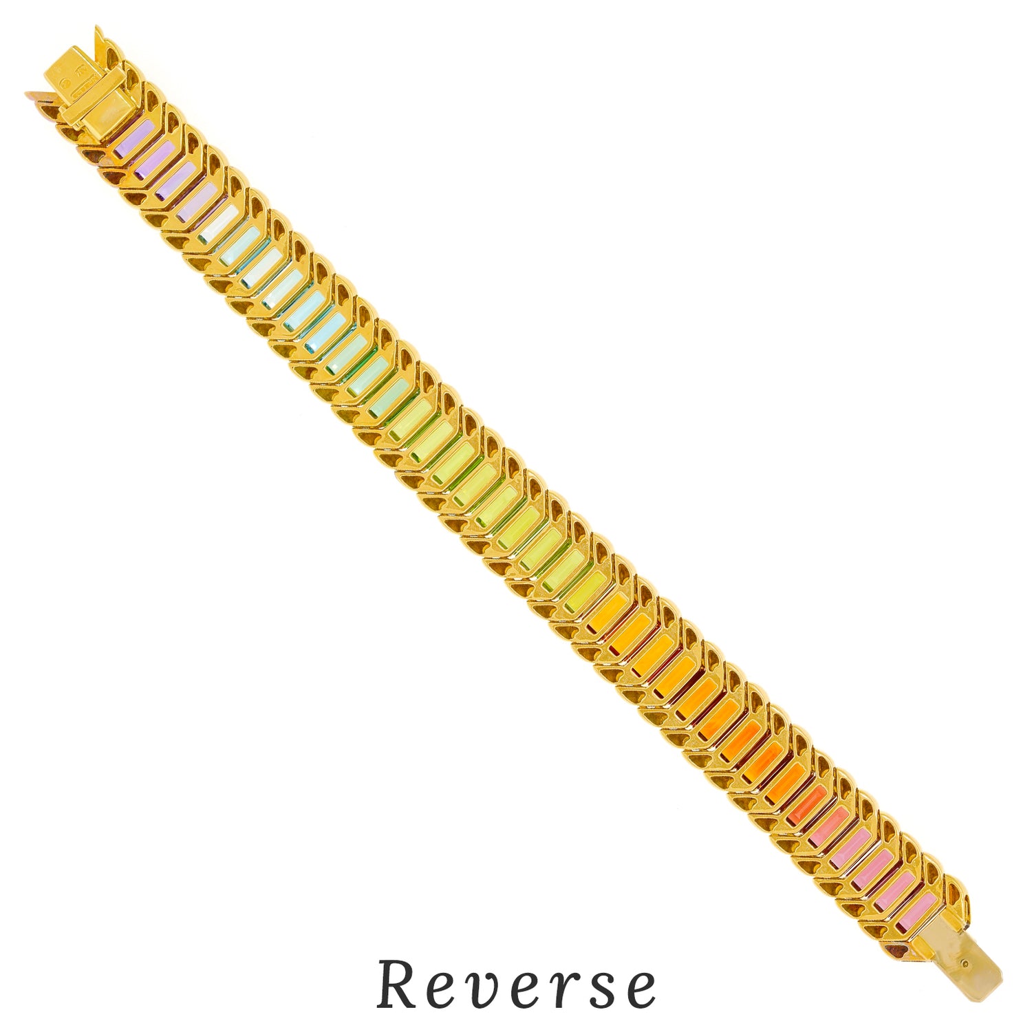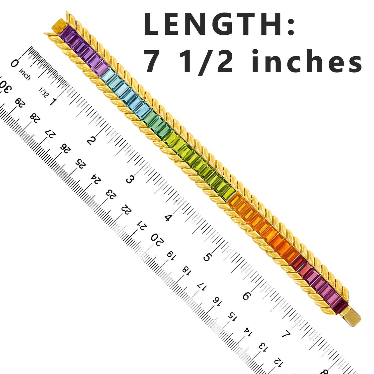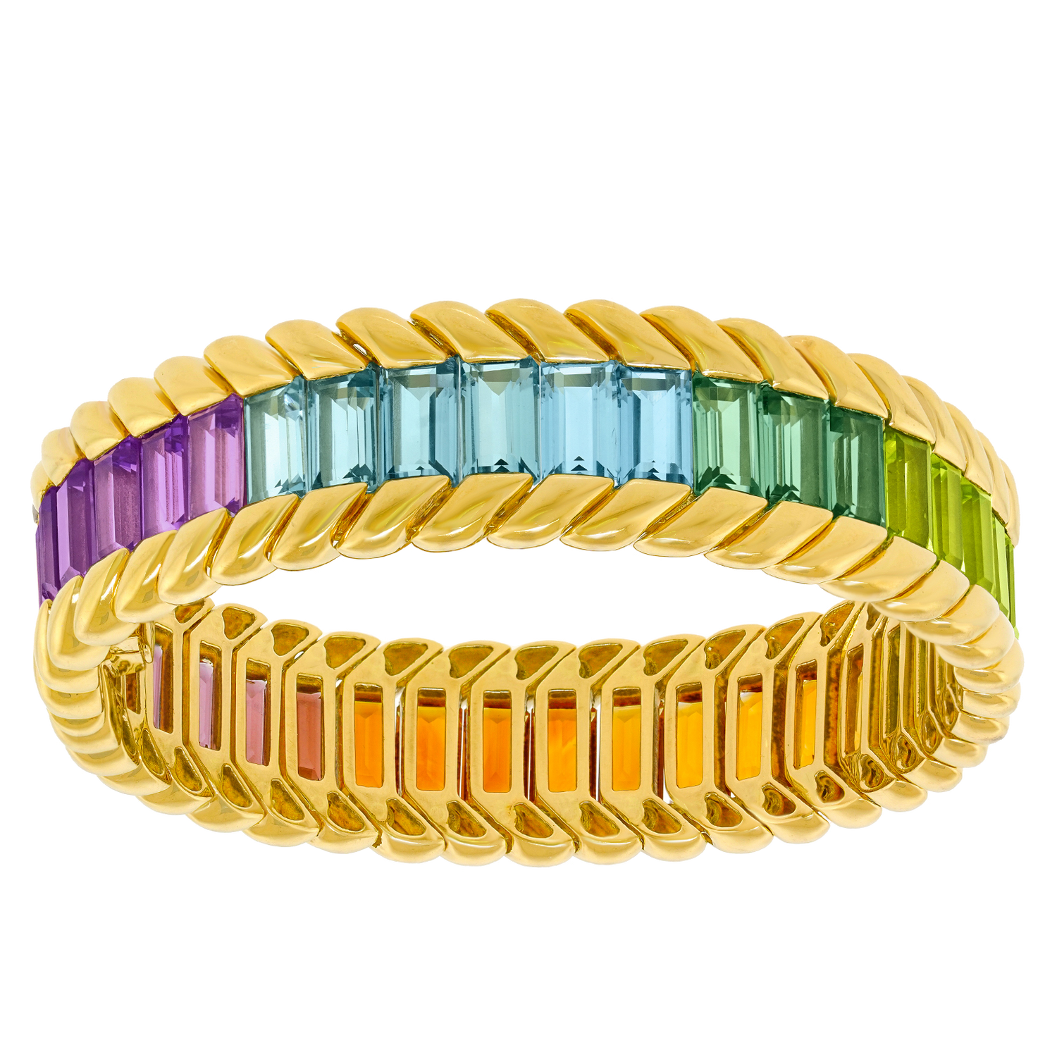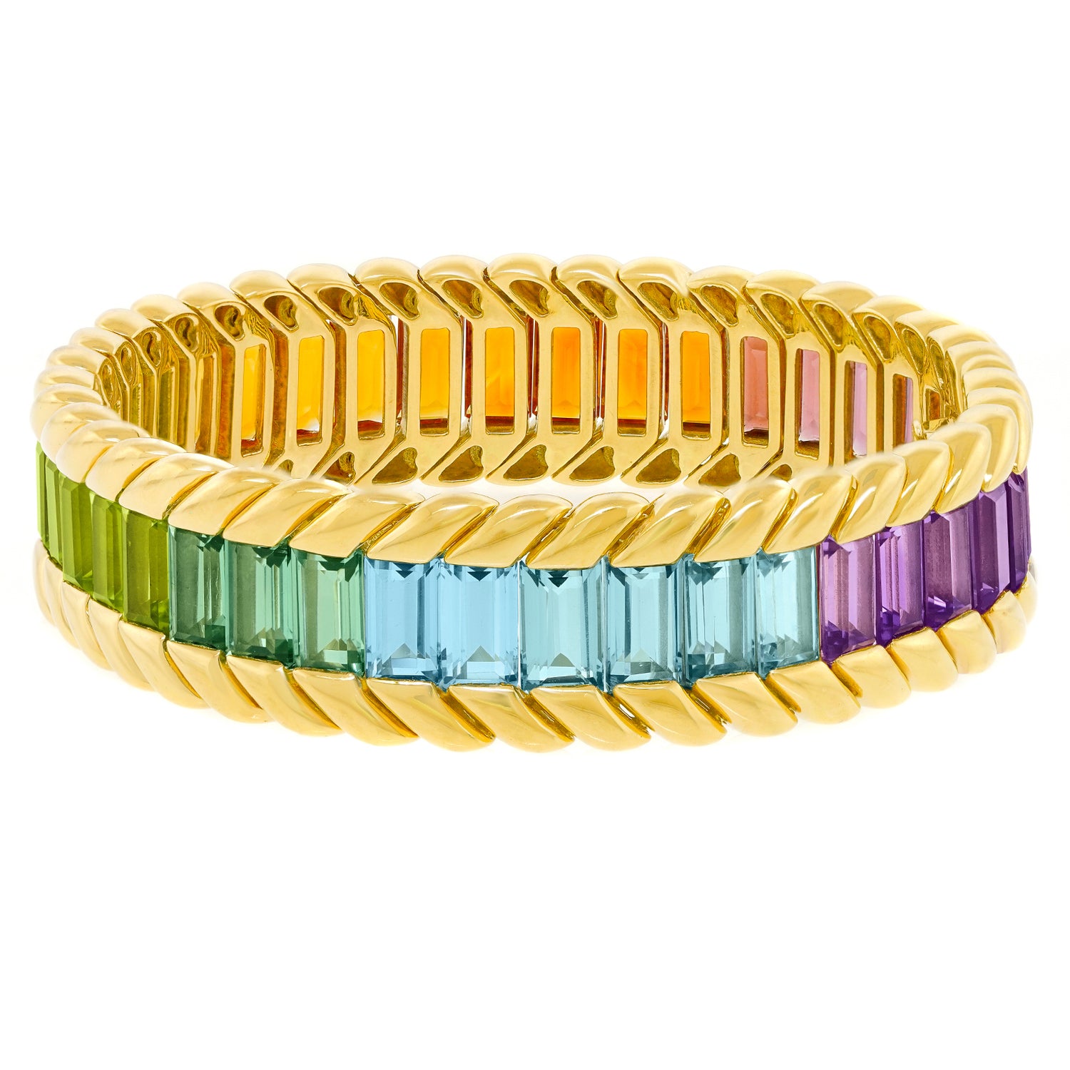 Circa 1980s, 18k, by Gubelin, Switzerland. This delightful 18k Swiss rainbow bracelet features 35.0 carats of superb colored stones. The look is pop art eighties at its vintage best. For almost two centuries Gubelin has been renowned for the quality of their colored stones and the visionary design of their jewelry. This bracelet is an excellent example of their attention to detail and uncompromising commitment to quality. Excellent condition.