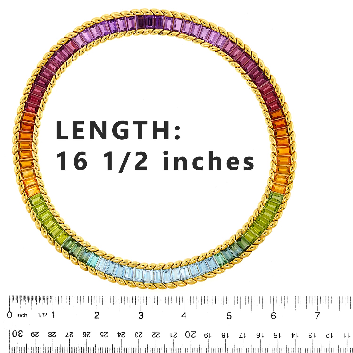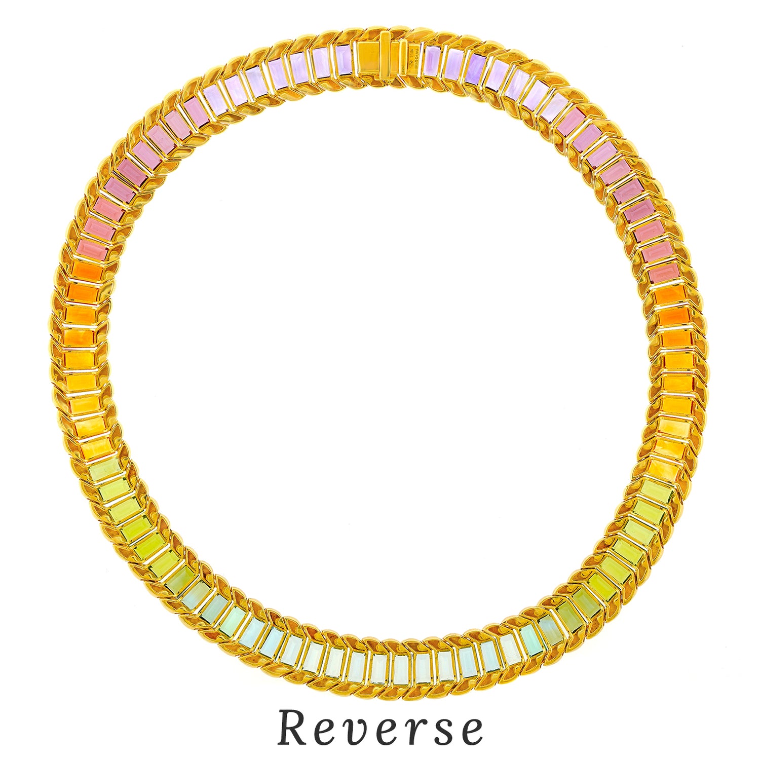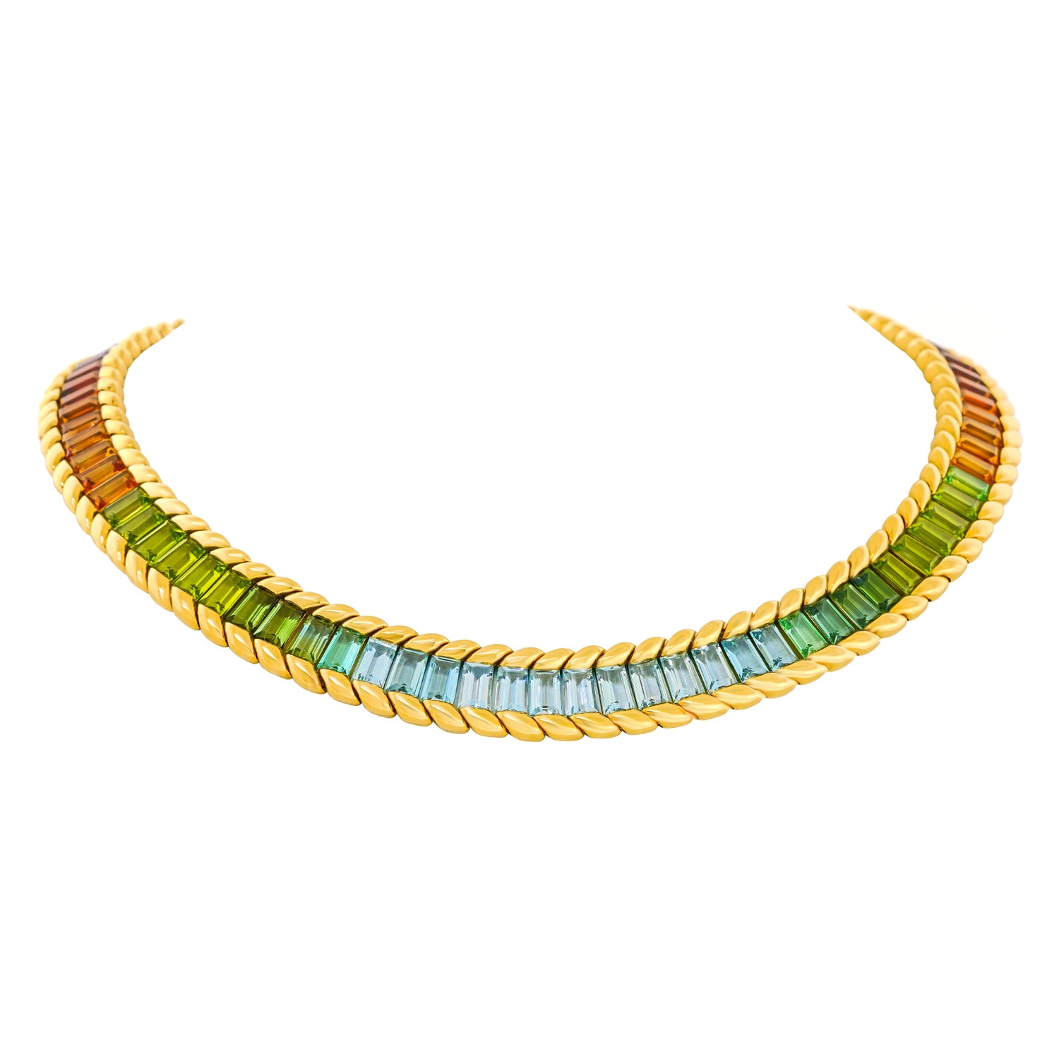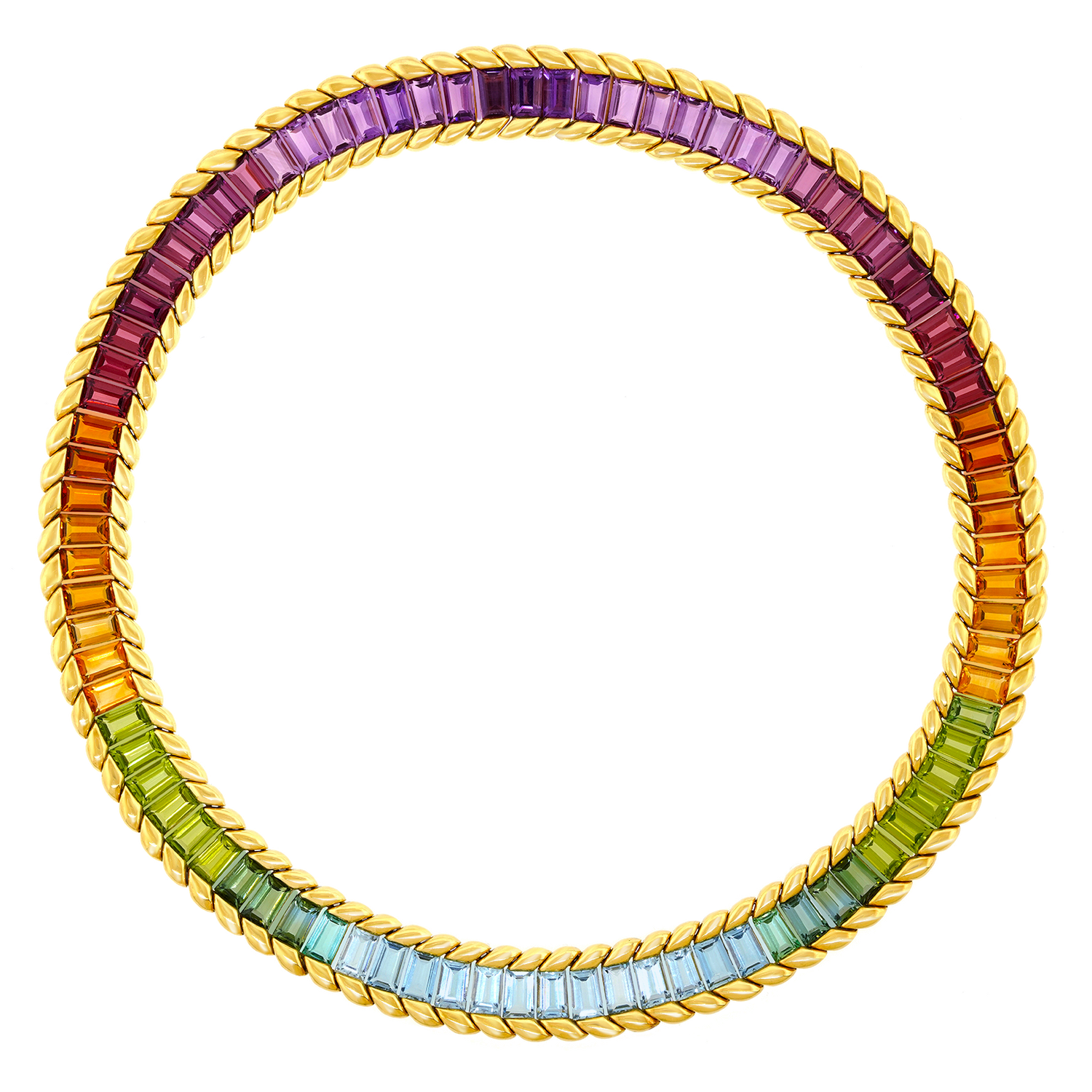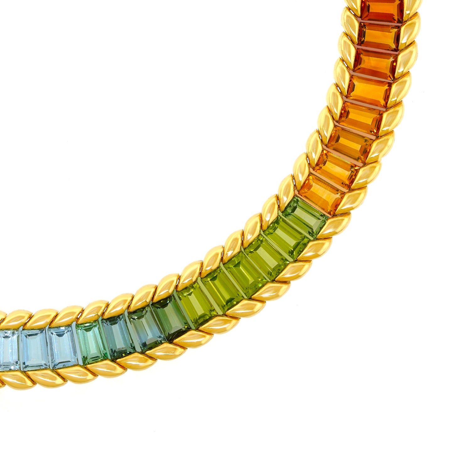 Circa 1980s, 18k, by Gubelin, Switzerland. This delightful 18k Swiss rainbow necklace features 80.0 carats of superb colored stones. The look is pop art eighties at its vintage best. For almost two centuries Gubelin has been renowned for the quality of their colored stones and the visionary design of their jewelry. This necklace is an excellent example of their attention to detail and uncompromising commitment to quality. Excellent condition.