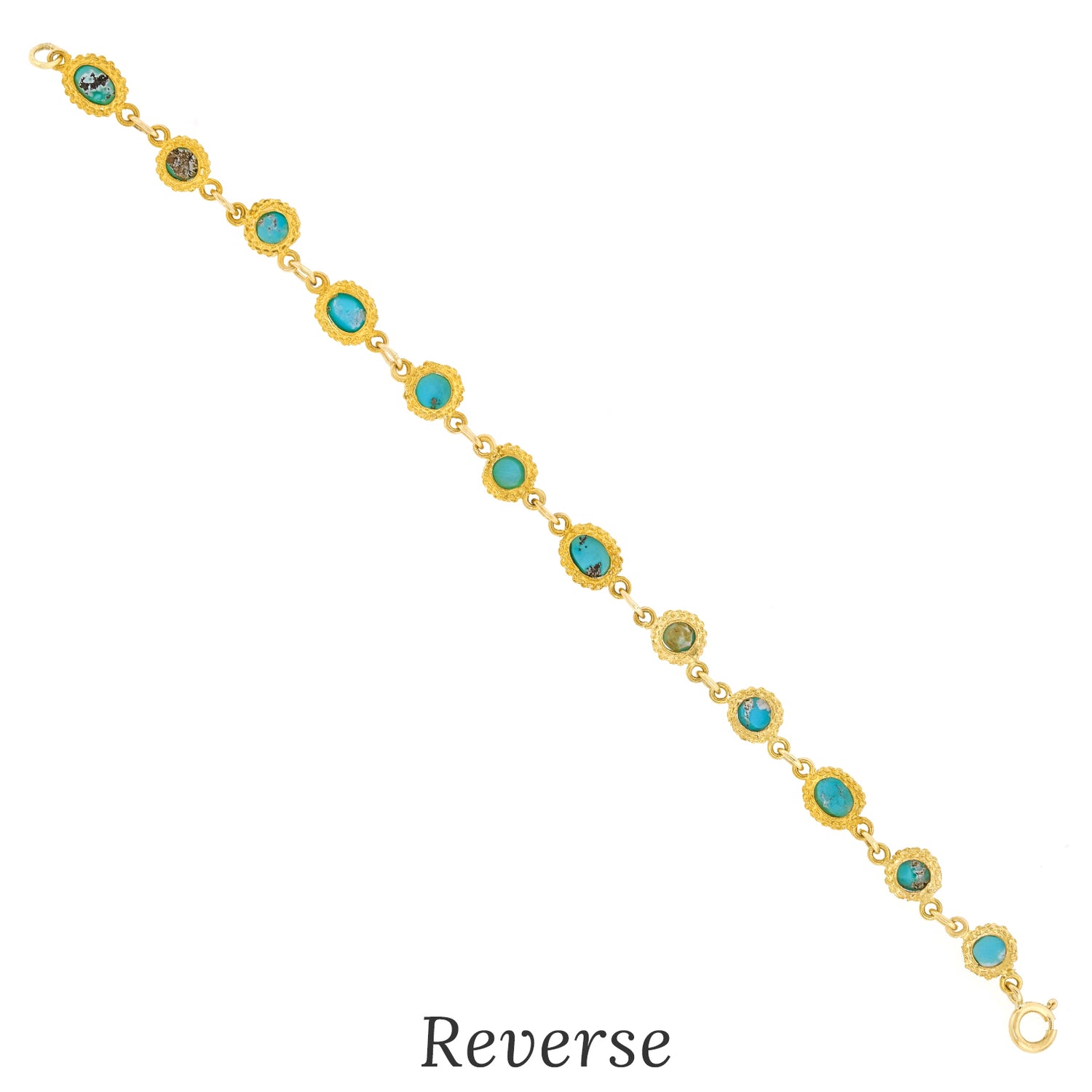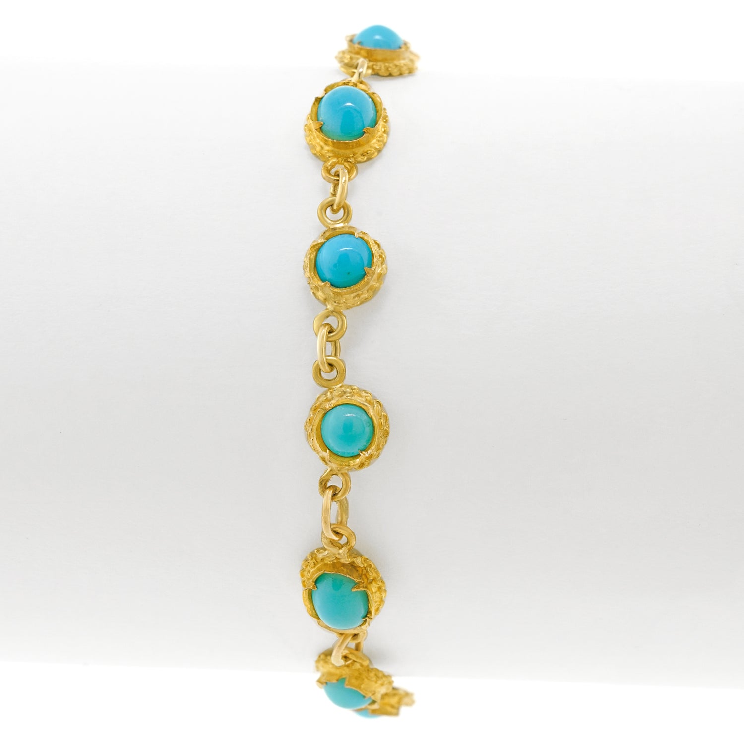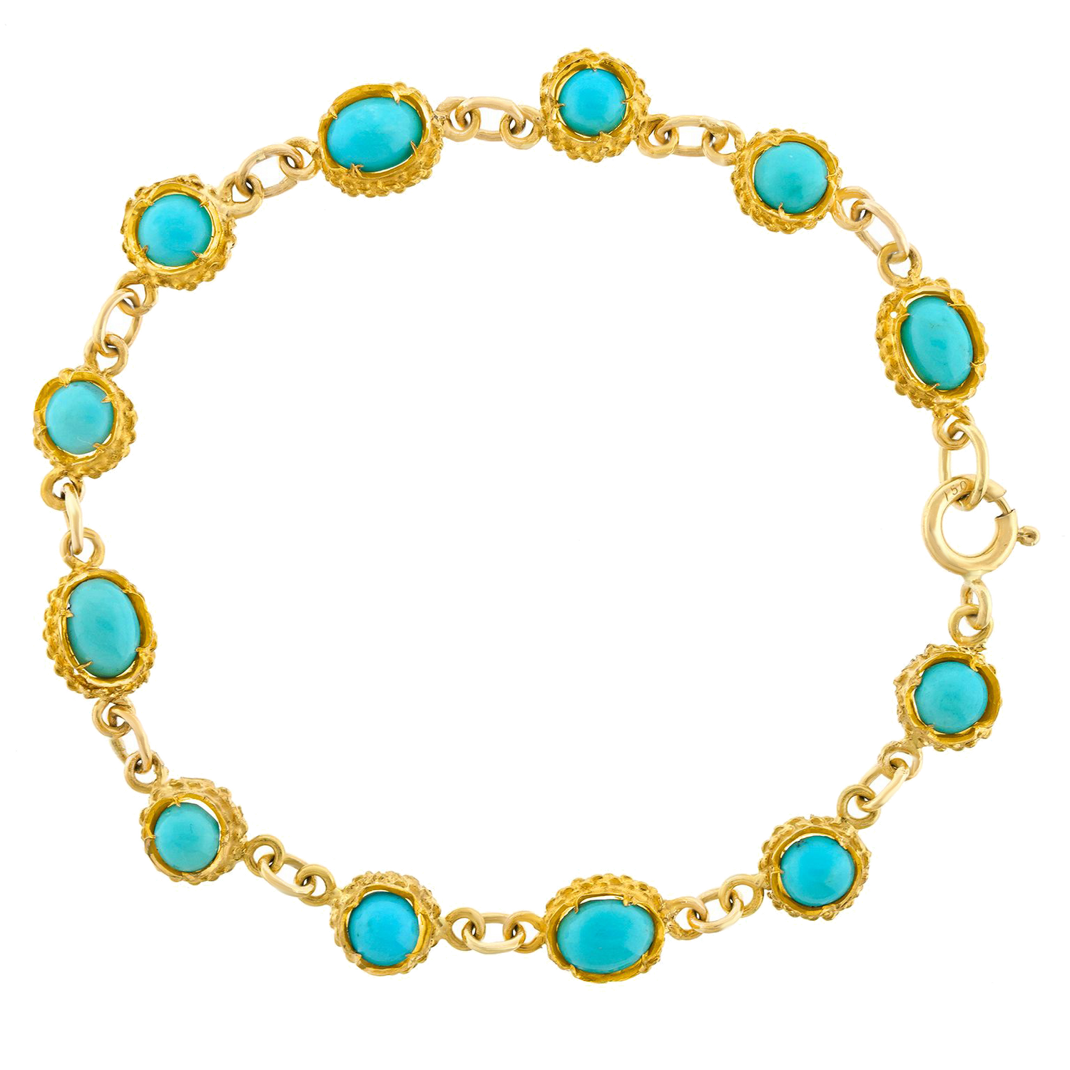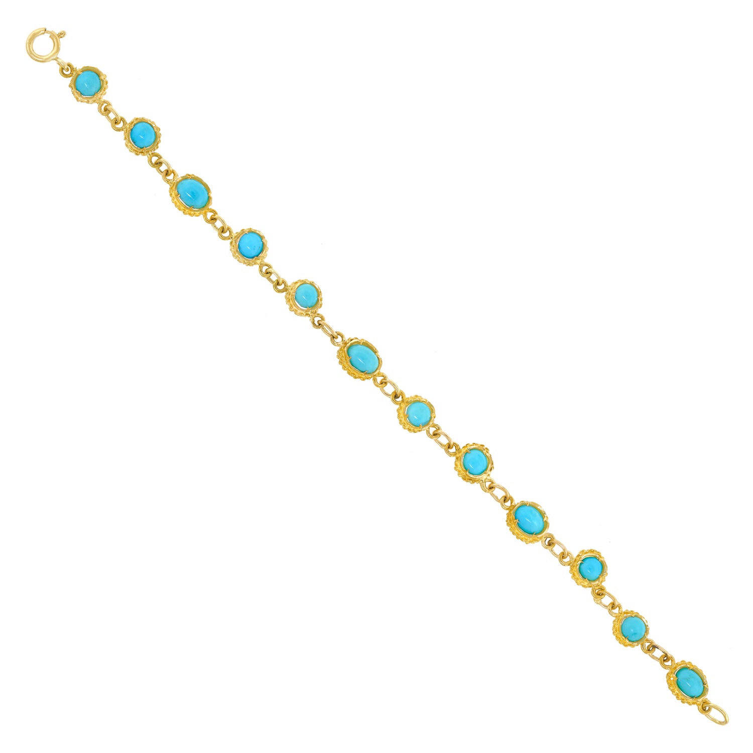 Circa 1960s, 18k, Eastern Europe. This sixties turquoise and 18k bracelet is bright and cheerful! The Persian turquoise cabochons are beautifully hued and evenly matched. Dressed up or down, the look is one-of-a-kind sixties Bohemian chic. Finely fabricated in eighteen-karat yellow gold, this jewel is in excellent condition.