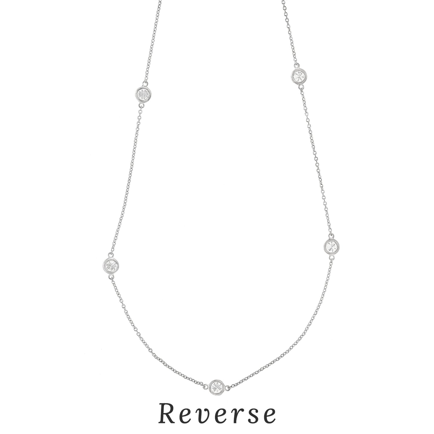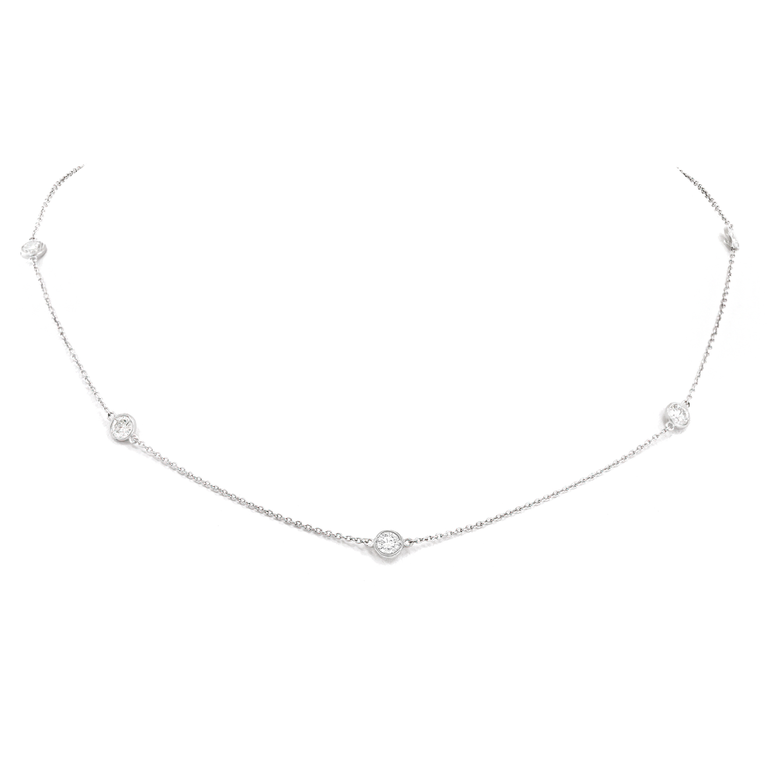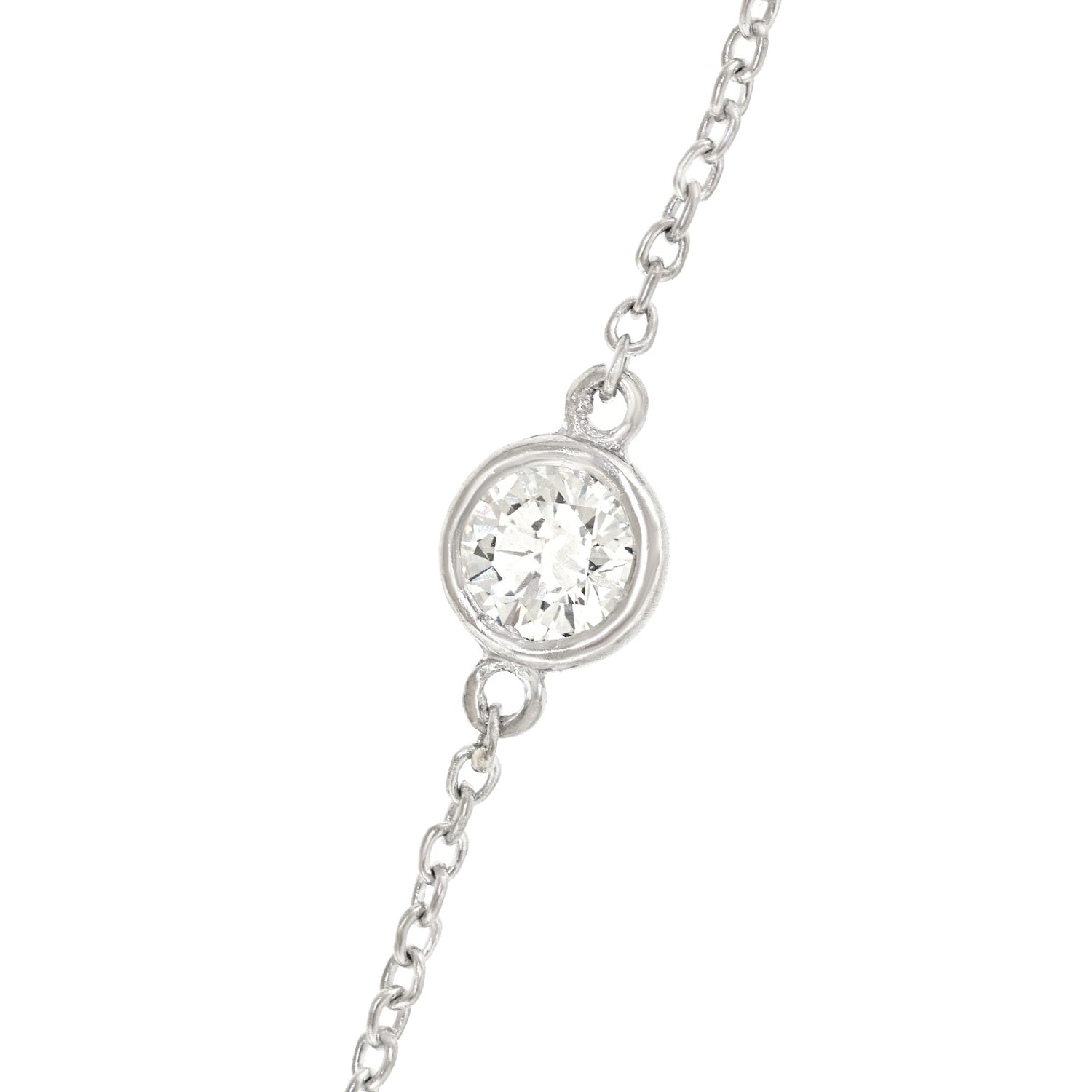 Circa 2000s, Platinum, by Elsa Peretti for Tiffany & Co., New York.  Diamonds by the Yard is one of Elsa Peretti's most iconic designs for Tiffany. Infinitely wearable at sixteen and a half inches long and set with 1.25 carats of fine white diamonds (5 Stones, F color VS clarity), this platinum necklace is gorgeous. Well-made to Tiffany's high standards, it is in excellent condition.