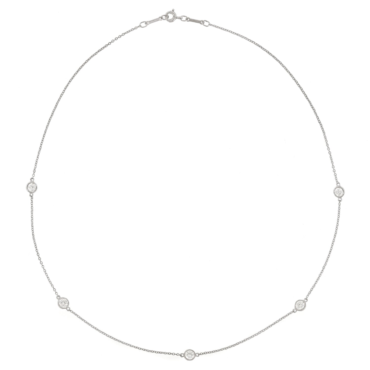Circa 2000s, Platinum, by Elsa Peretti for Tiffany & Co., New York. Diamonds by the Yard is one of Elsa Peretti's most iconic designs for Tiffany. Infinitely wearable at sixteen and a half inches long and set with 1.25 carats of fine white diamonds (5 Stones, F color VS clarity), this platinum necklace is gorgeous. Well-made to Tiffany's high standards, it is in excellent condition.