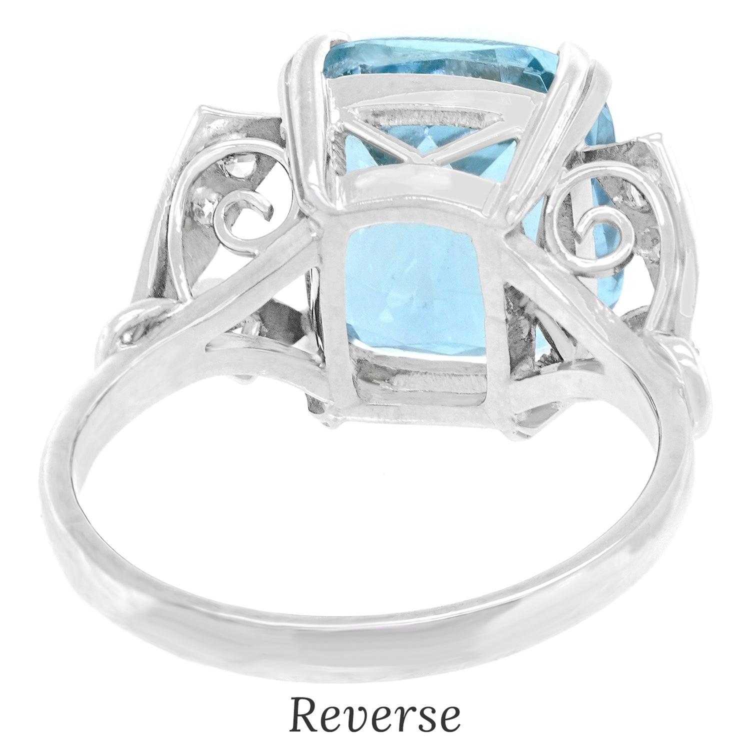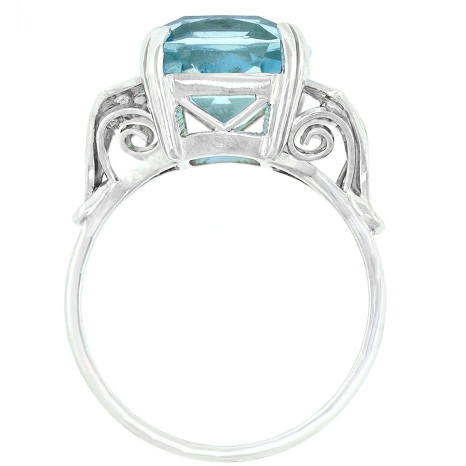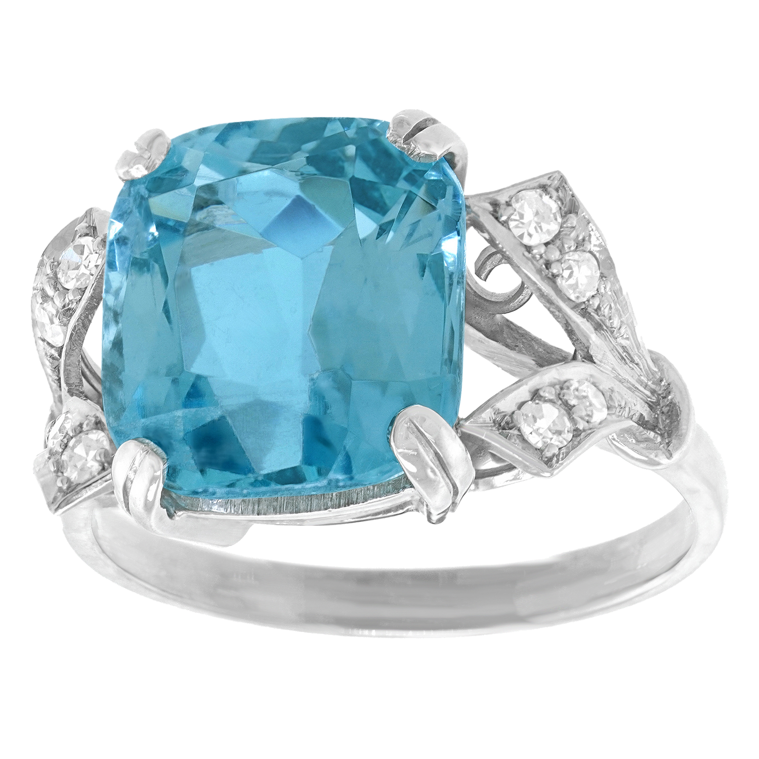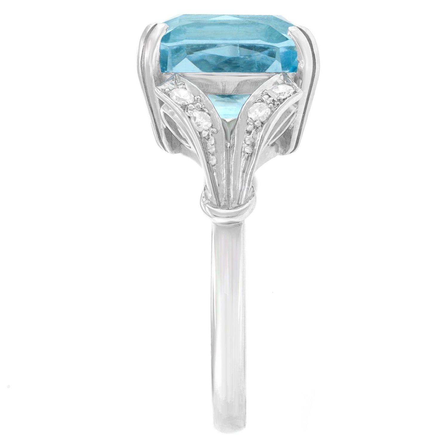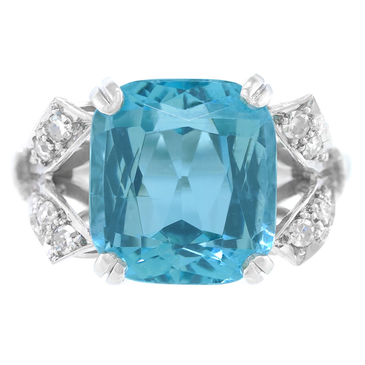 Circa 1950s, Platinum. This gorgeous fifties ring is set with a fine blue 4.0-carat aquamarine completed by brilliant white diamonds (H color, VS clarity). Its details have all the charm of the jewelry of the 1950s. Meticulously fabricated in platinum, this fabulous ring is in excellent condition.