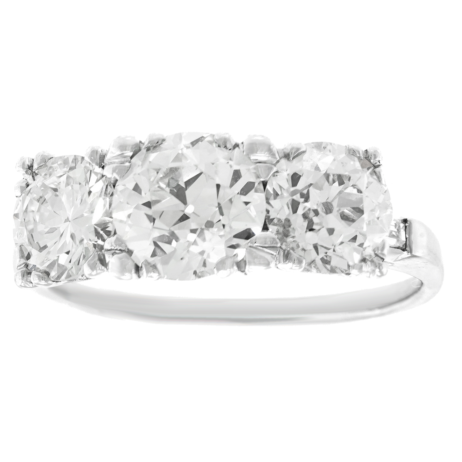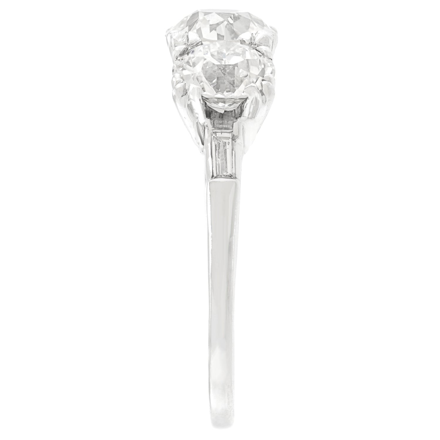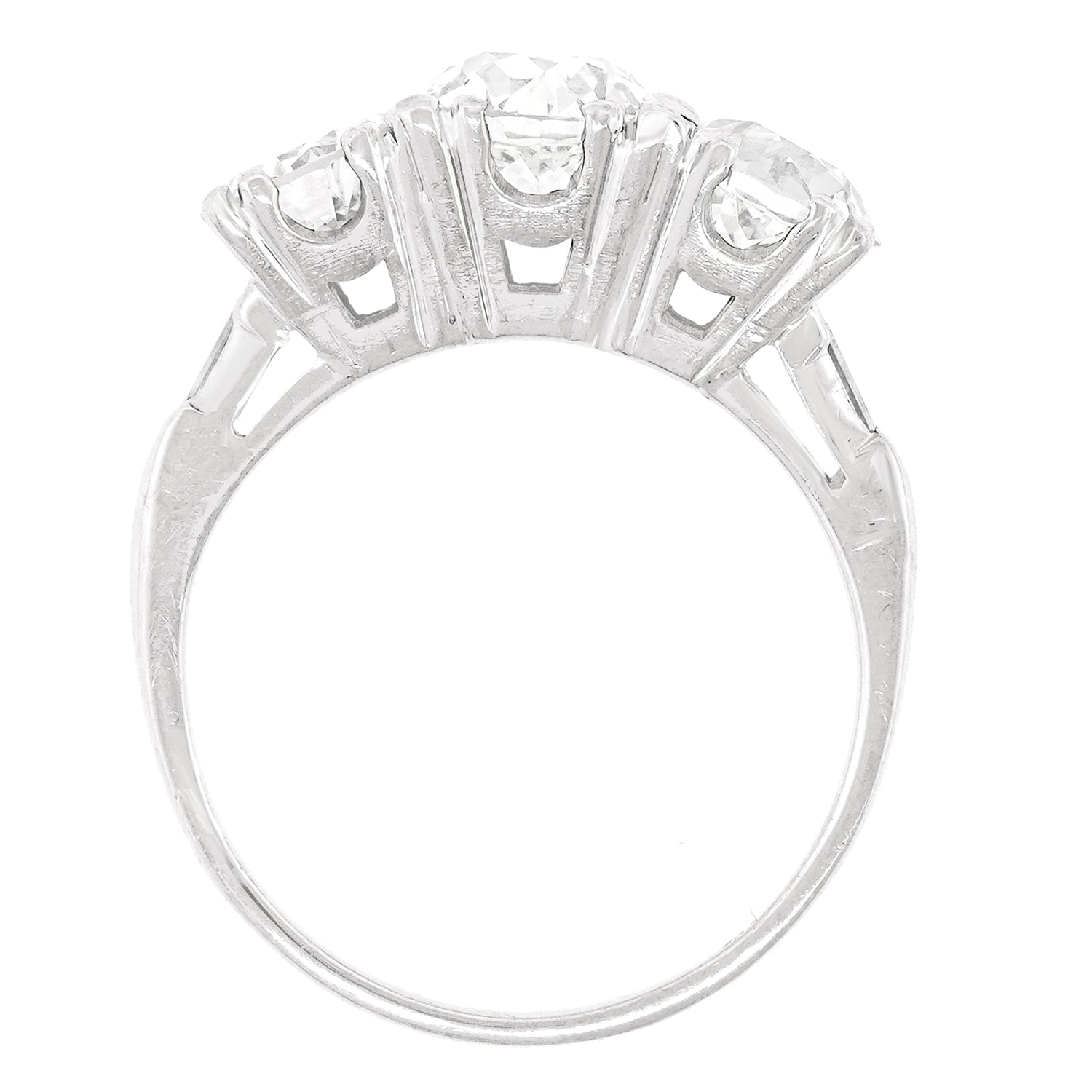 Circa 1930s, 14k, American. Set with three gorgeous diamonds, this stylish thirties ring features a sparkly 1.50-carat center stone (K color, SI1 clarity), an .85-carat diamond (I color, SI1 clarity), and a 1.0-carat diamond (J color, SI1 clarity). This Art Deco ring is all about sparkle and flash! Period rings have a matchless vintage chic look. Excellent condition.