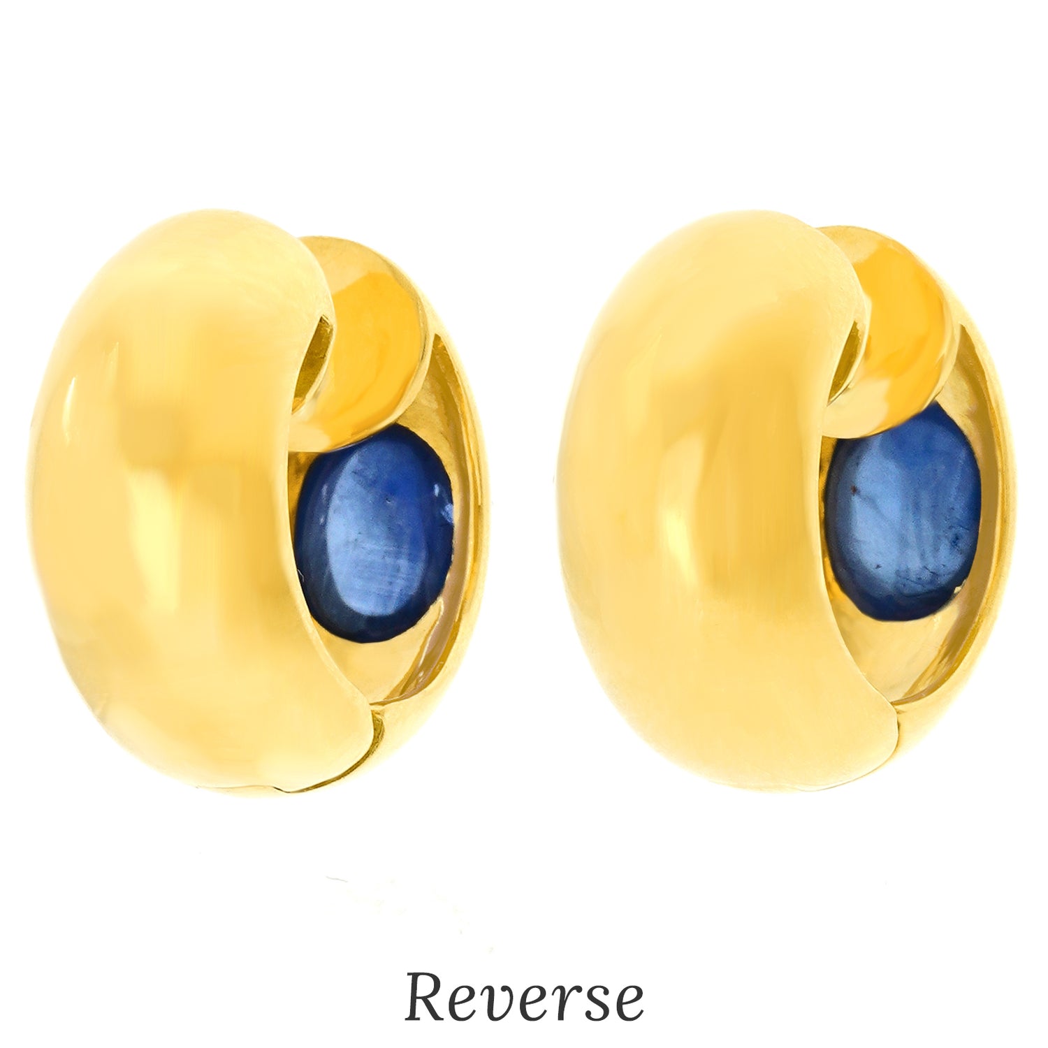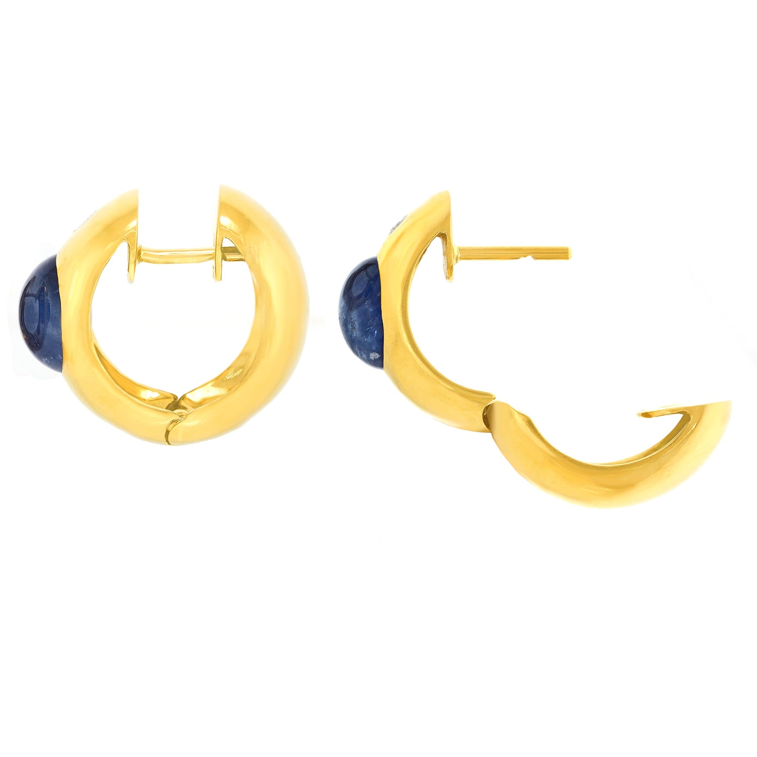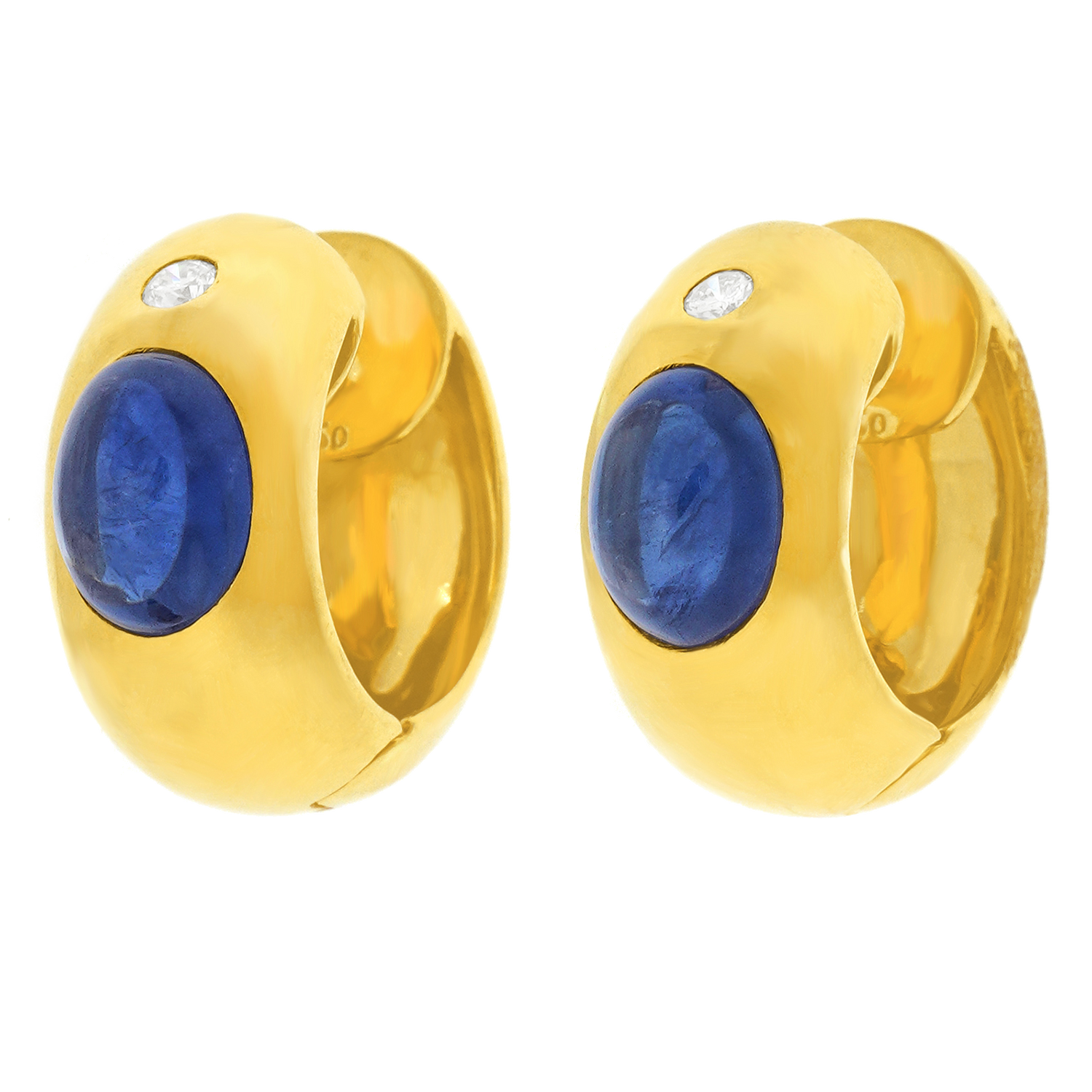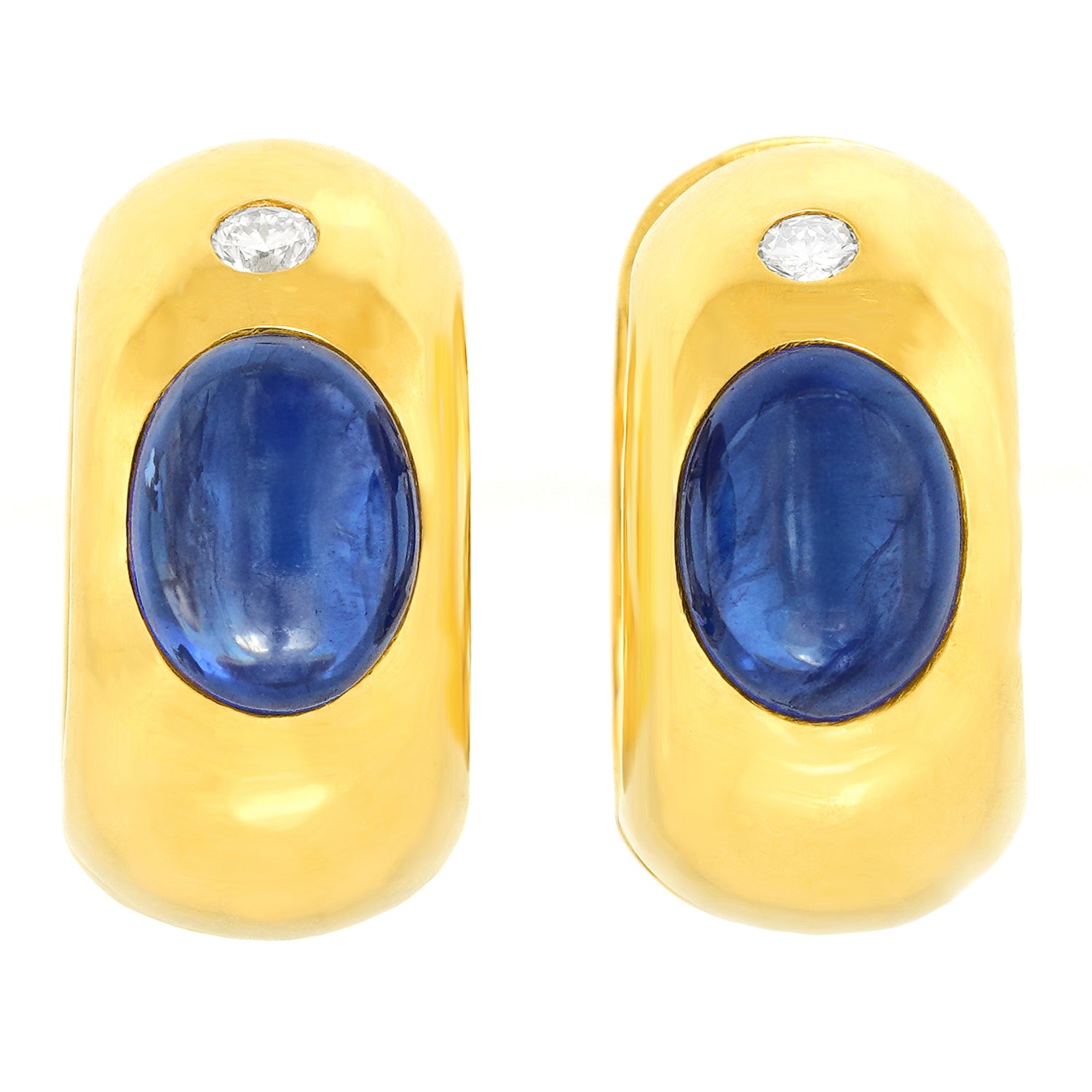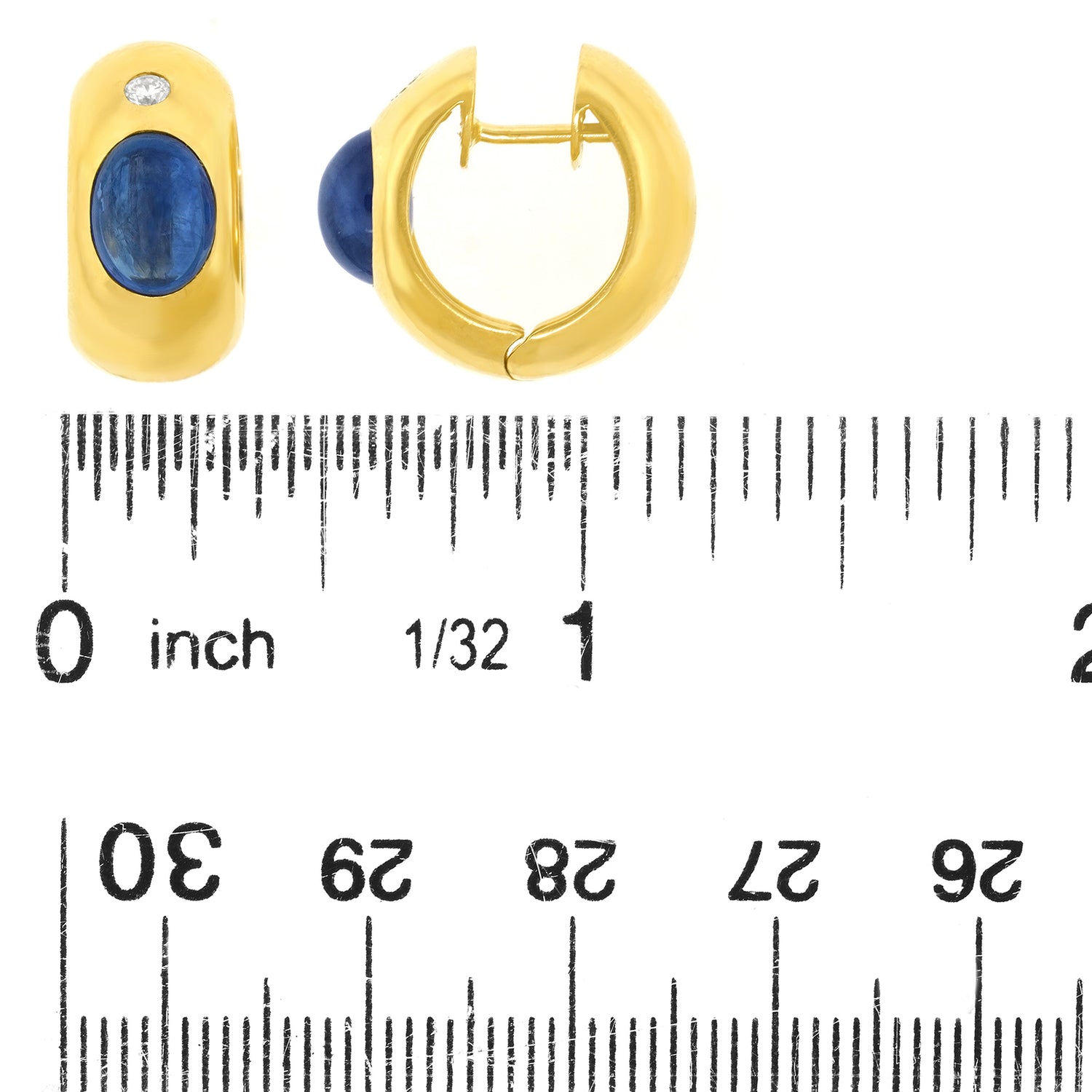 Circa 1990s, 18k, Swiss. These elegant nineties earrings feature two luminescent 1.0-carat sapphire cabochons set in polished yellow gold, with an accent diamond above each sapphire. The look is classic contemporary, underscored by fabulous color. Meticulously fabricated, they are in excellent condition.