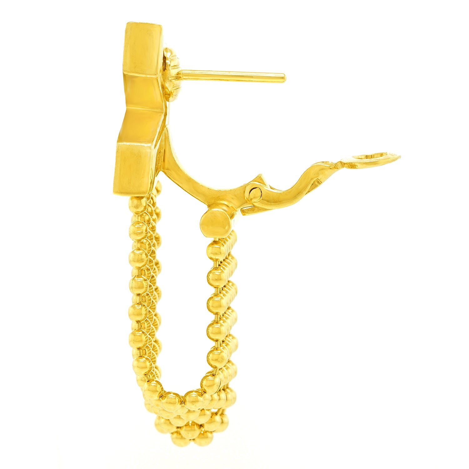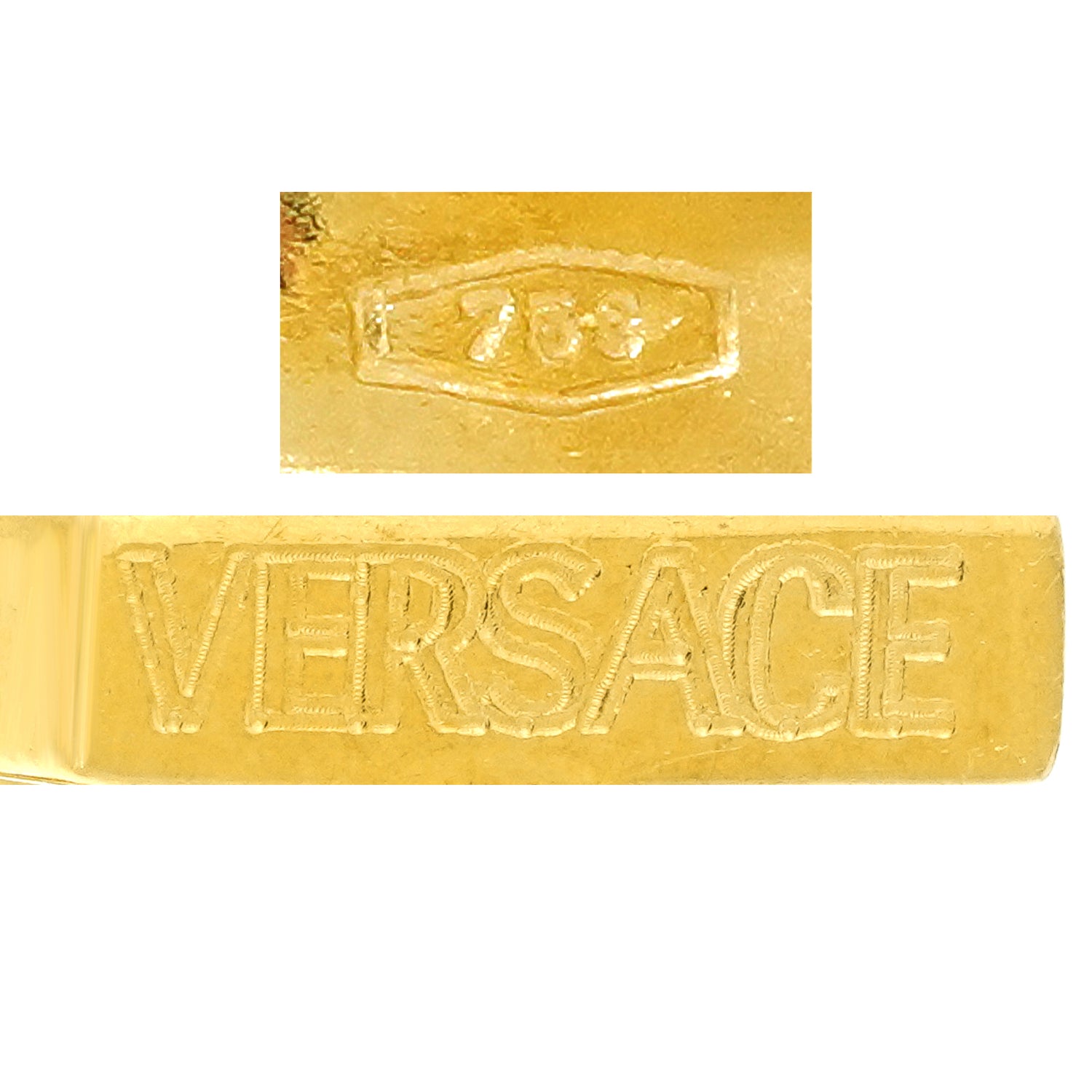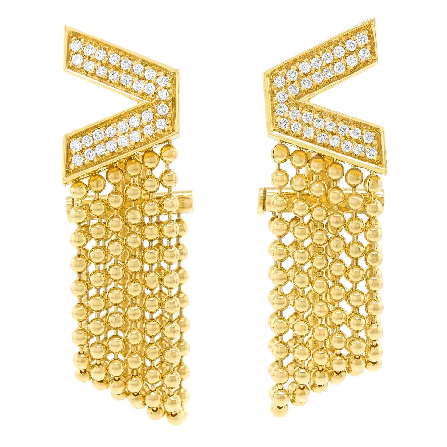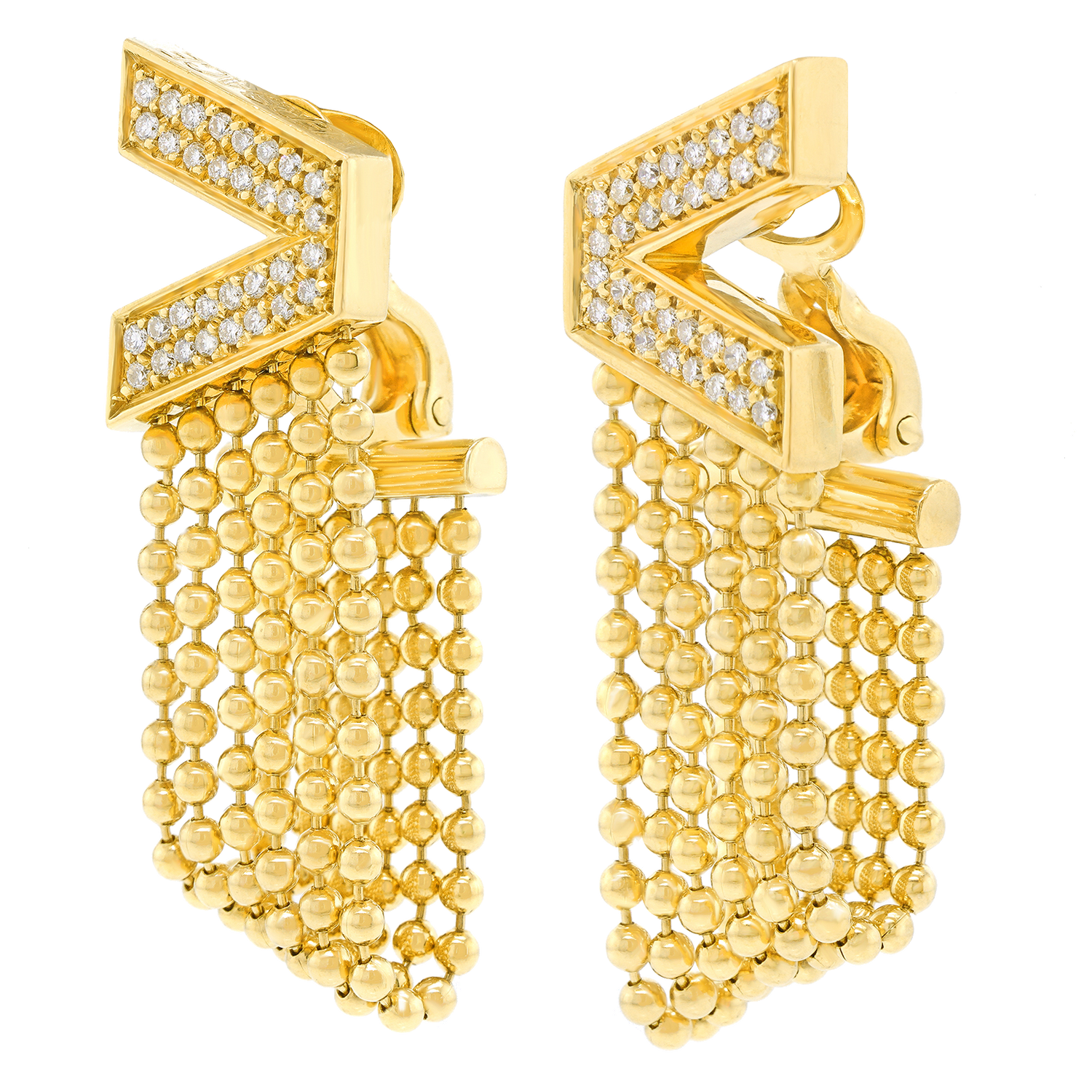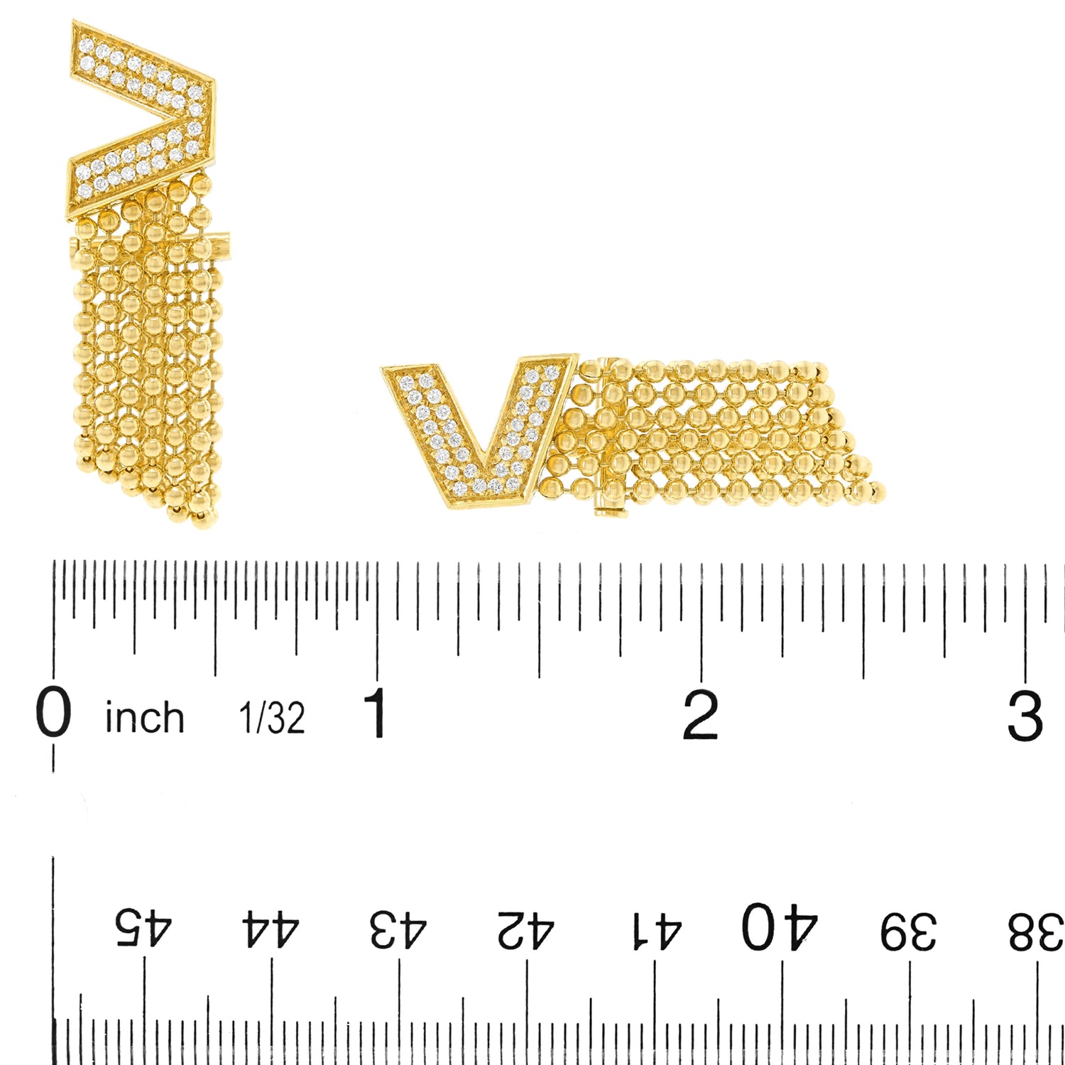 Circa 1990s, 18k, by Versace, Italy. These fabulous fine jewelry earrings by Versace are a fashionista's dream… a rare find! The designer's V is set with .64 carats of fine white diamonds are festooned with playful strands of gold bead chain for a cool visual. Finely fabricated in the Italian tradition and Versace's high standards, they are in excellent condition.