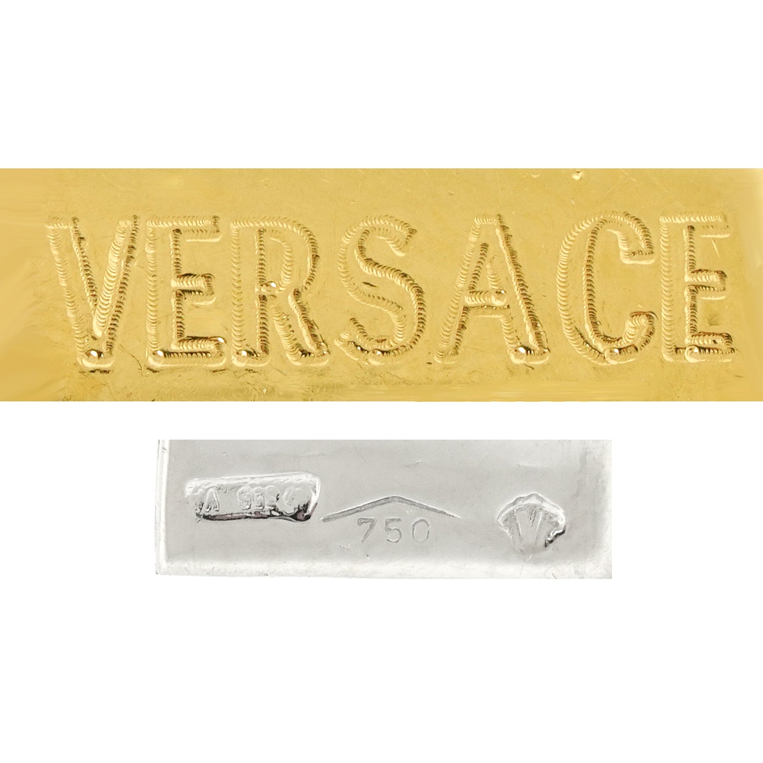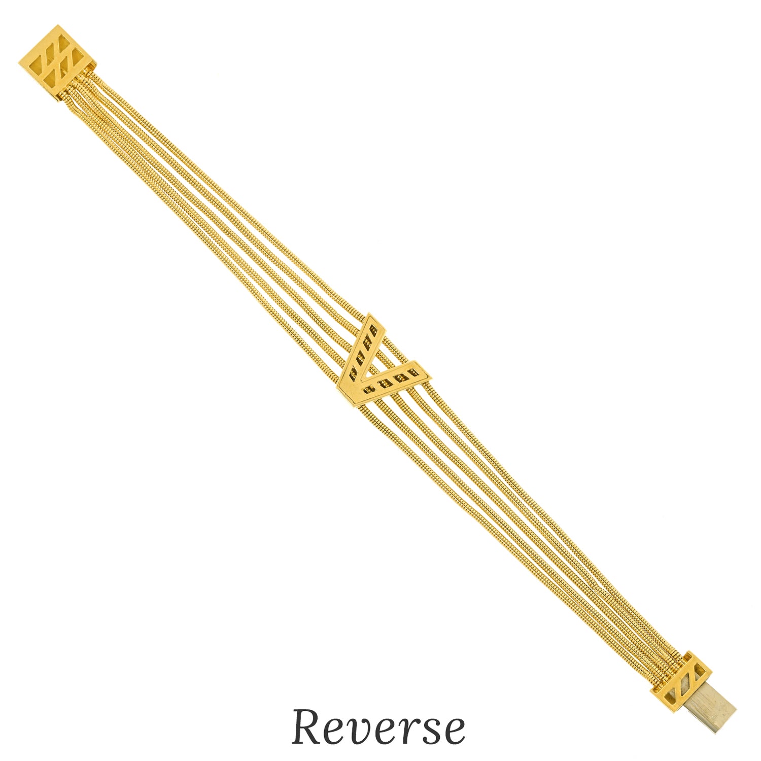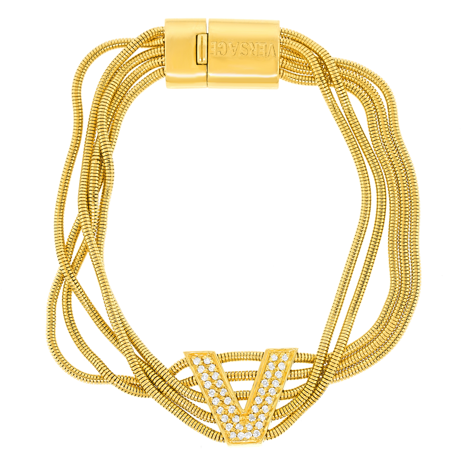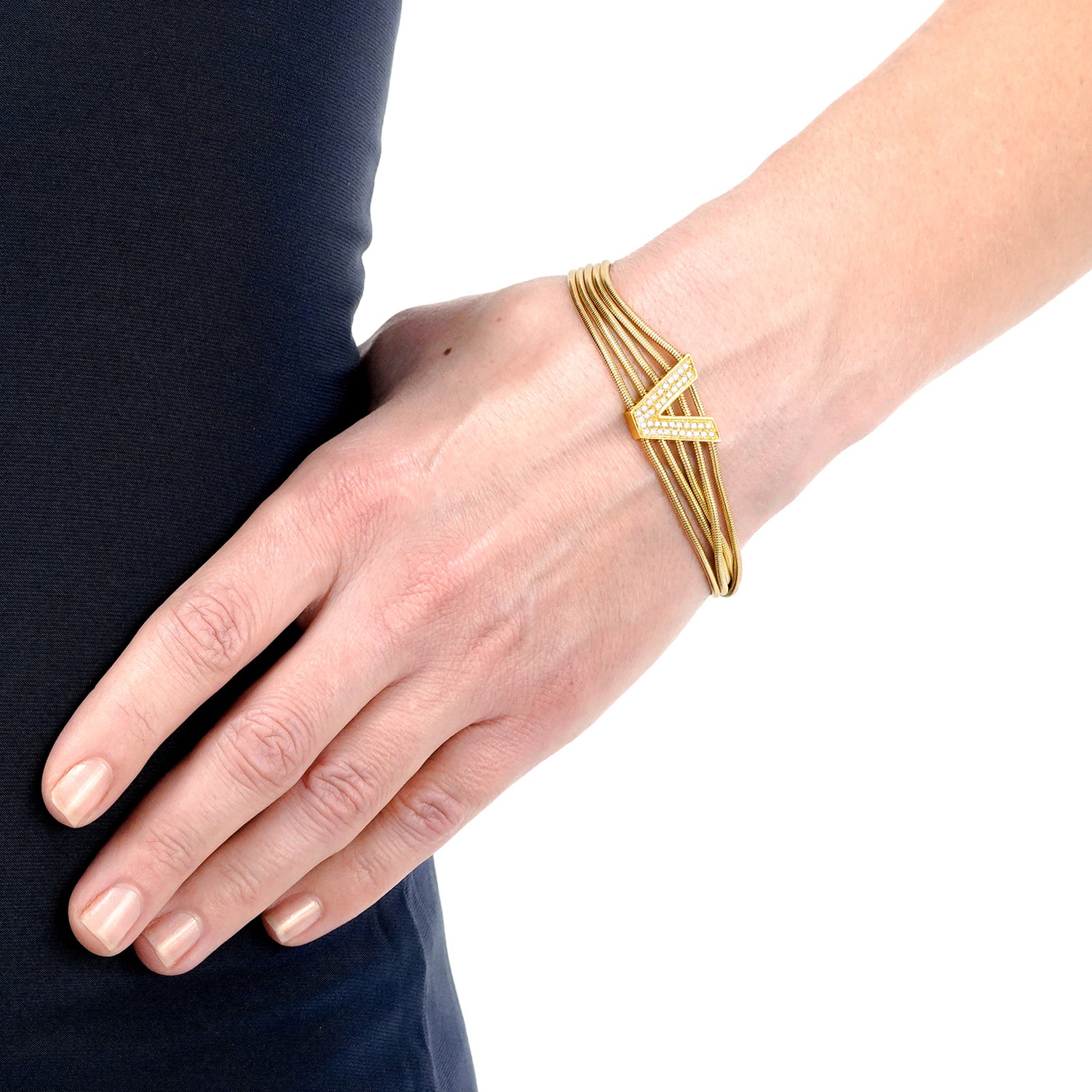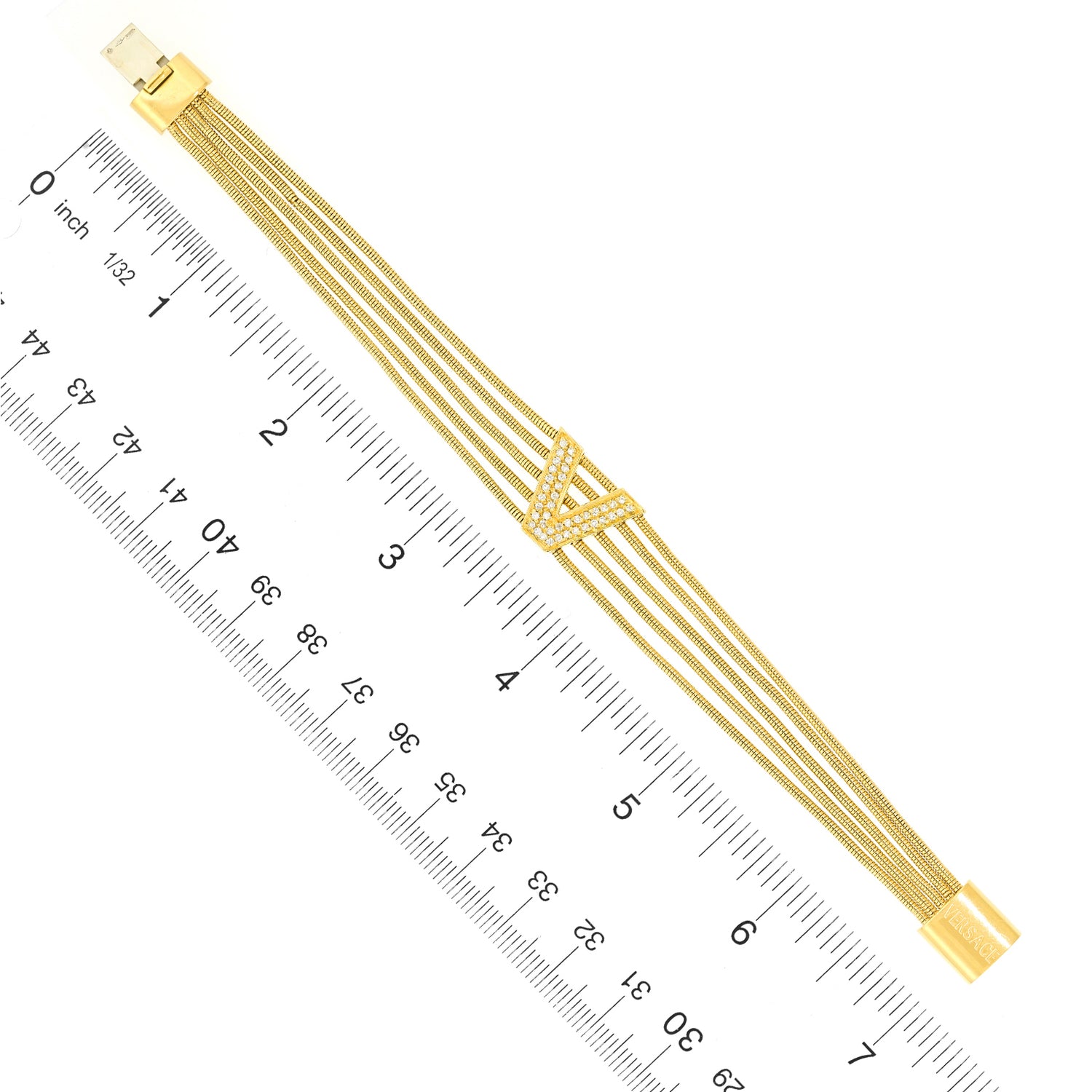 Circa 1990s, 18k, by Versace, Italy. This fabulous fine jewelry bracelet by Versace is a fashionista's dream! The designer V is set with .32 carats of fine white diamonds and sits centered on playful strands of gold snake chain creating cool visuals. Finely fabricated in the Italian tradition of workmanship and Versace's high standard, it is in excellent condition.